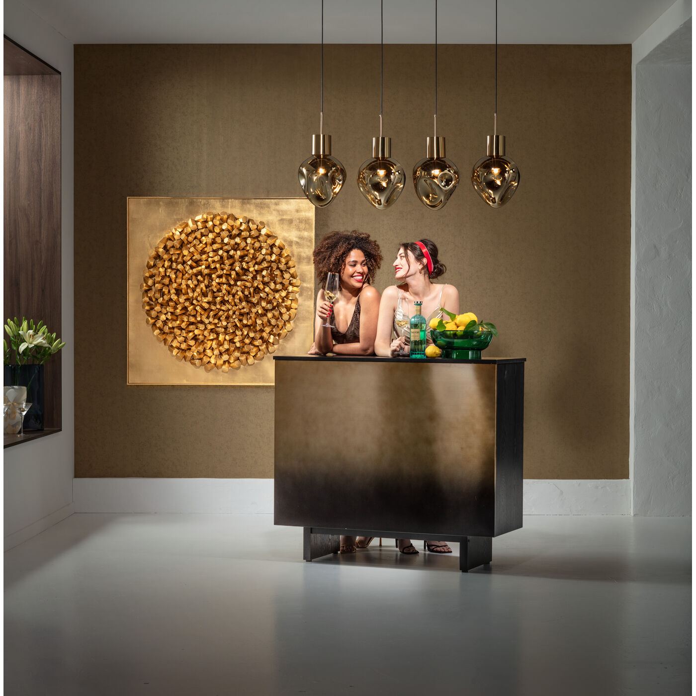 - Die goldfarbenen Lampenfassungen und der Decken-Baldachin sind aus titanbeschichtetem Stahl gefertigt