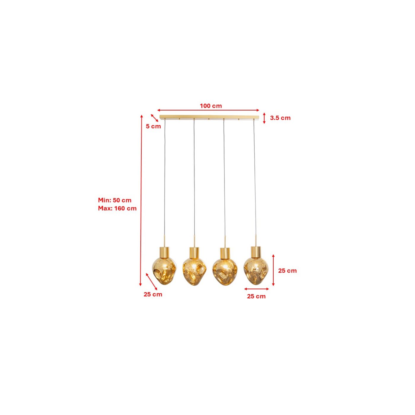 Mit dieser Pendelleuchte bringen Sie nicht nur Licht ins Dunkle, sondern auch Design in Ihr Zuhause. Die organisch geformten Glaskugeln schimmern in einem sanften Goldton, ihre unregelmäßige Formen wirken skulptural. Diese Esszimmer-Lampe ist mit 110cm breit genug, um Ihren Tisch und die gedeckte Tafel in ein glamouröses, weiches Licht zu tauchen. 230 V, 50/60 Hz, Fassung E27, Anzahl Leuchtmittel 4, max. 40 Watt, Leuchtmittel nicht inklusive, Leuchtmittel austauschbar