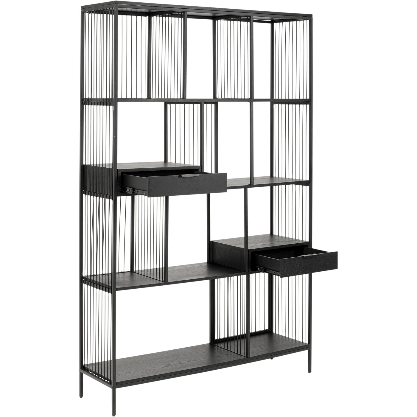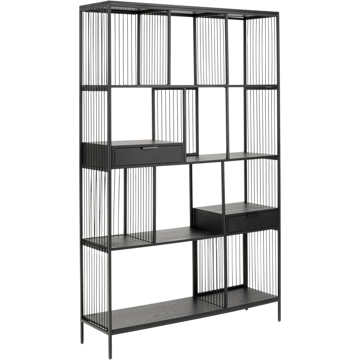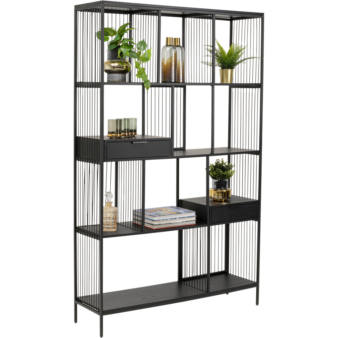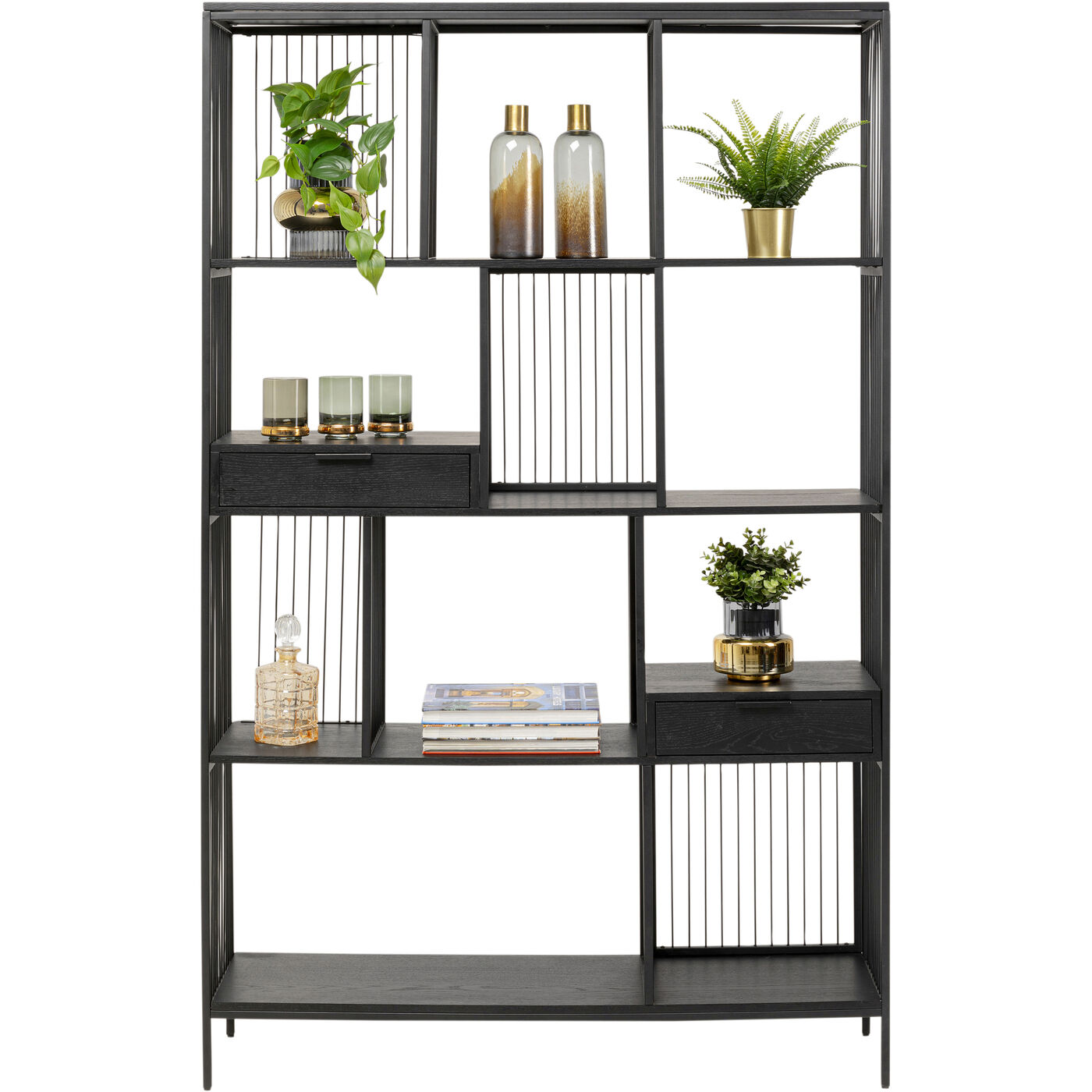 - Die dekorativen Qualitäten des Metallregals unterstreichen die Fronten und Böden aus lackiertem Eichenholz-Furnier