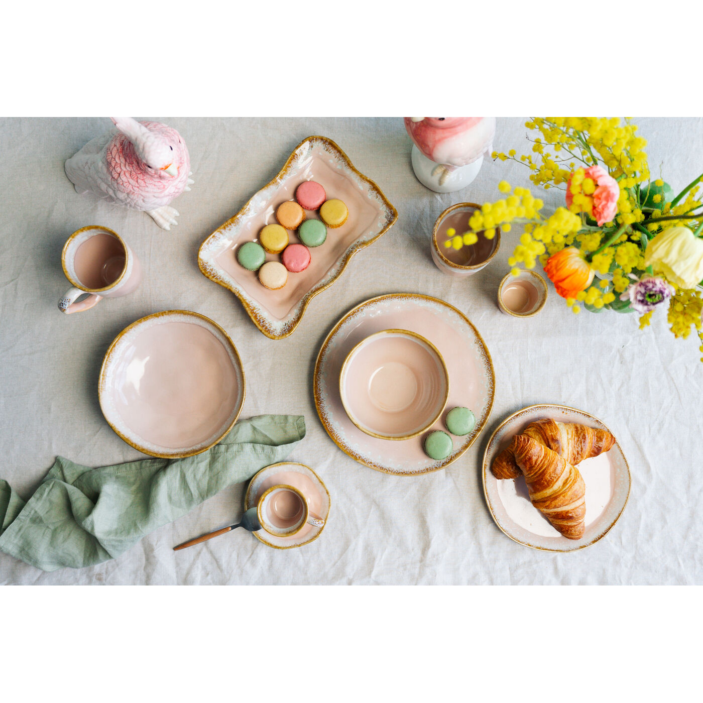 Unsere Geschirrserie Nala verleiht jedem Tisch eine mediterrane Leichtigkeit. Der zarte Rosaton, kombiniert mit warmen Beige- und Weißakzenten, schafft eine harmonische Atmosphäre, die skandinavische, Boho- oder mediterrane Tischarrangements perfekt abrundet. Die organische Form und die strukturierte Oberfläche verleihen jedem Teil eine handgefertigte, einzigartige Ausstrahlung. Ob für ein schönes Frühstück im Garten, ein gemütliches Abendessen mit Freunden oder ein festliches Dinner – das Geschirr sorgt durch seine beruhigenden Farben und Formen für Wohlfühlatmosphäre. Kombiniert mit natürlichen Materialien wie Holz oder Leinen, lässt sich die Serie zu einem modernen, dennoch warmen Setting inszenieren.