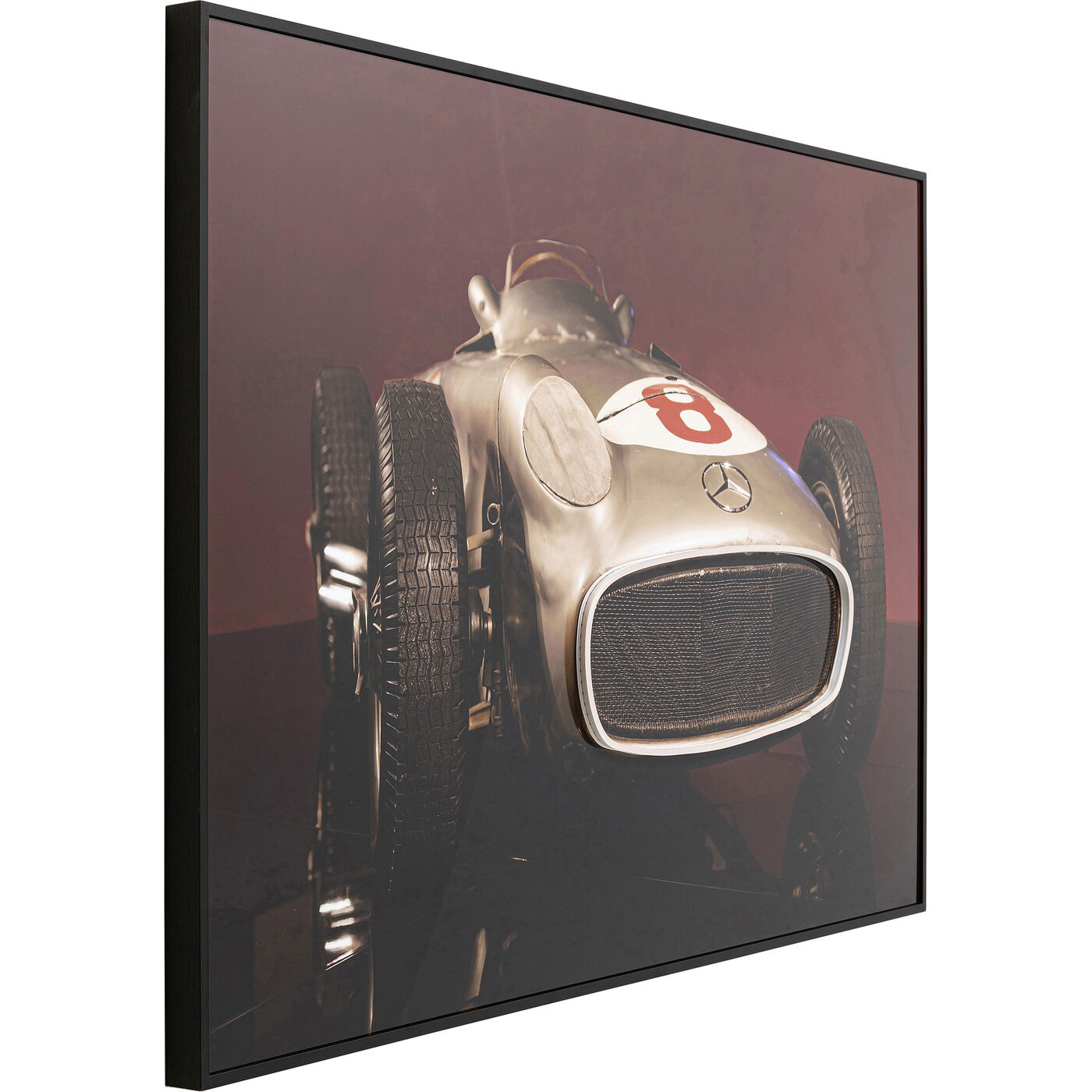 - Der silberne Rennwagen im Oldtimer-Stil kommt auf dem dynamischen Hintergrund in sattem Rot perfekt zur Geltung