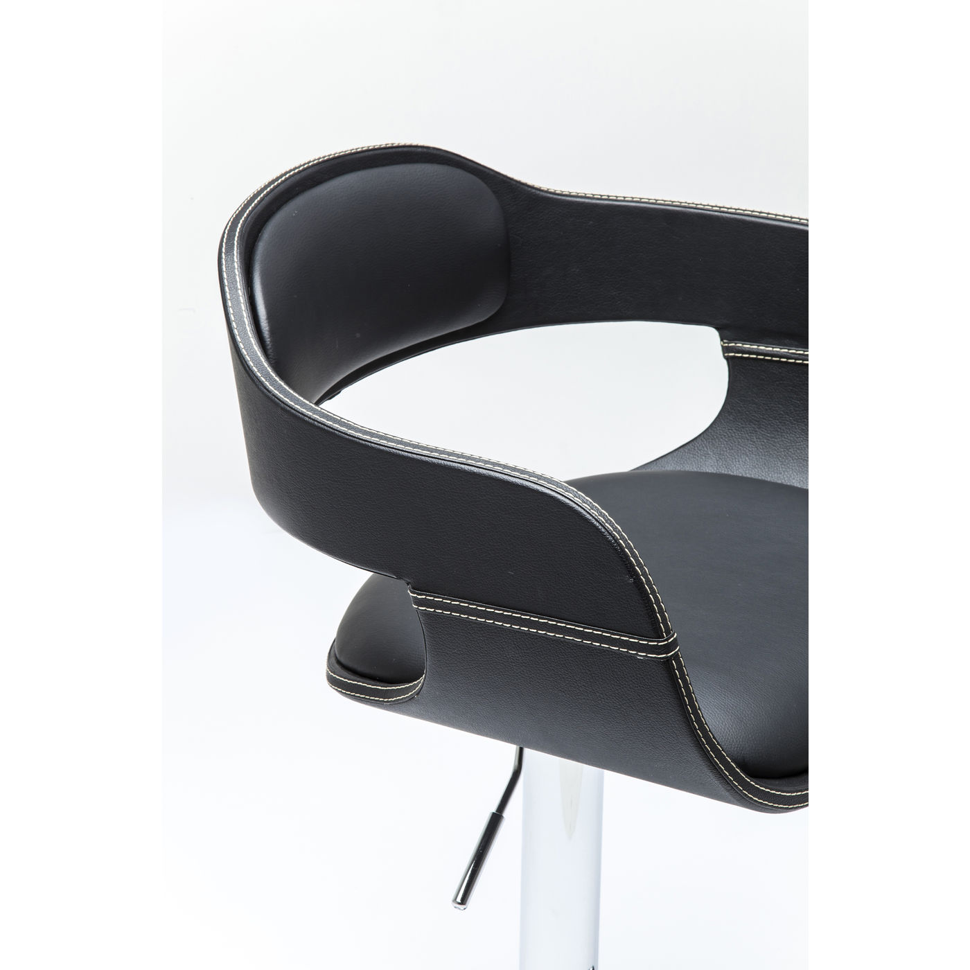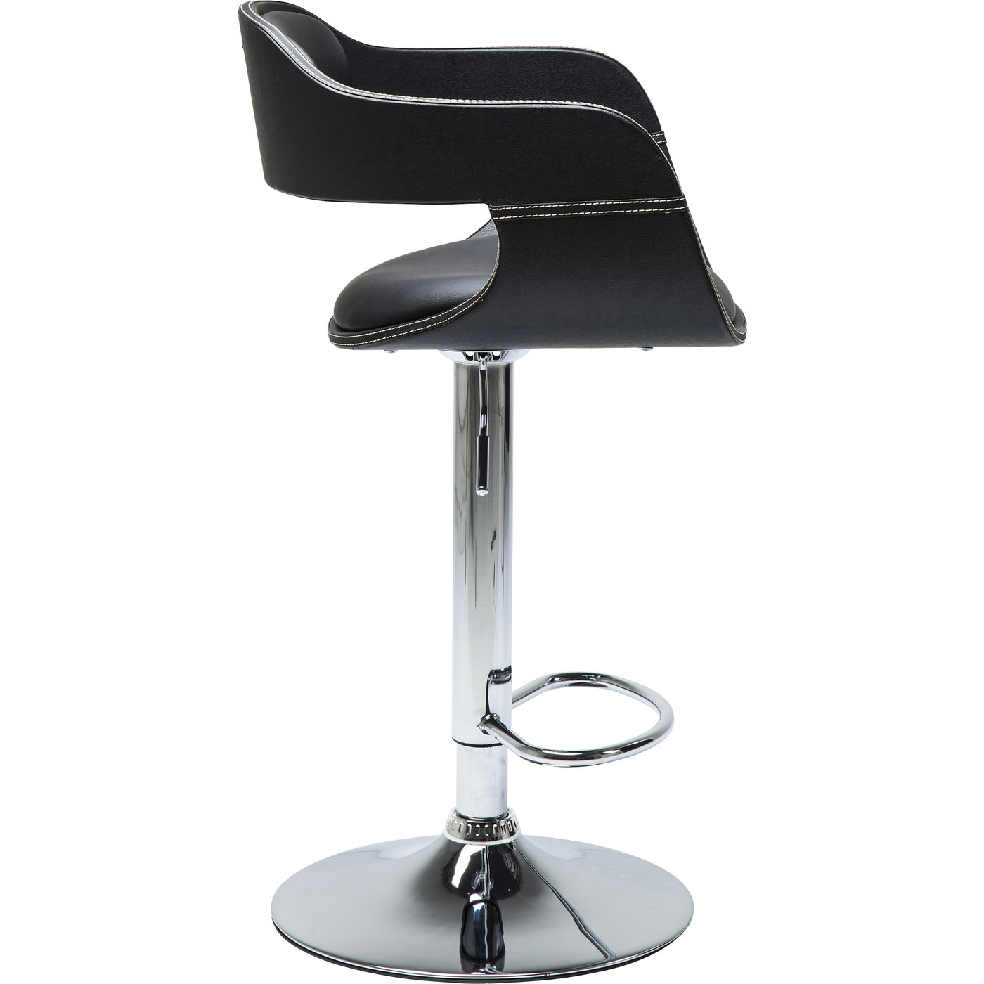 The black bar stool with a continuous arm and backrest is a modern and stylish piece of furniture for your home. With its practical gas pressure spring, the height of the bar stool can be individually adjusted, while the integrated footrest offers additional comfort. The easy-care cover makes cleaning a breeze. The foam padding of the seat and back ensure seating comfort. The steel central foot ensures stability. The chrome-plated metal parts (steel) underline the high quality of this bar stool and its elegant look. Whether at the kitchen counter or at your own bar - this bar stool is the perfect choice for a modern interior.