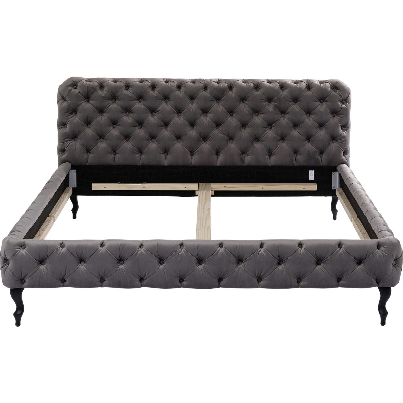 - This silver-grey upholstered bed with a velvety cover, also in silver-grey, elaborate button stitching and neo-baroque feet in solid beech is really luxurious