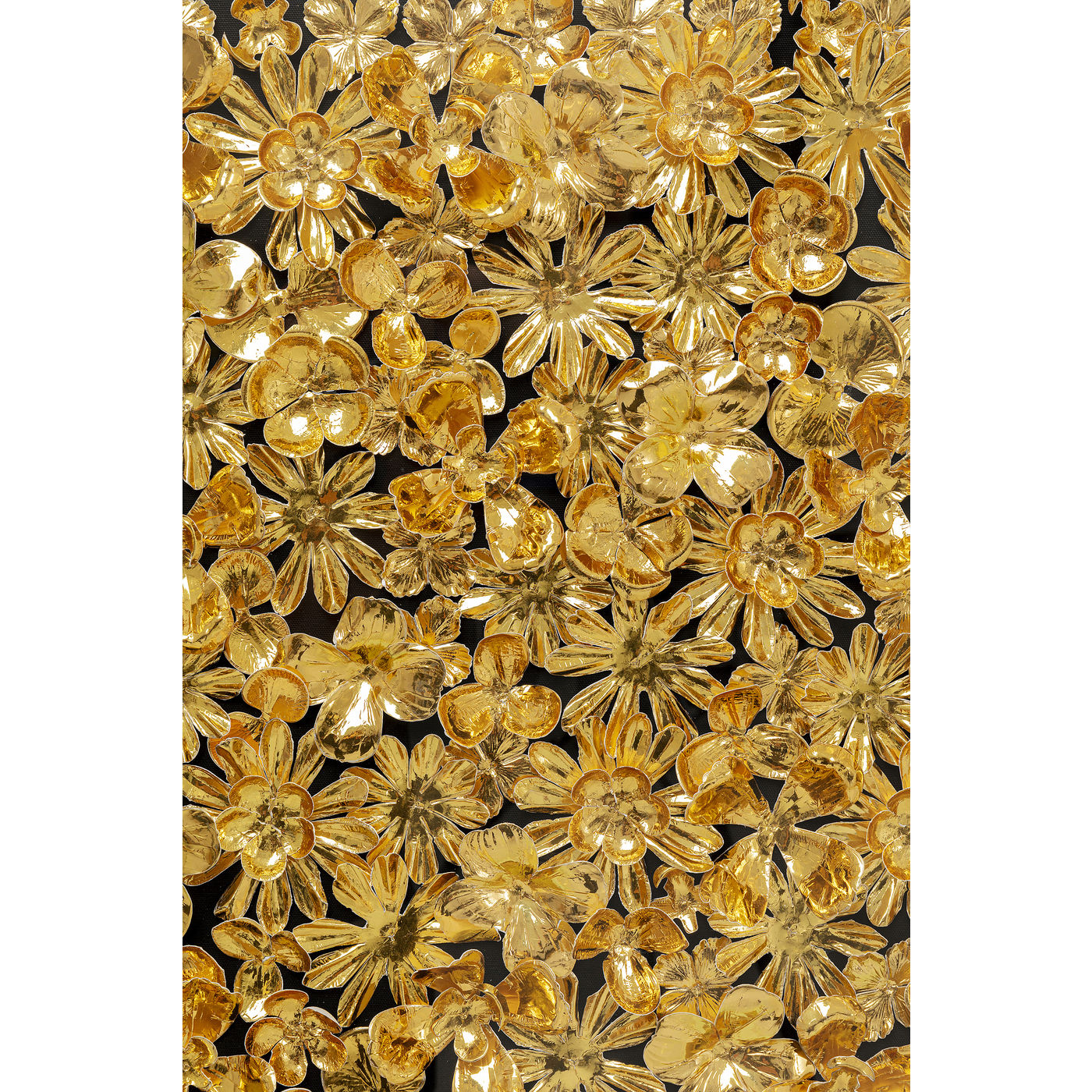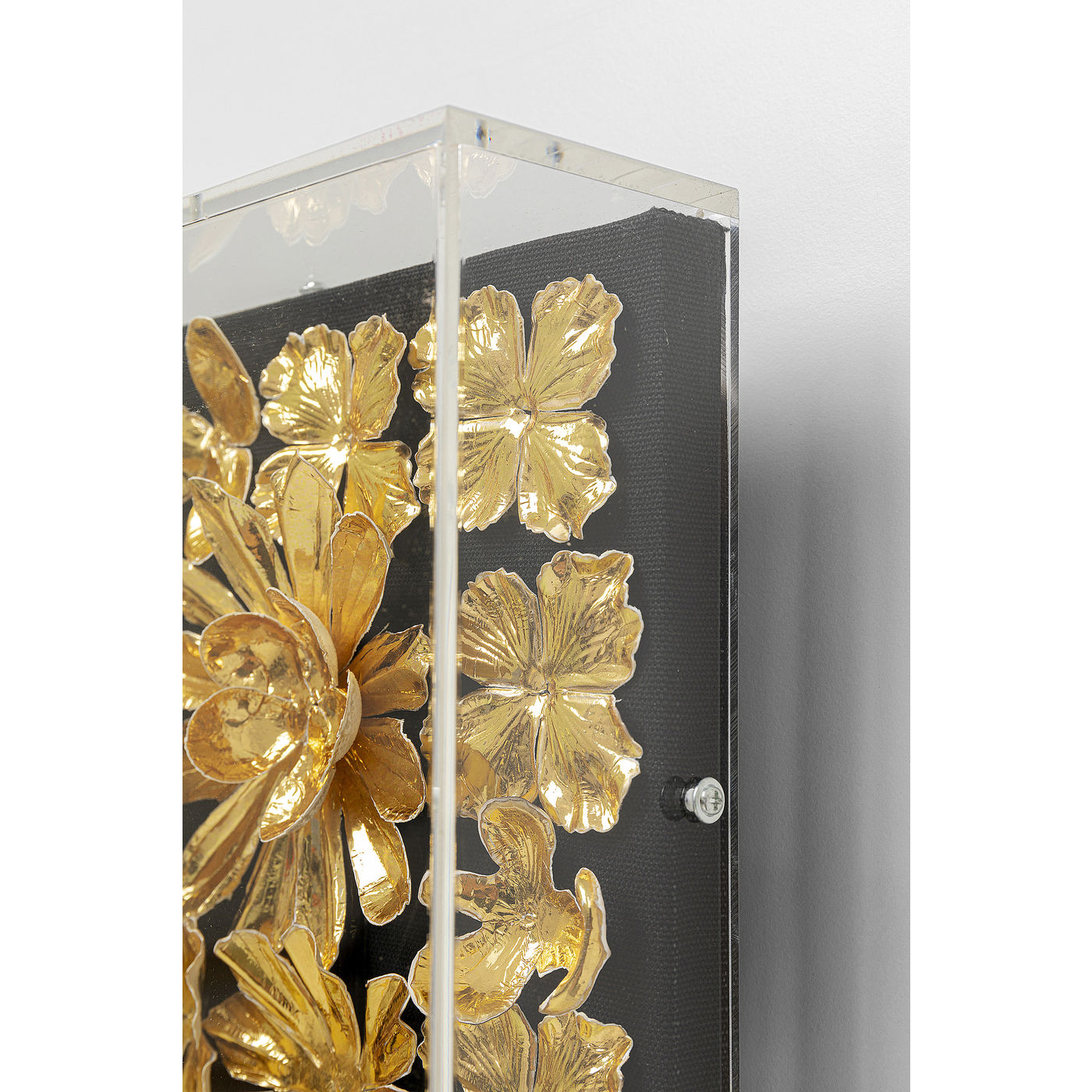 A three-dimensional work of art for flower fans: This plexiglass frame with golden blossoms is a big statement image for a room. Exciting interpretation: The flowers look natural and fresh like a summer meadow, the golden shine gives them a glamorous and modern touch.