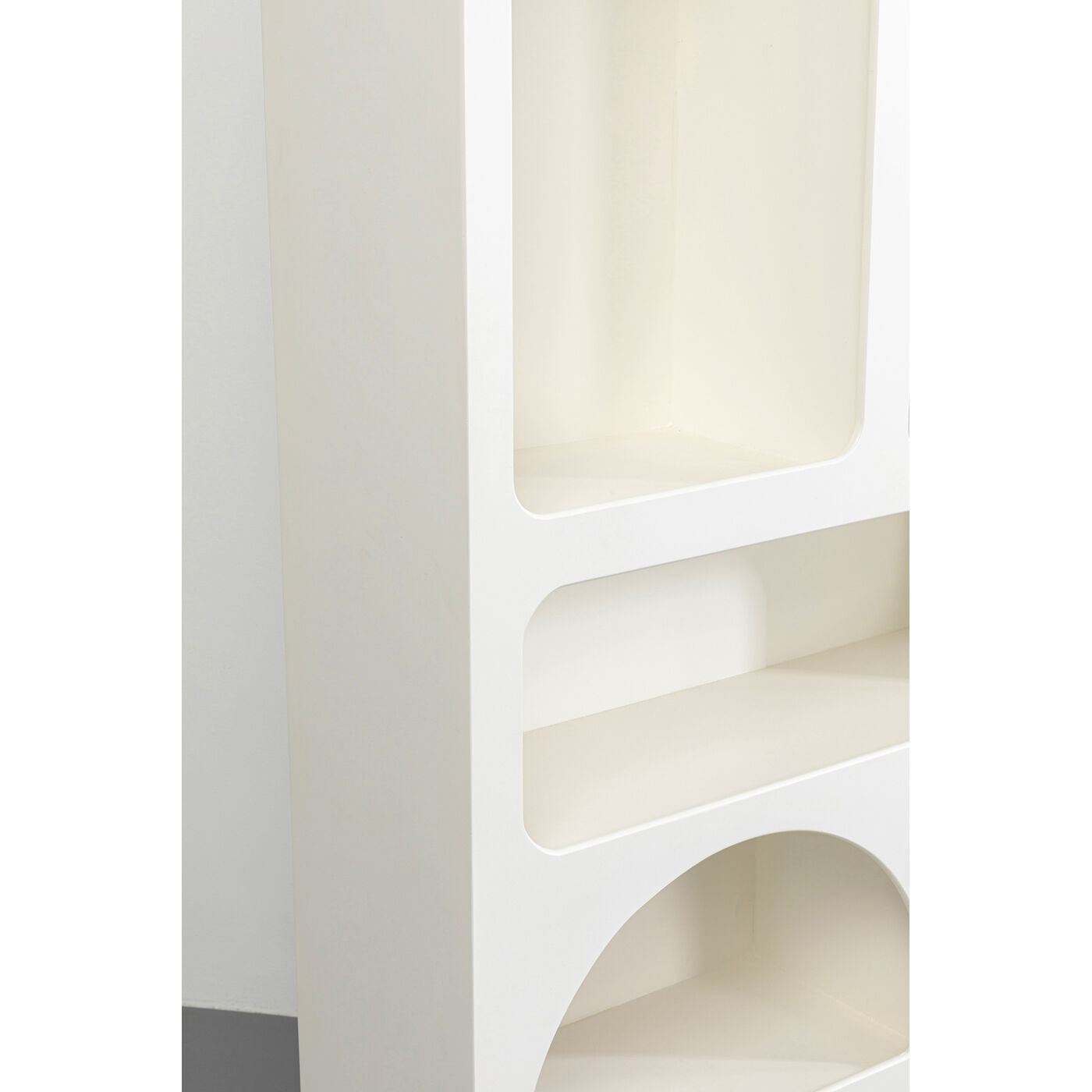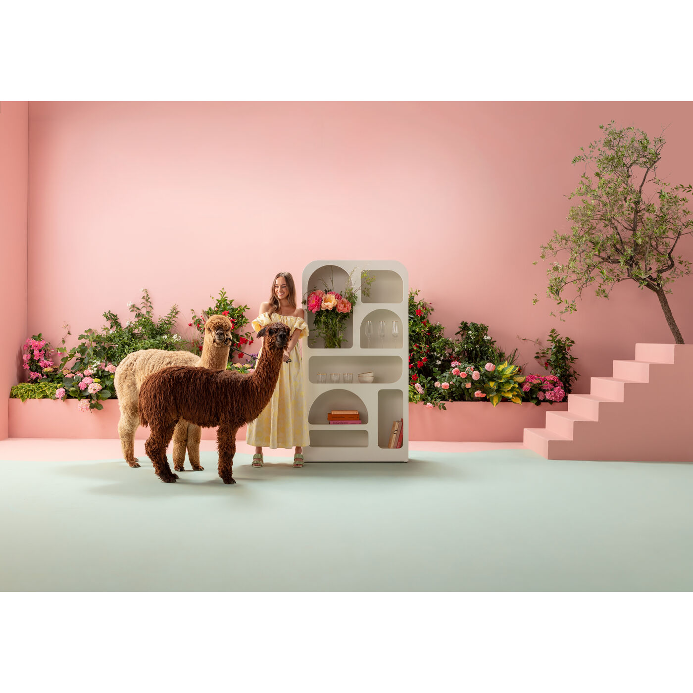 Furniture and decorations with round, curved shapes have become an integral part of interior design. This is due to the soft silhouette that creates harmony in the room. The seven differently shaped compartments are like small rooms in which you can store and arrange your favourite items. Of course, there is also room for books on this shelf. The wall shelf is completely lacquered so that this piece of furniture is easy to clean: dusting is sufficient and the surface can also be wiped clean with a soft, damp cloth, using a mild detergent if necessary.