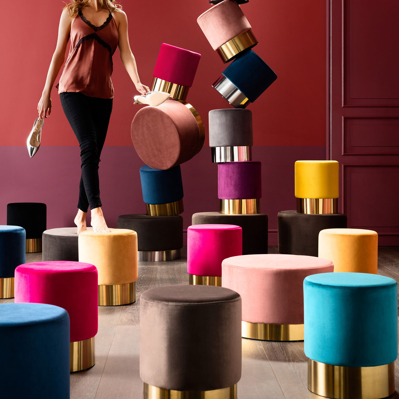 Glamour your home Irresistible! A stylish footstool is something every home should have – and apart from that, a little bit of glamour has never done anyone any harm. This stylish stool is an absolute must-have for every stylish interior, and an absolute favourite among those who influence interior design. It will transform every room into a salon, giving it an extra portion of chic and glamour. Cherry creates dream combinations and makes a ravishing impression with its tasteful design. The entire seat is elaborately upholstered with soft velvet which gleams softly. The base with its gold-coloured finish creates an elegant contrast and stylishly rounds off the glamorous overall impression. Whether you use it as a seat, a side table, a bedside table or simply for placing things on, it s sure to attract all eyes. Cherry comes in further attractive and fashionable colours.