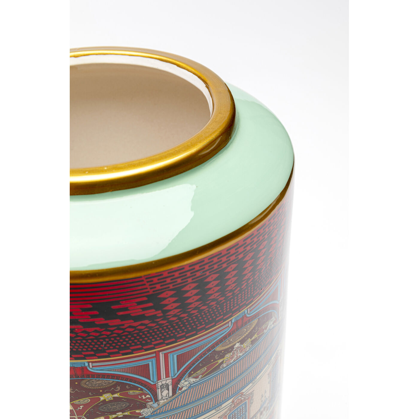A touch of palace flair for modern interiors: this porcelain vase brings a real gallery feeling into the home with its detailed decoration and vibrant colour scheme. The ornate pattern is reminiscent of antique frescoes and adds an expressive touch to sideboards, consoles or open shelves. The elegantly curved neck with a fine gold accent skilfully sets the scene for floral compositions - whether with individual branches, lush bouquets or simply as a solo work of art. Particularly harmonious in combination with velvet, marble or dark wood tones - for an interior that tells a story and looks extravagant at the same time.