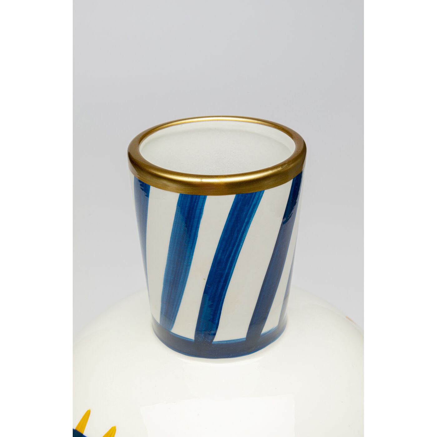 A fascinating decorative object that enhances any room with its expressive design and vibrant play of colors. The vase impresses with its artistically designed surface, which creates excitement with its contrasting shapes and dynamic lines. Ideal as a stand-alone statement on a sideboard or in combination with fresh flower arrangements, it brings lively accents to the interior. Whether in minimalist settings as a colorful eye-catcher or mixed with other unusual pieces, this work of art gives the home a modern, creative atmosphere full of personality and style.