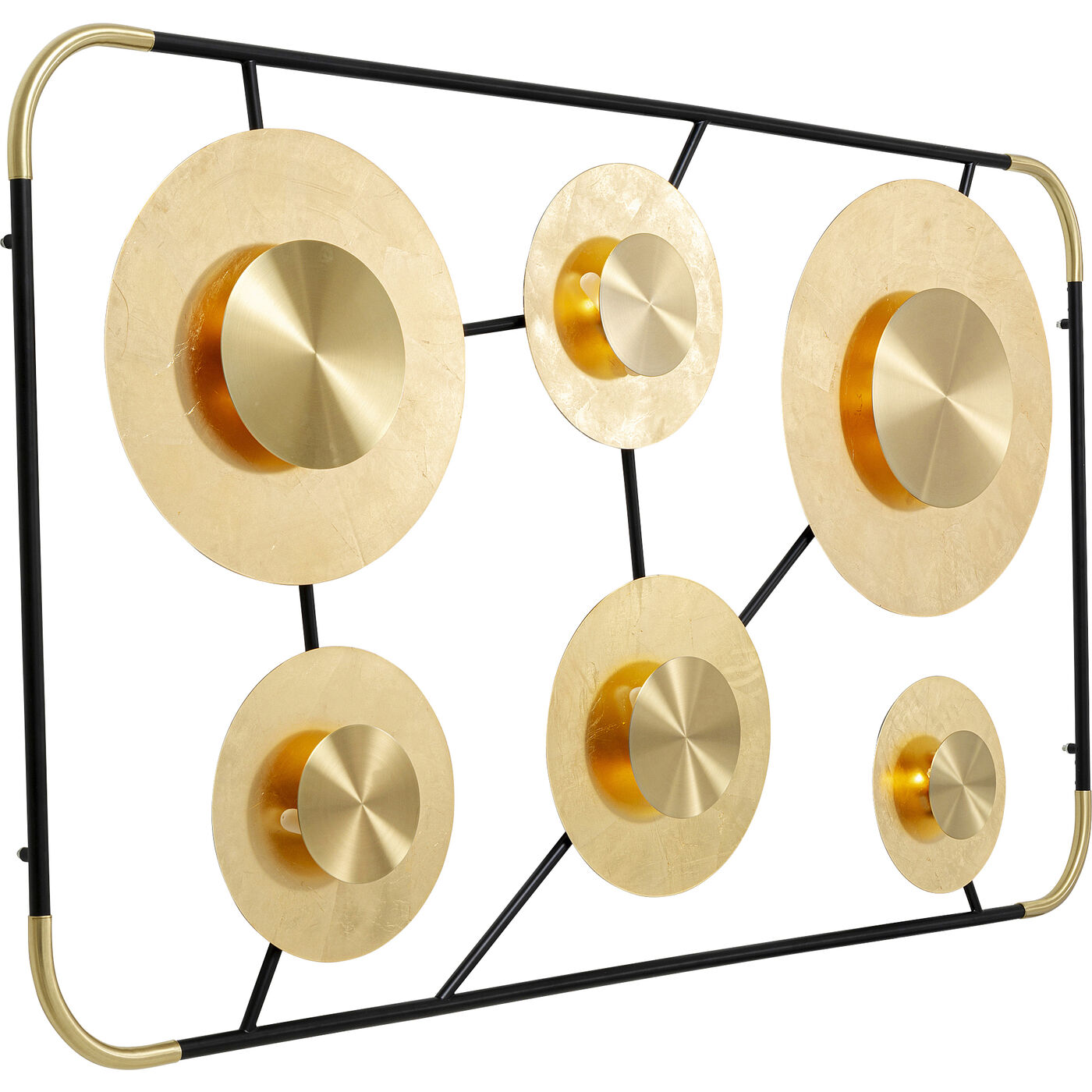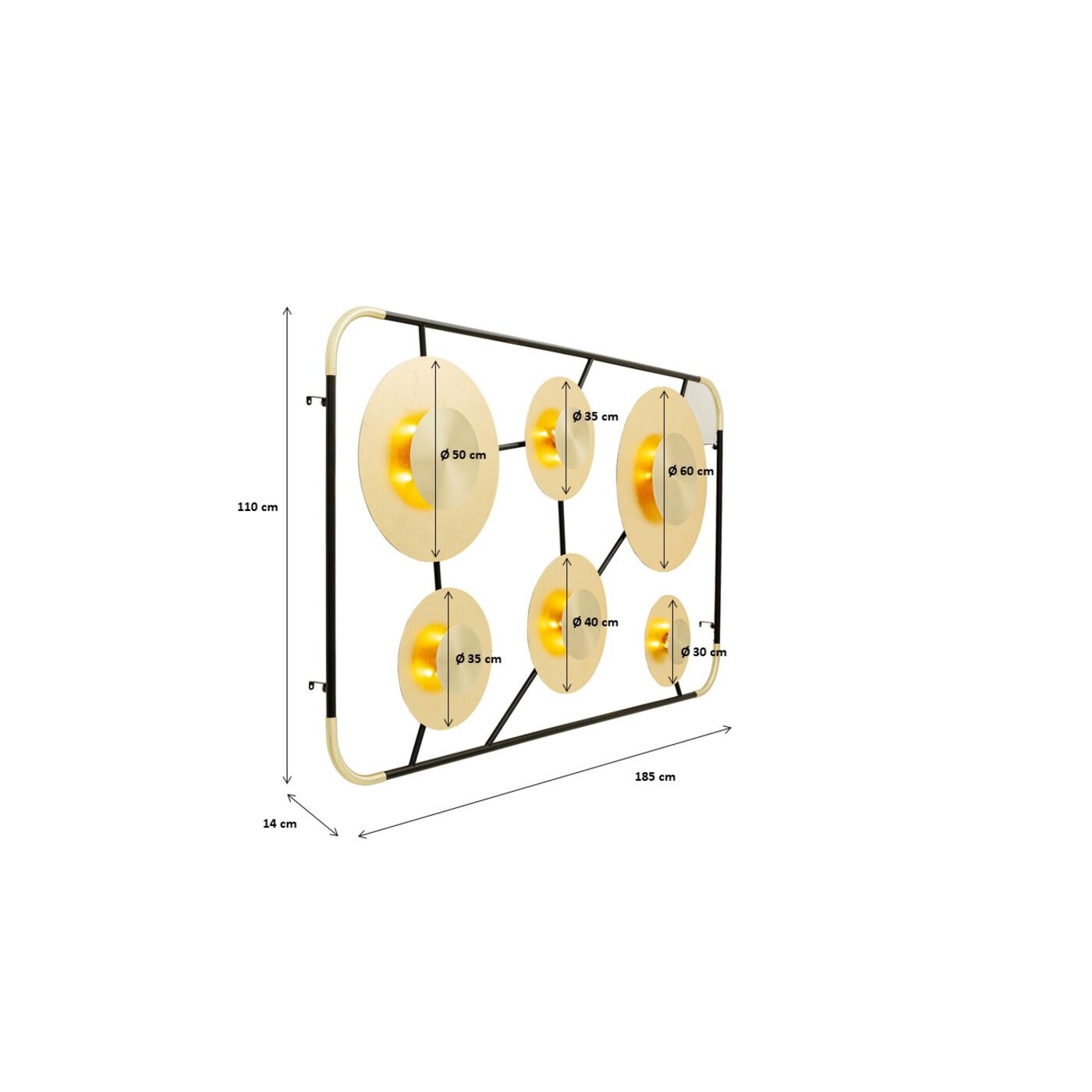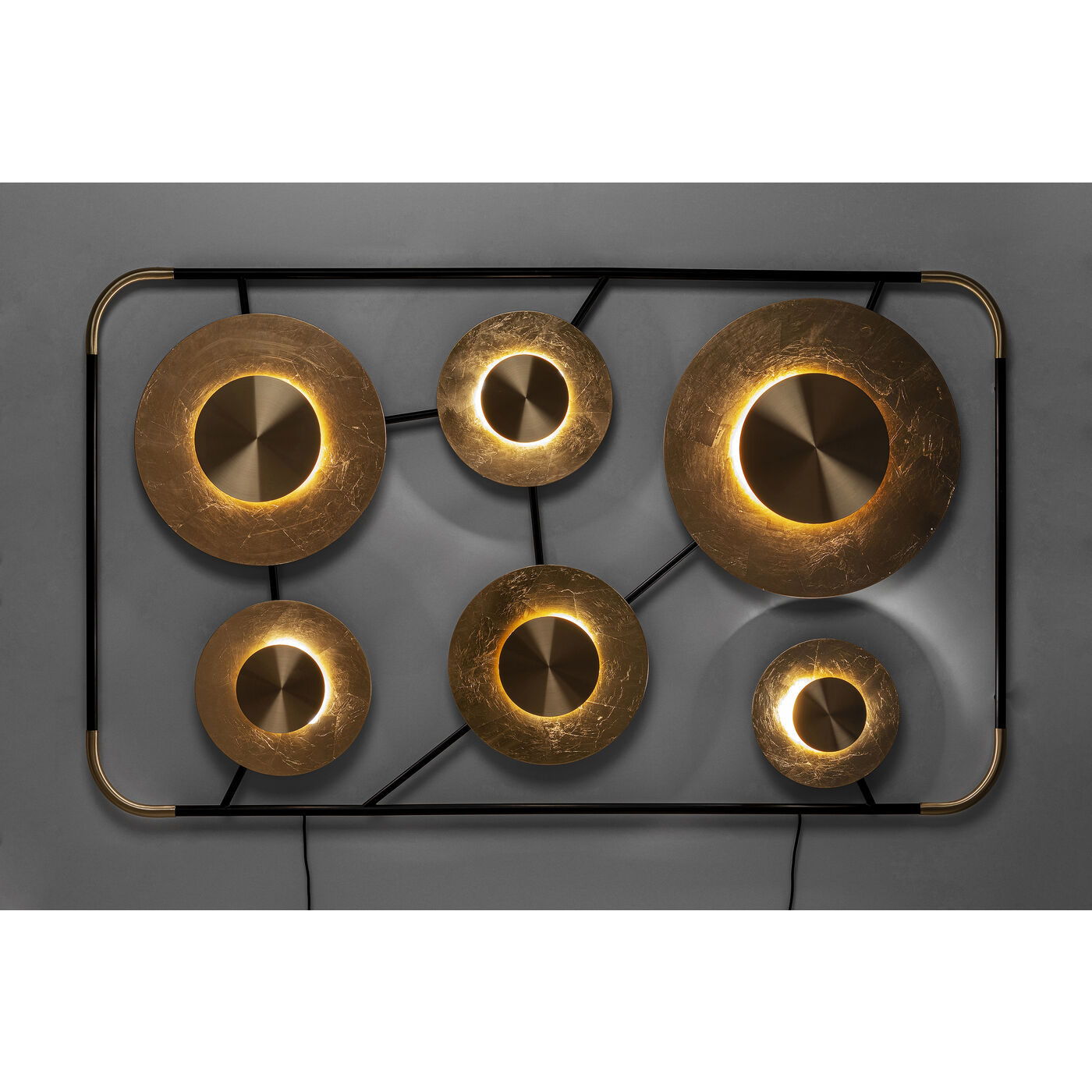 - Large luminous object for wall mounting with six round, matt-gold shimmering light sources