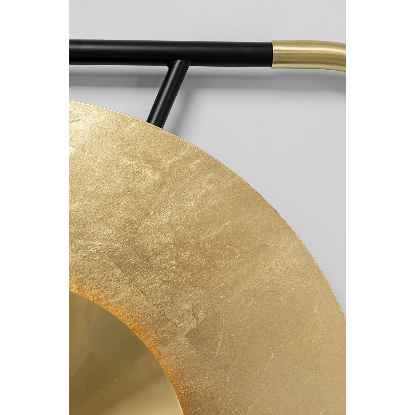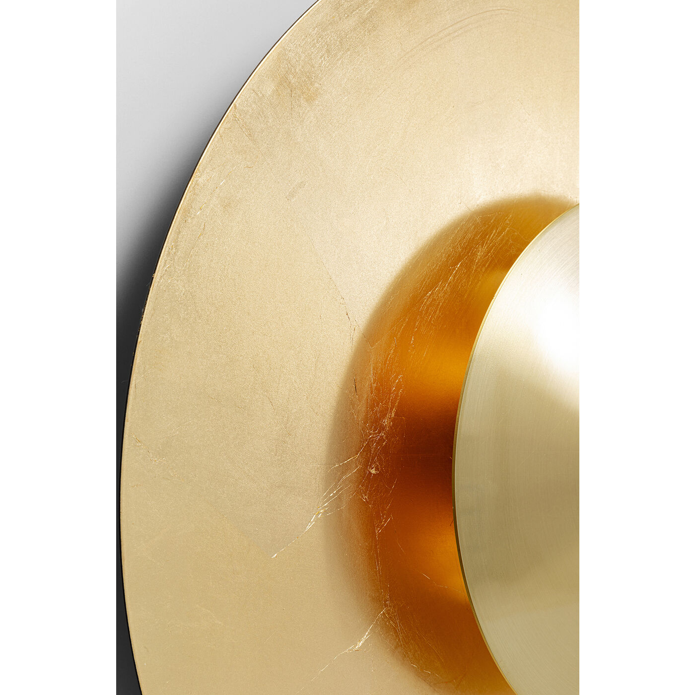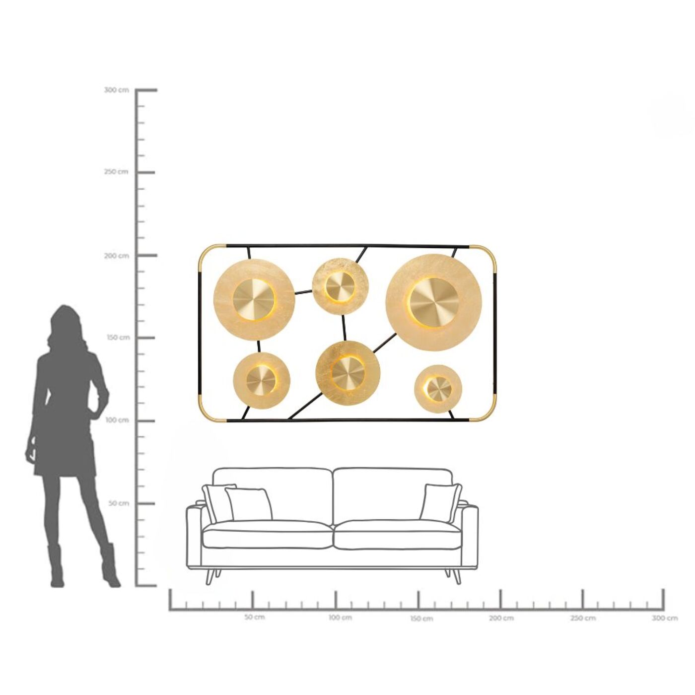 - Large luminous object for wall mounting with six round, matt-gold shimmering light sources