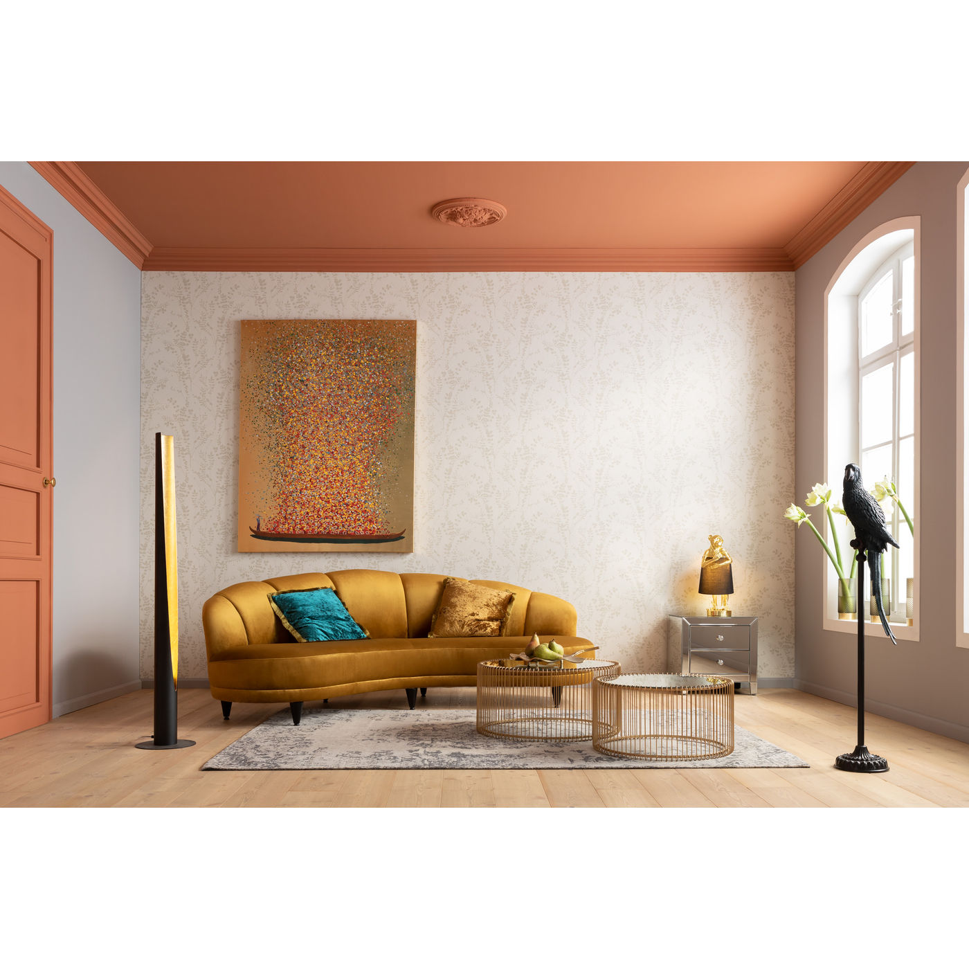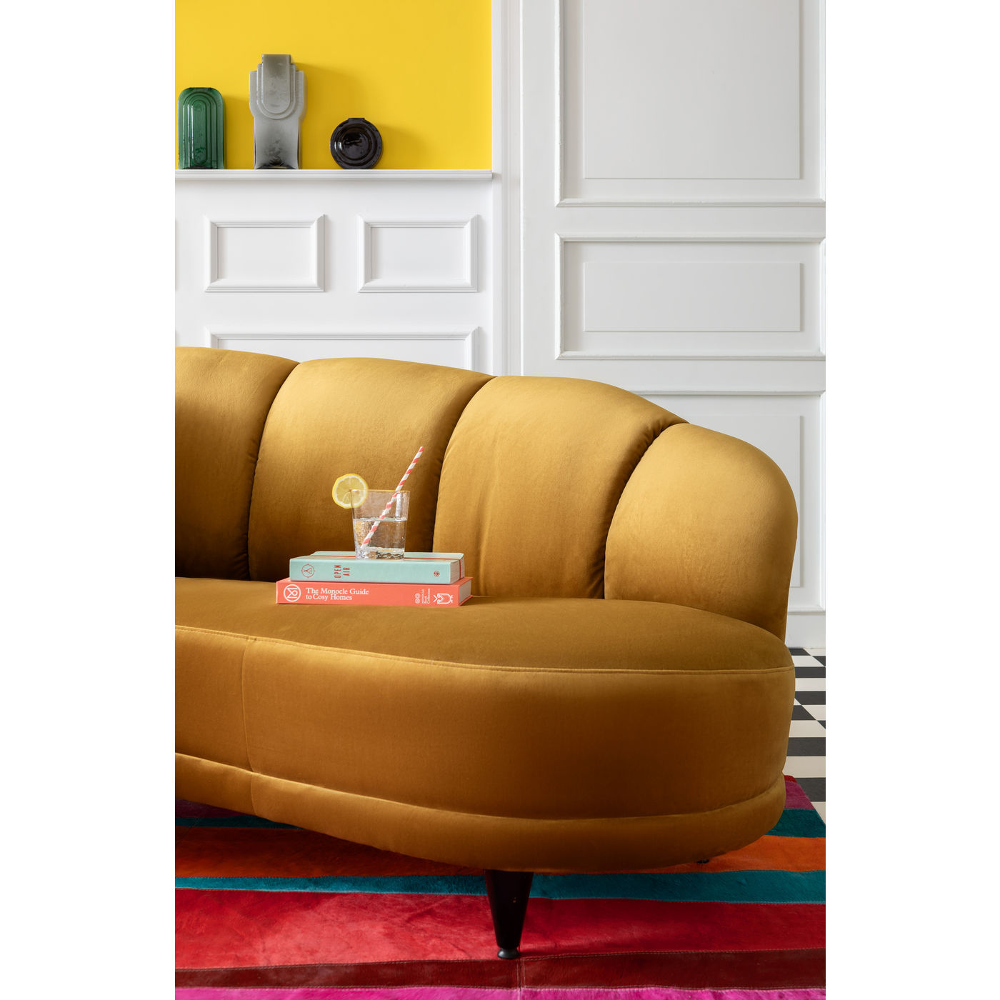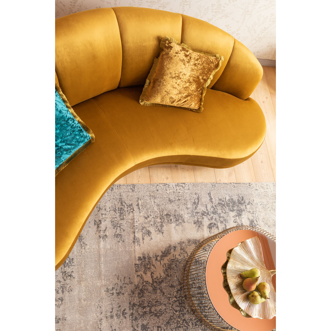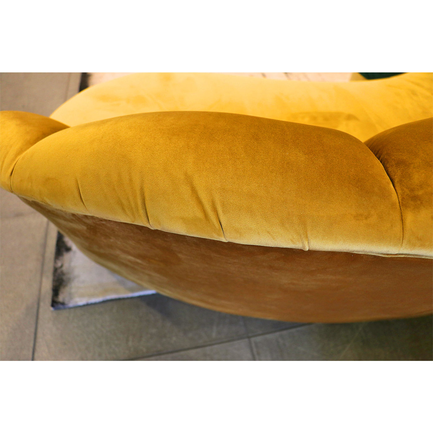 Un canapé ? Non, un trésor ! La forme joliment incurvée, le dossier semi-circulaire, la sellerie câline et la sellerie veloutée rendent cette trois places incroyablement attrayante. Une pièce exquise comme dans le salon d’un hôtel étoilé moderne.