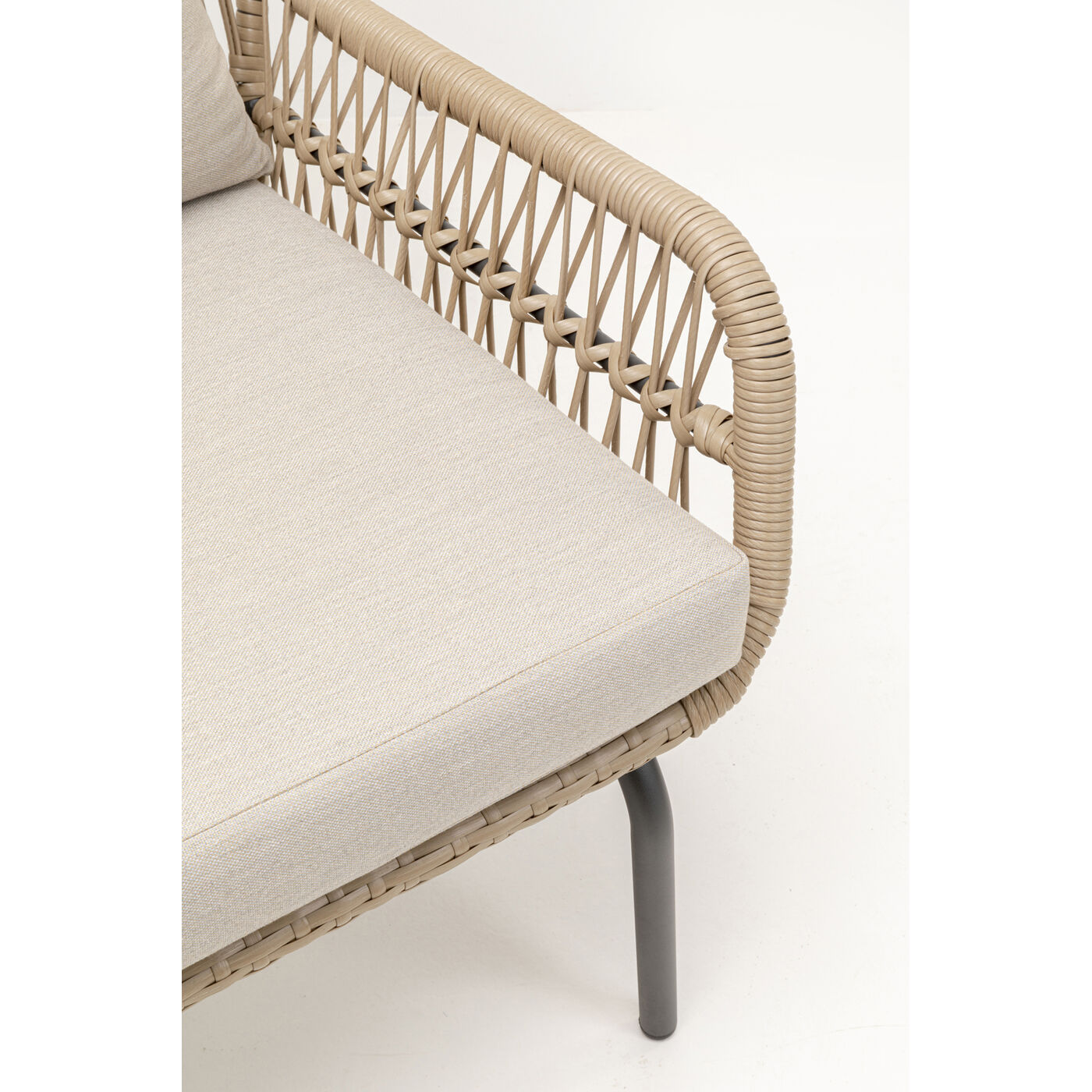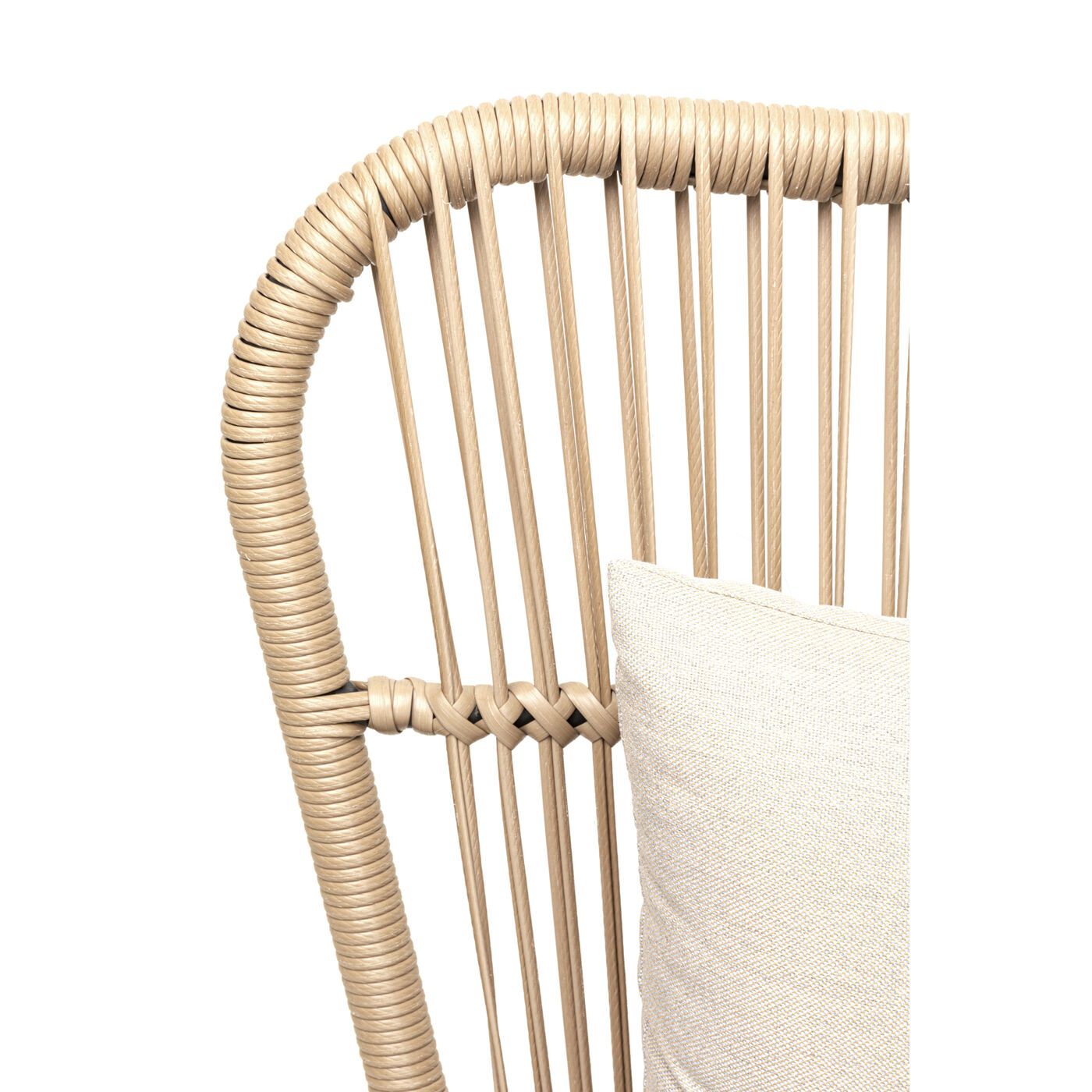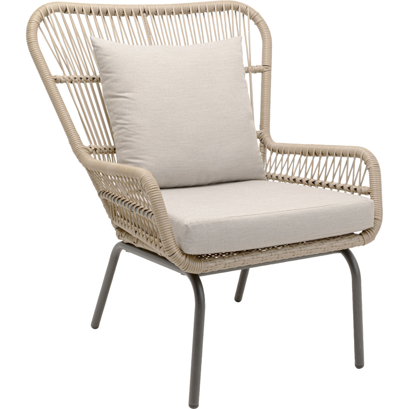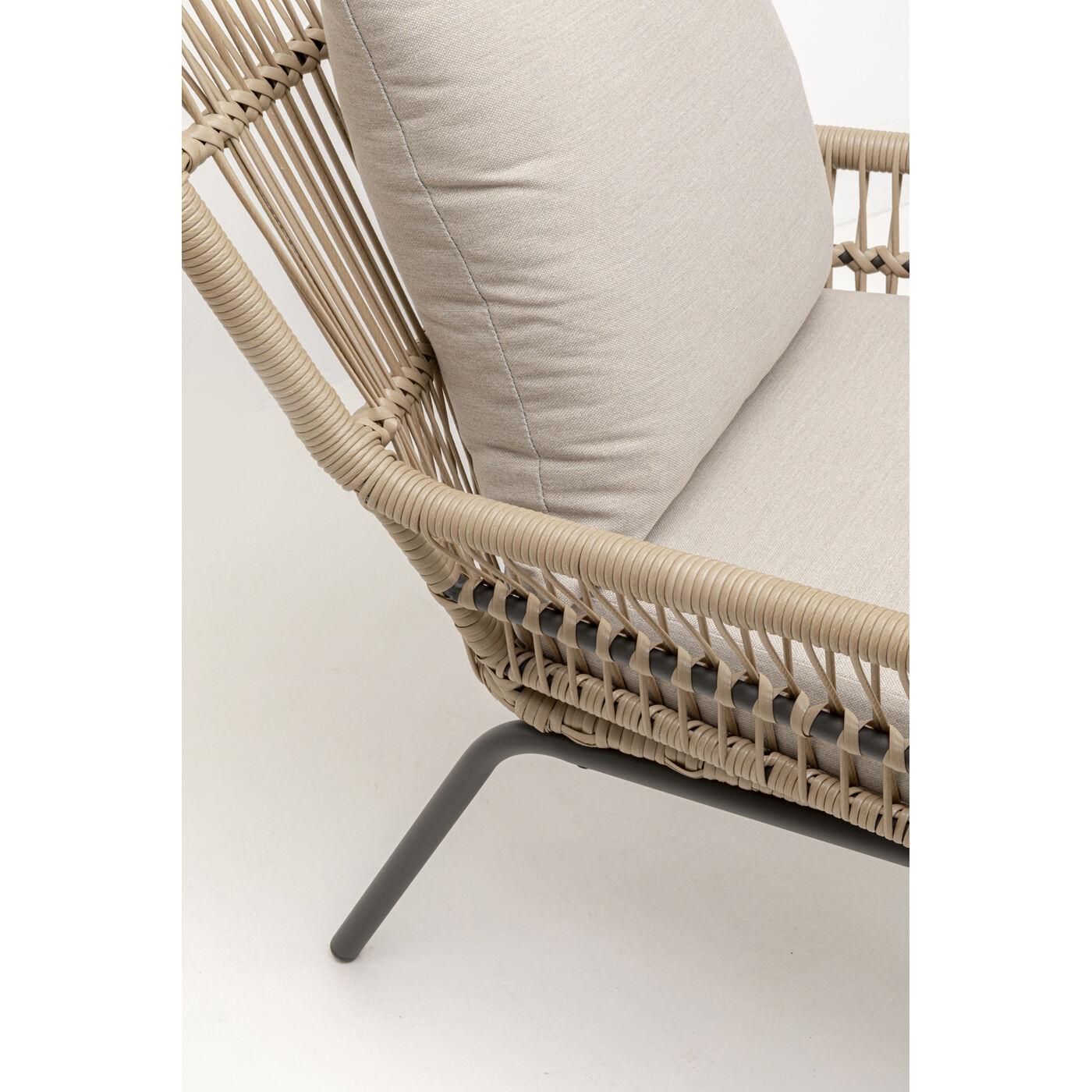 Un mélange réussi d élégance et de décontraction - ce fauteuil d extérieur allie des formes organiques à un tressage moderne. Sa silhouette délicatement incurvée et ses hauts accoudoirs lui confèrent un aspect accueillant, tandis que le tressage aérien en matériau durable assure une légèreté estivale. Le piètement métallique revêtu par poudre crée un contraste élégant et assure la stabilité. Des coussins moelleux dans des tons naturels discrets rendent le confort d assise parfait. Que ce soit comme point fort sur la terrasse ou combiné avec d autres meubles de salon, il apporte un chic décontracté dans chaque oasis extérieure.