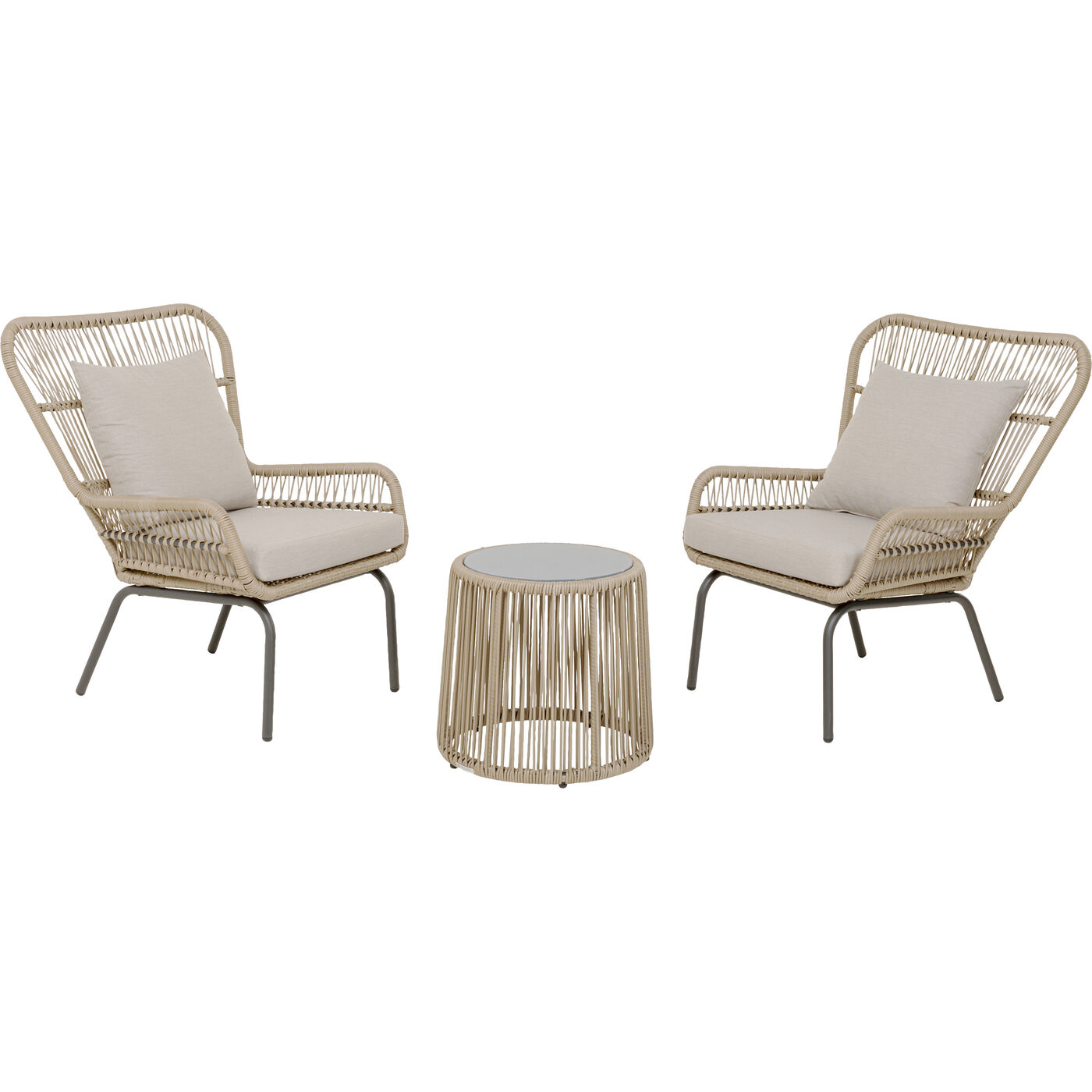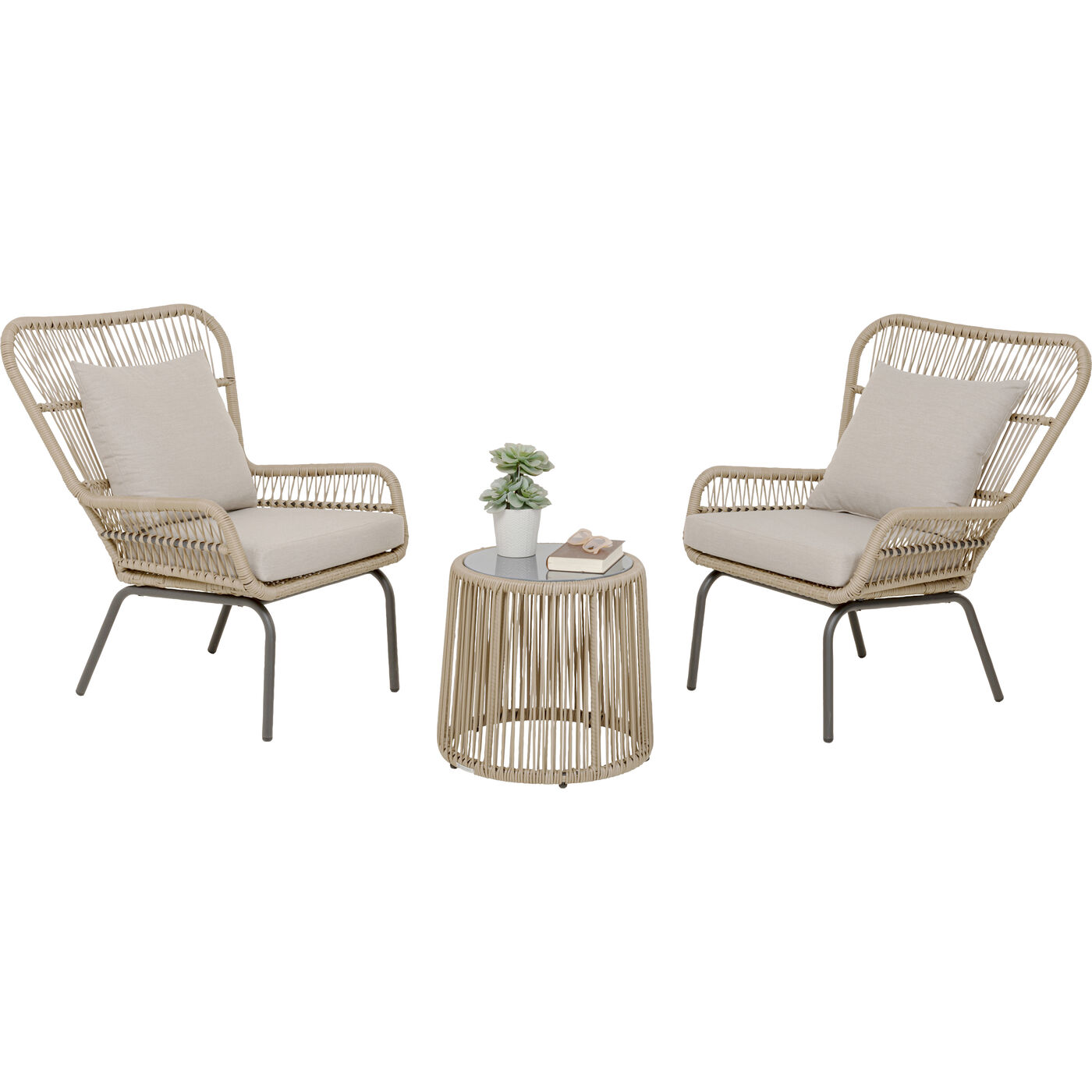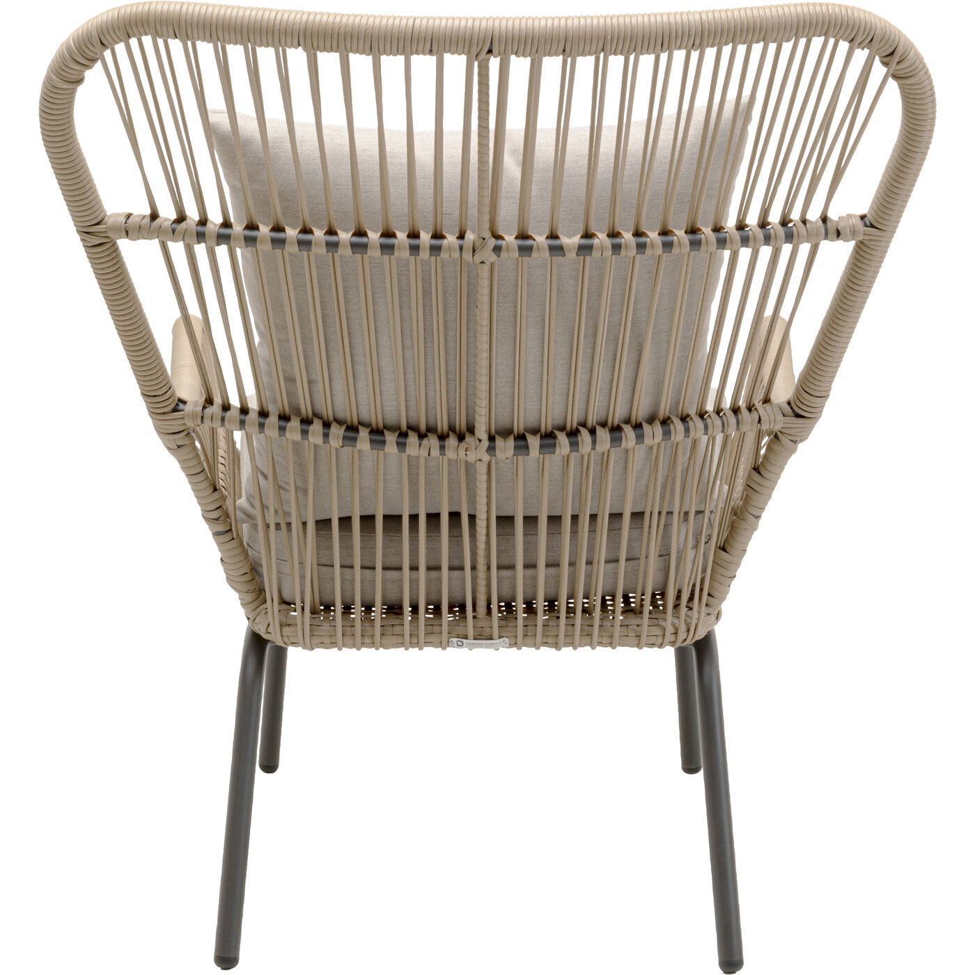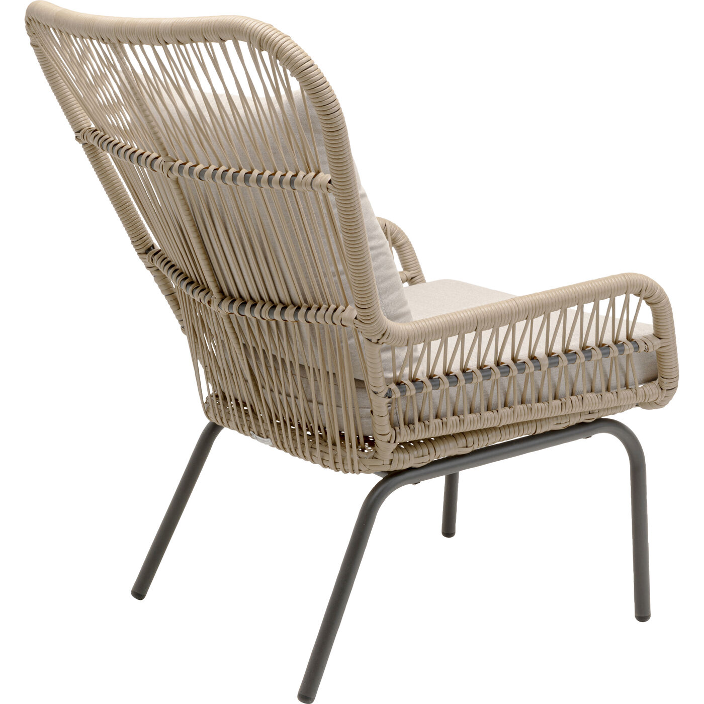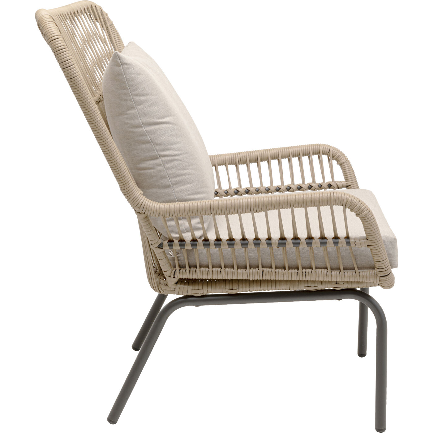 Un mélange réussi d élégance et de décontraction - ce fauteuil d extérieur allie des formes organiques à un tressage moderne. Sa silhouette délicatement incurvée et ses hauts accoudoirs lui confèrent un aspect accueillant, tandis que le tressage aérien en matériau durable assure une légèreté estivale. Le piètement métallique revêtu par poudre crée un contraste élégant et assure la stabilité. Des coussins moelleux dans des tons naturels discrets rendent le confort d assise parfait. Que ce soit comme point fort sur la terrasse ou combiné avec d autres meubles de salon, il apporte un chic décontracté dans chaque oasis extérieure.