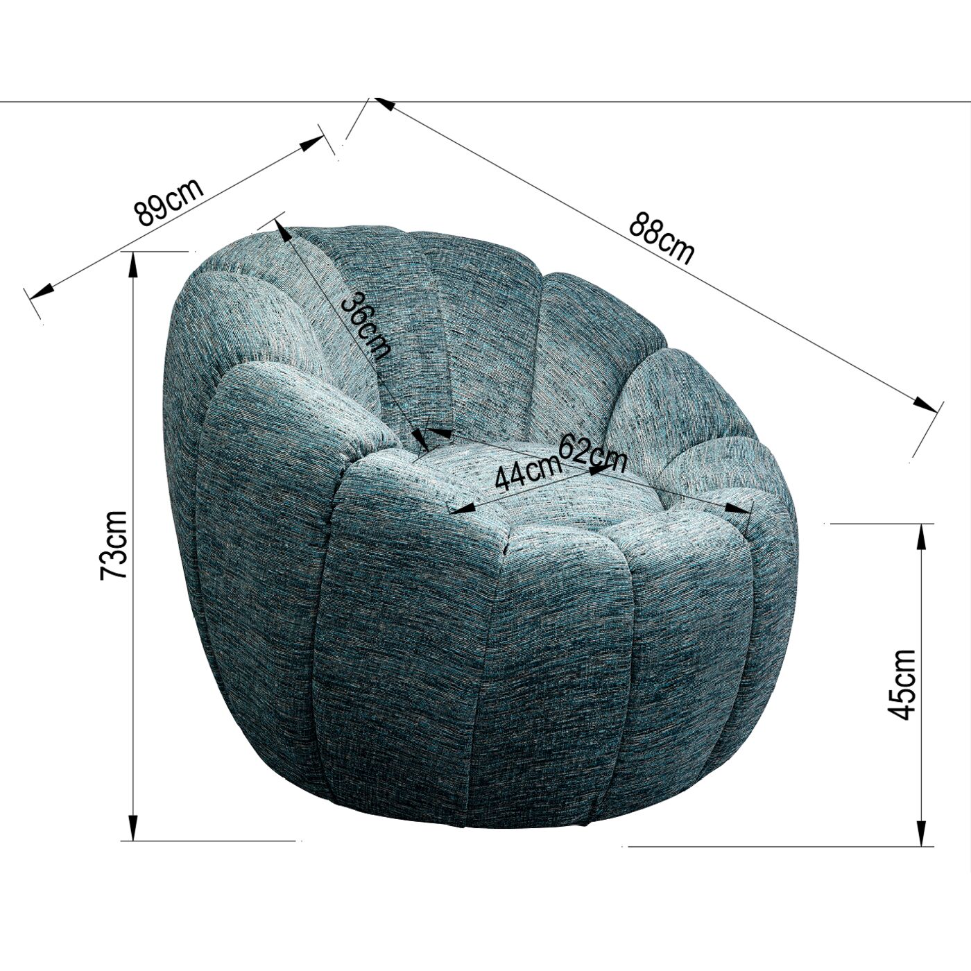 - Fauteuil pivotant rond bleu, 73 x 89 x 88 centimètres (h/l/p)