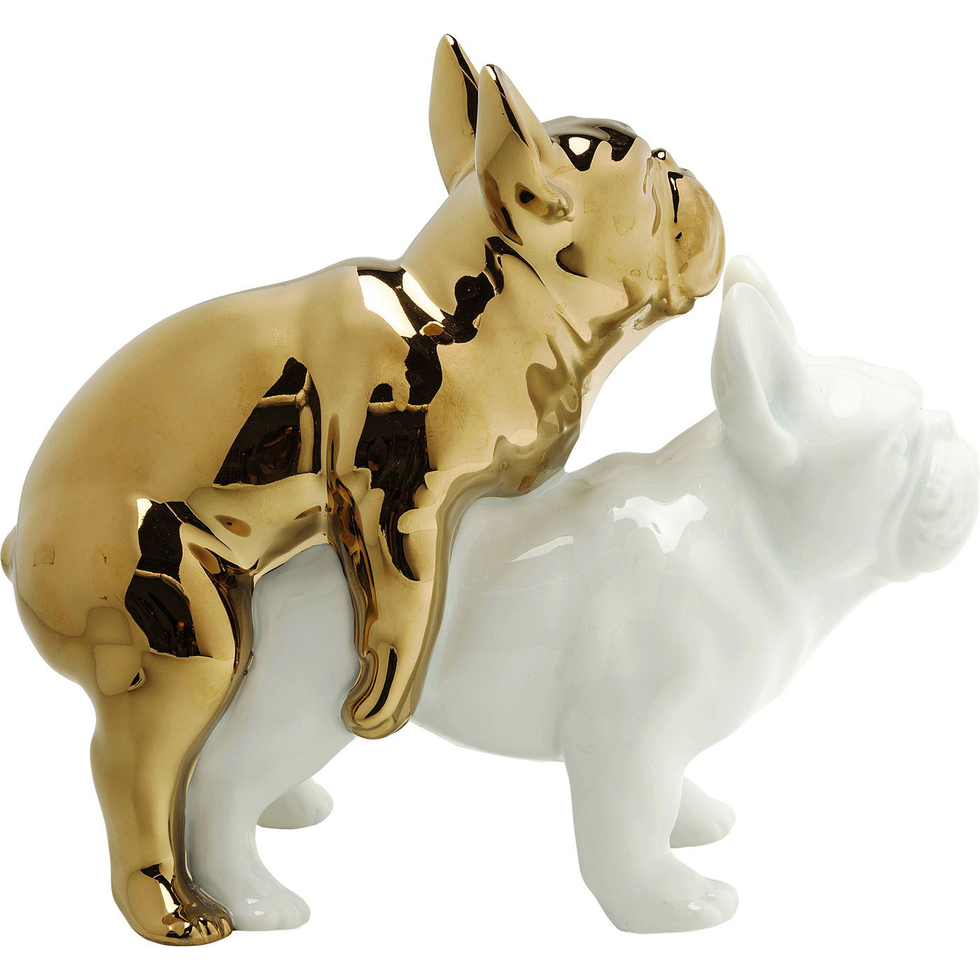 Cette extraordinaire figure de porcelaine avec deux amants - ou jouent-ils simplement? -Les chiens sont plutôt quelque chose pour les propriétaires désinhibés. Les deux amis à quatre pattes forment une unité dans le vrai sens du terme et sont parfaitement traités. Le blanc et l’or forment un contraste noble et se fondent dans presque tous les intérieurs. Placez l’objet décoratif extravagant sur le rebord de la fenêtre, une commode ou dans une vitrine.