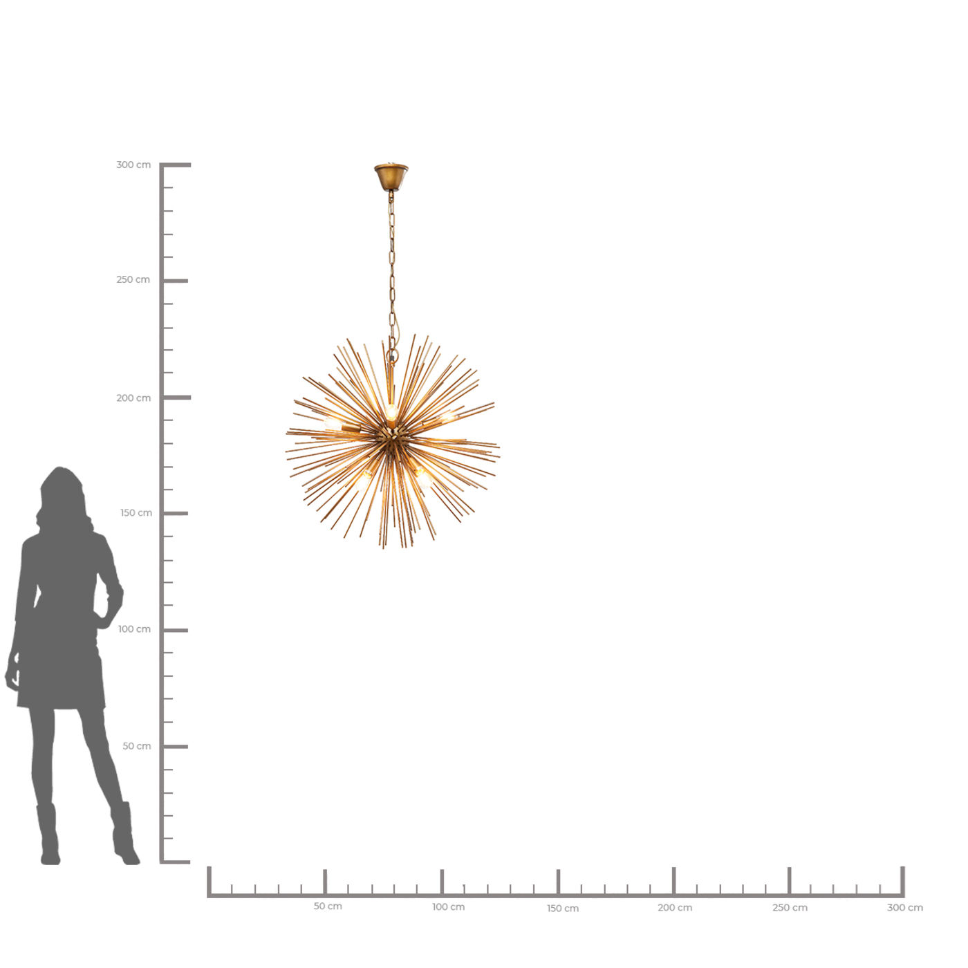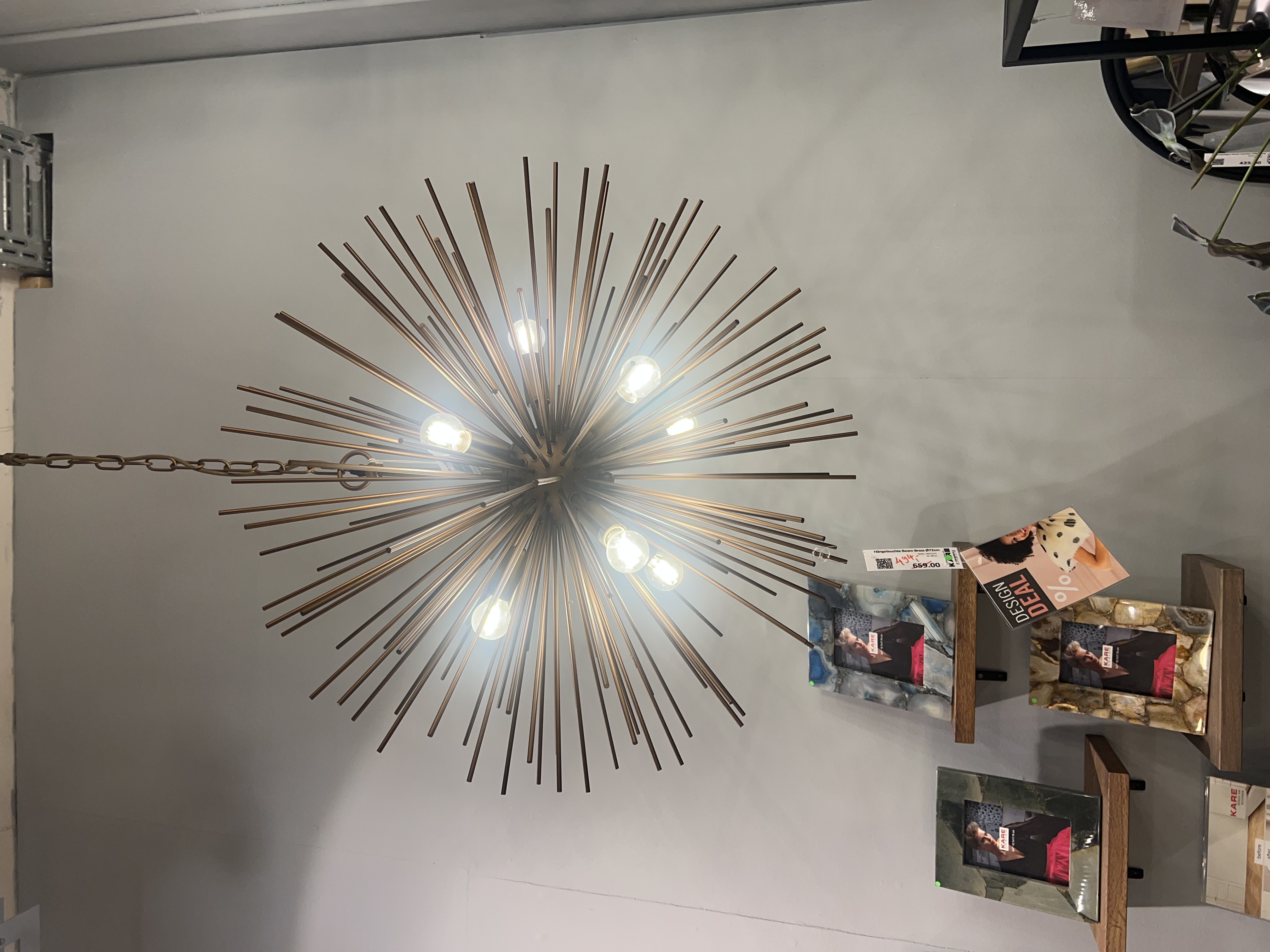 Pure lueur d’étoile. Avec les faisceaux en laiton, cette suspension se présente comme un accroche-regard dans le salon. La lumière a un effet très intense en raison de la forme spéciale. Également disponible dans d’autres variantes. 230 V, 50/60 Hz, prise E14, nombre d’ampoules 8, max. 40 watts, ampoules non incluses
