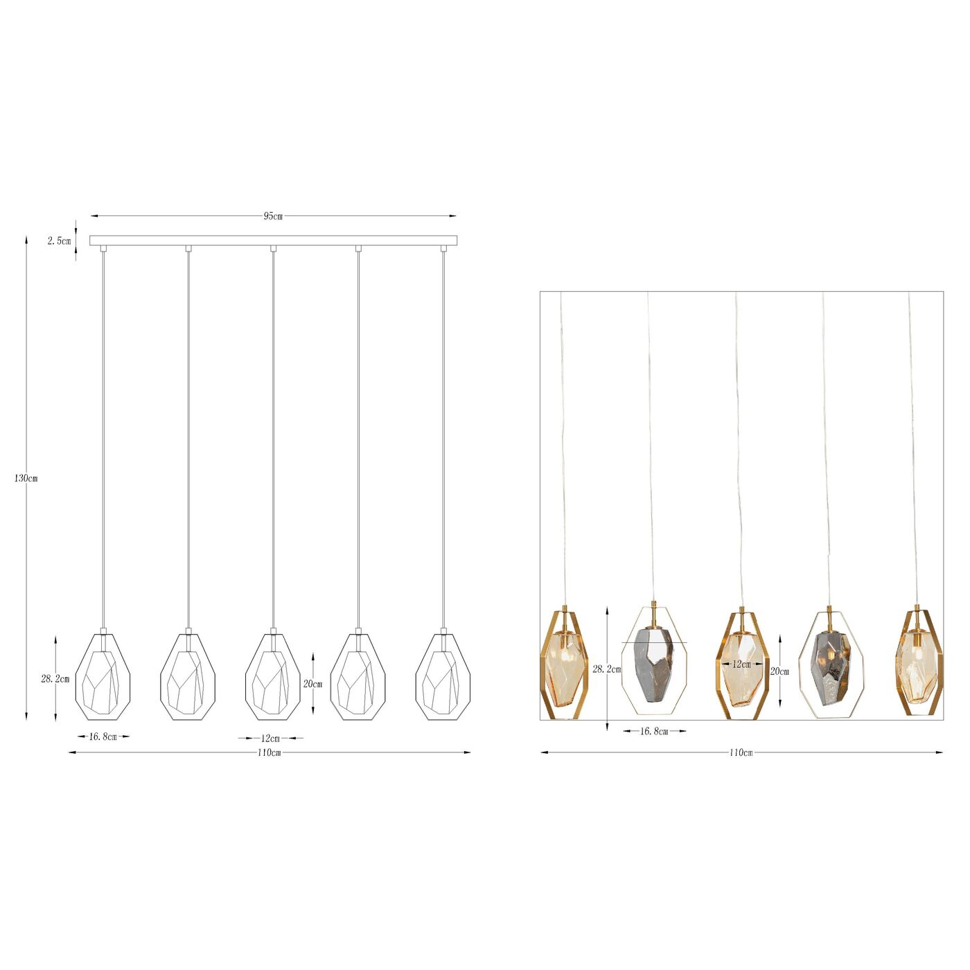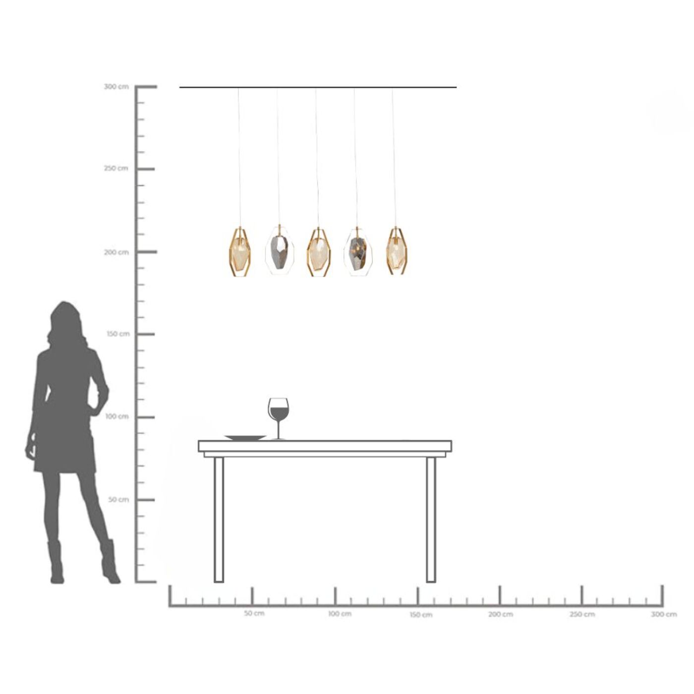 Avec sa taille et sa forme allongée, cette lampe à suspension dorée est idéale pour éclairer au-dessus de la table à manger. Les suspensions spectaculaires peuvent donner à chaque pièce une note exceptionnelle et attirent tous les regards. Avec son design raffiné et ses abat-jour en verre, cette lampe apporte une touche de style. Que ce soit dans le salon ou dans la salle à manger, cette suspension deviendra à coup sûr le point fort de votre intérieur. Procurez-vous dès maintenant cet accessoire unique et faites de votre intérieur un véritable point de mire. 230 V, 50/60 Hz, Douille G9, Nombre d´ampoules 5, max. 33 Watts, Ampoules non incluses, Ampoules remplaçables