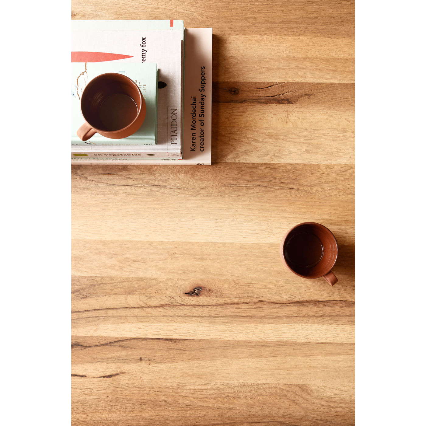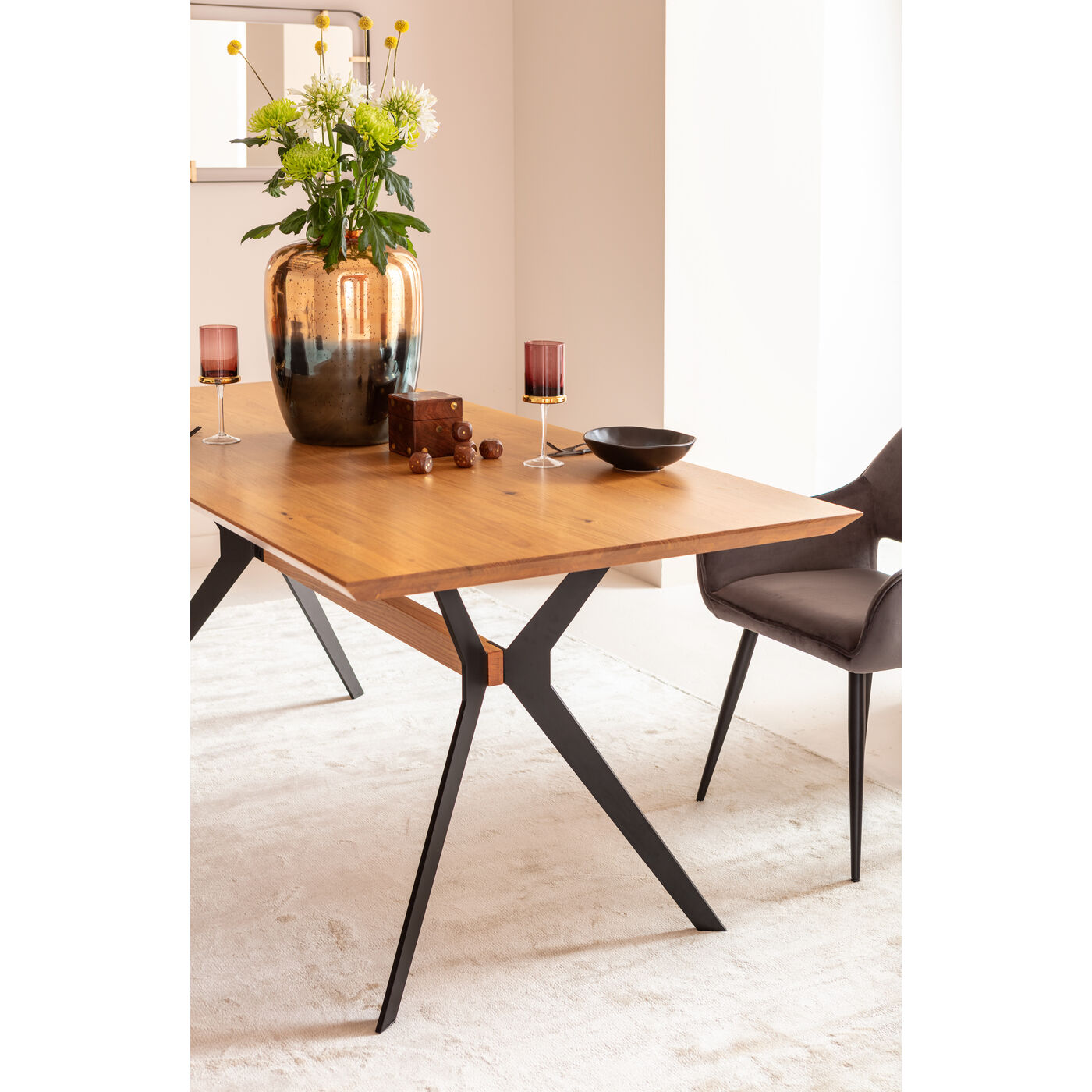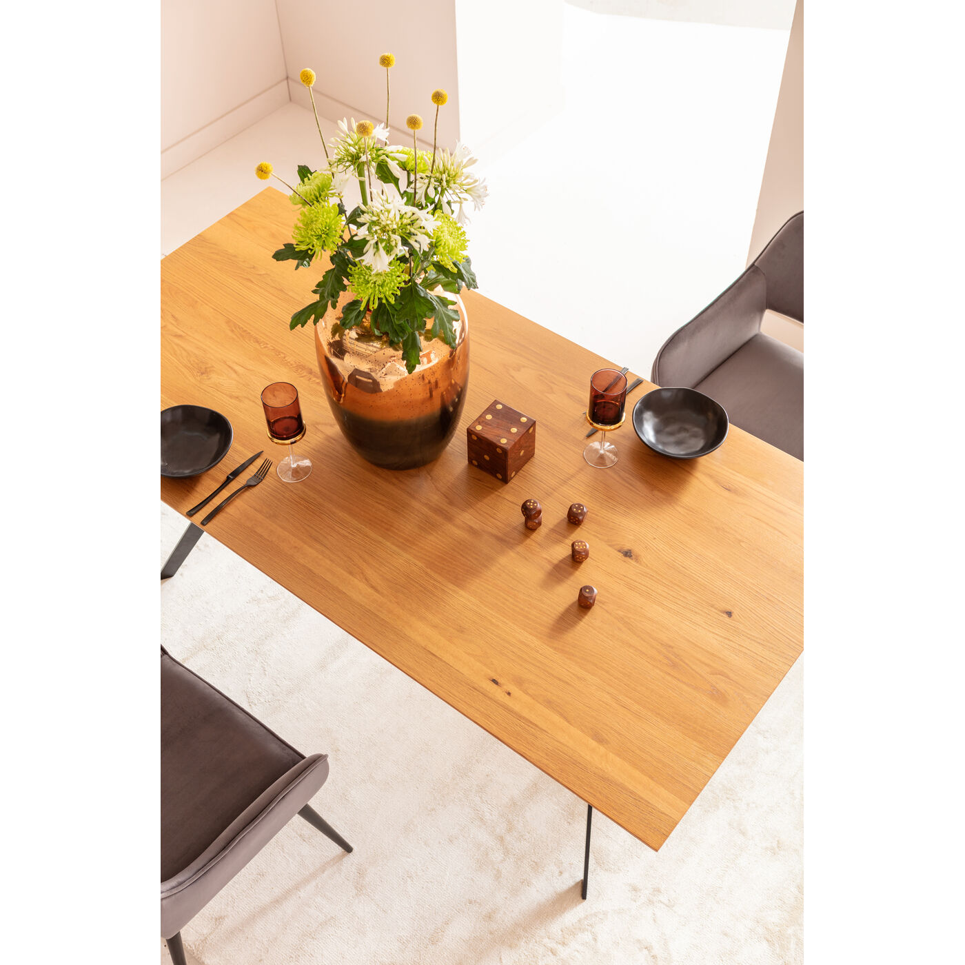 Tisch Downtown n’est pas un ami classique à quatre pattes – heureusement! Parce que sa base de forme dynamique en acier et en bois de chêne est non seulement particulièrement attrayante, mais garantit également plus d’espace pour les jambes. Le plateau en chêne huilé massif s’adapte habilement aux bords biseautés. Une table à manger design et certainement aussi bon à utiliser comme table d’écriture et de réunion.