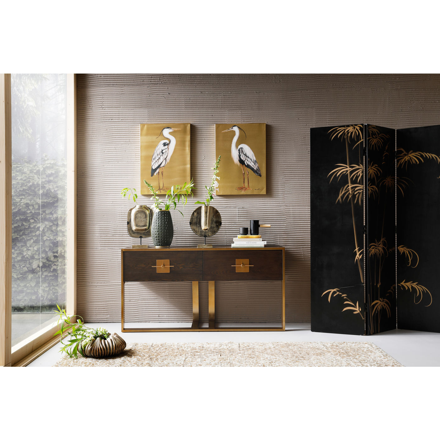 Edler, gold schimmernder Leinwanddruck mit dem Motiv eines Reihers. Das an japanische Kunstwerke erinnernde Wandbild ist mit Acrylfarbe teilweise von Hand veredelt. Kombinieren Sie mit weiteren Tier- und Naturmotiven für den schicken Galerie-Effekt. Weitere Varianten und Motive.