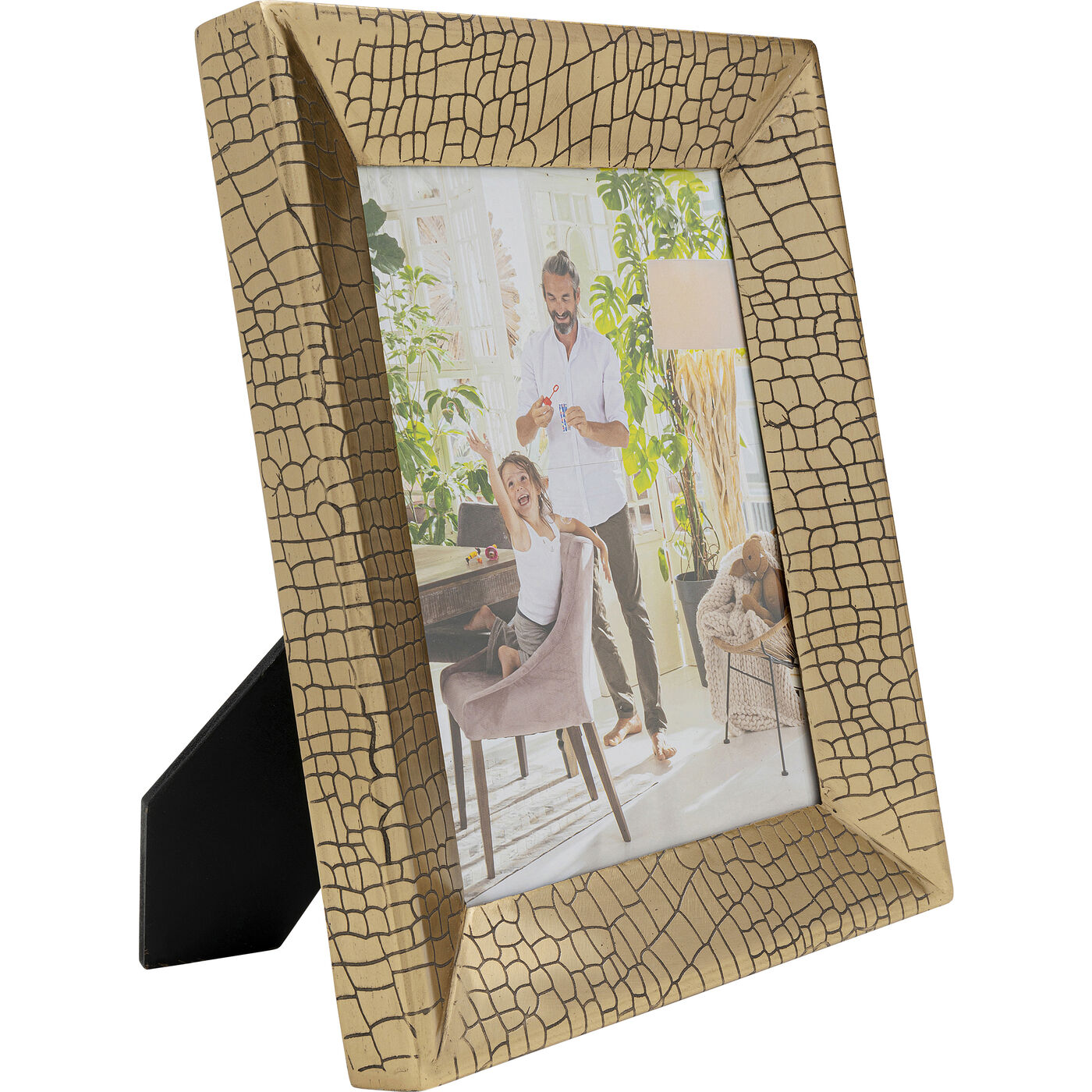 Dieser kleine Bilderrahmen in glänzendem Gold zieht mit seiner edlen Krokodiloptik alle Blicke auf sich. Aus robustem Stahl gefertigt, bietet er nicht nur eine lange Lebensdauer, sondern auch einen luxuriösen Akzent in jedem Raum. Perfekt, um besondere Fotos oder Kunstwerke stilvoll zu präsentieren, fügt sich dieser Rahmen ideal in moderne wie klassische Interieurs ein. Besonders gut macht er sich auf Sideboards oder als Teil einer Bildergalerie an der Wand.