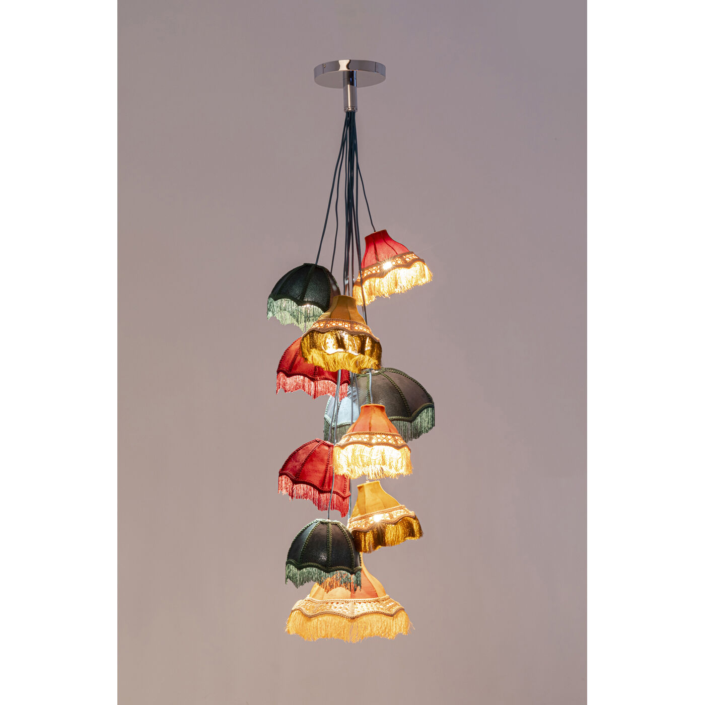 Ein leuchtendes Ensemble voller Nostalgie und Raffinesse: Diese opulente Hängeleuchte mit zehn individuell gestalteten Schirmen verführt mit zarten Fransen, seidigem Stoff und liebevollen Details. Gedeckte Farbnuancen in harmonischer Abstimmung verleihen dem Design eine ruhige, wohnliche Ausstrahlung – perfekt für stimmungsvolle Lichtinseln über dem Esstisch, im Wohnzimmer oder als romantisches Highlight im Schlafbereich. Die Kombination aus weichem Schimmer und Vintage-Anklängen bringt Wärme und Persönlichkeit in jeden Raum. Besonders ausdrucksstark in Interieurs mit Samt, Holz oder gemusterten Textilien. Eine Lichtquelle, die mehr als nur erhellt – sie erzählt Geschichten. 230 V, 50/60 Hz, Leuchtmitteltyp LED, Fassung E14, Anzahl Leuchtmittel 10, max. 4 Watt, Leuchtmittel nicht inklusive, Leuchtmittel austauschbar