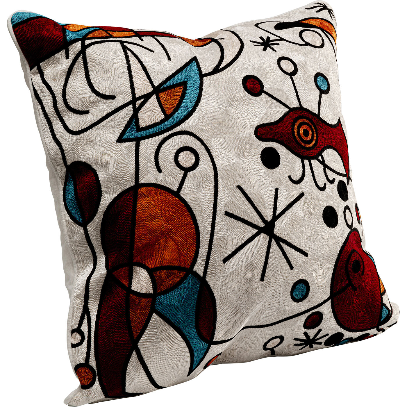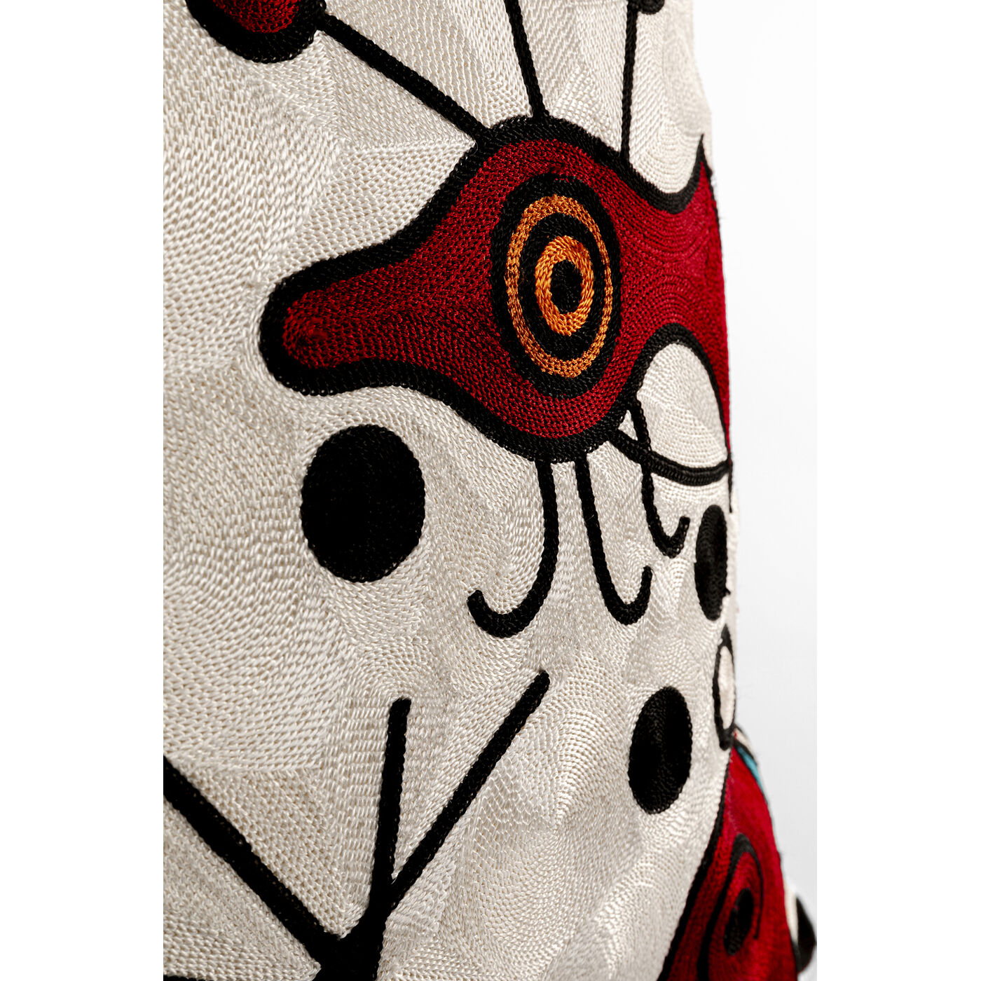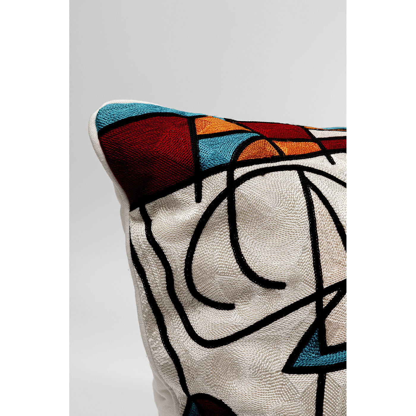 - Die Details in Schwarz und satten Farben wie Türkis und Rot kommen auf dem Beigen Kissen besonders zur Geltung
