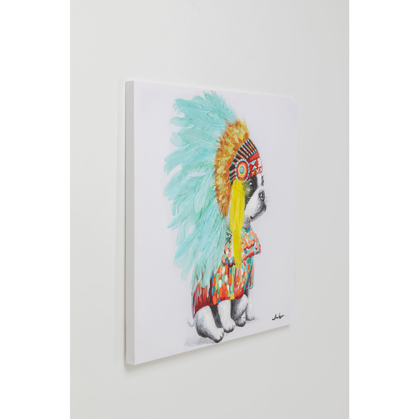 Wer auf Originelles mit einem Touch Verrücktheit steht, wird dieses Wandbild lieben: Ein Hund, der einen aufwändig gefertigten Kopfschmuck trägt. Ob es ein Bullie oder Boston-Terrier ist? Die großen türkisenen Federn in Kombination mit den übrigen Farben des Wandbilds setzen fröhliche, farbenfrohe Akzente. Das Bild ist teils in Handarbeit gefertigt. Die Neugierde beim Anblick dieses Gemäldes wird definitiv geweckt werden. Für Hundefans ein absolutes Highlight!