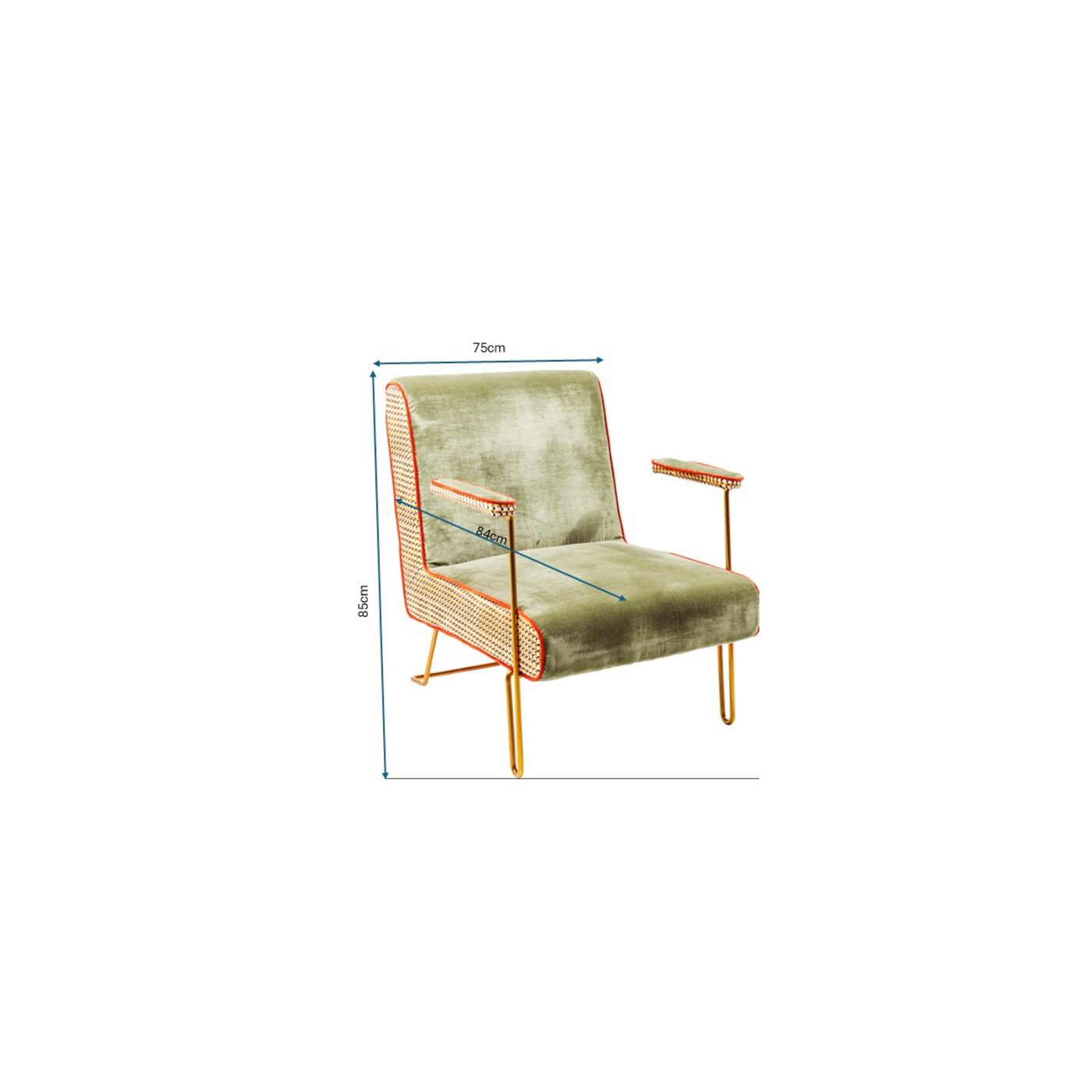 - Grüner Samt-Sessel im 50ies-Look mit dekorativen, farbigen Seiten-Details, filigranen Armstützen und Beinen aus Stahl in der Farbe Messing