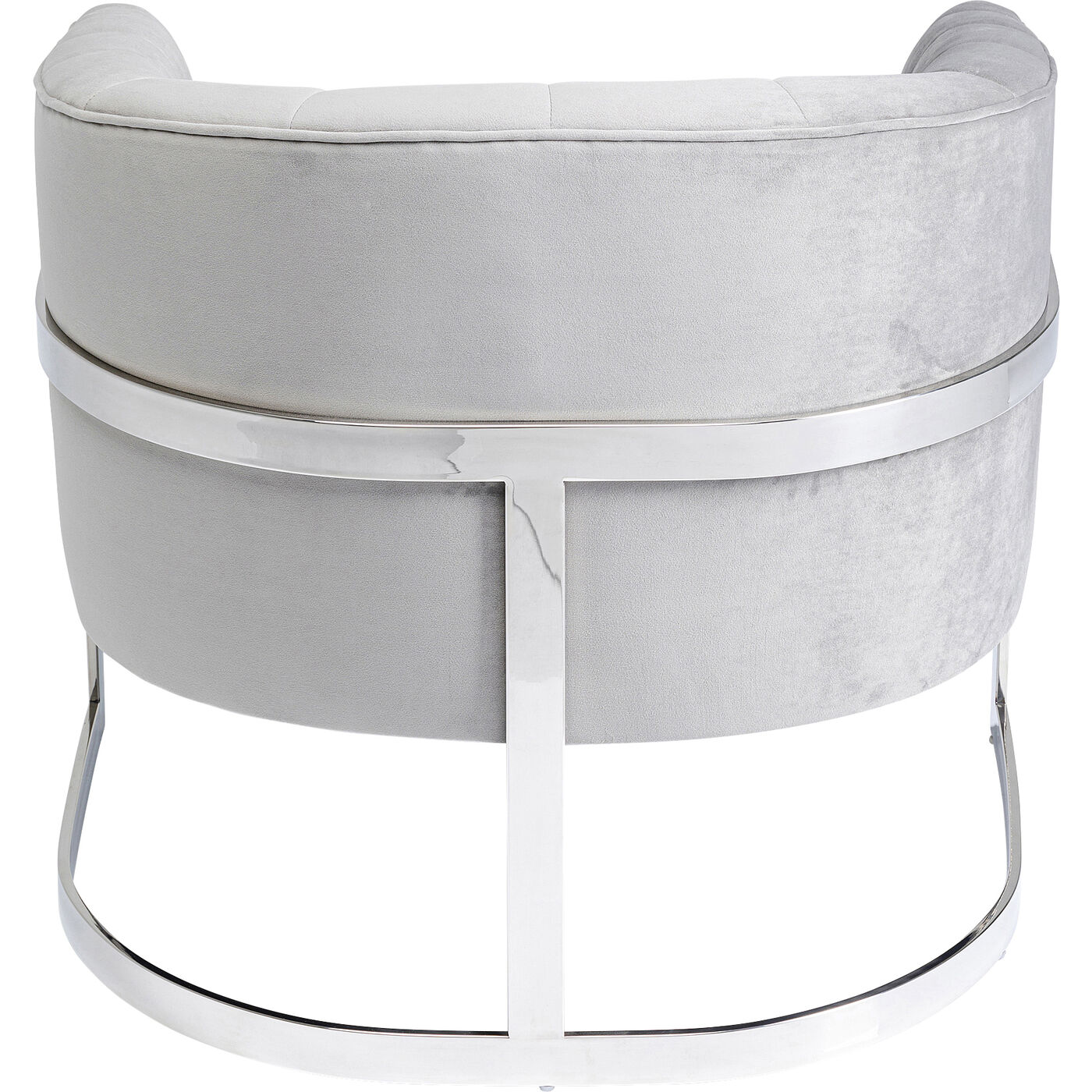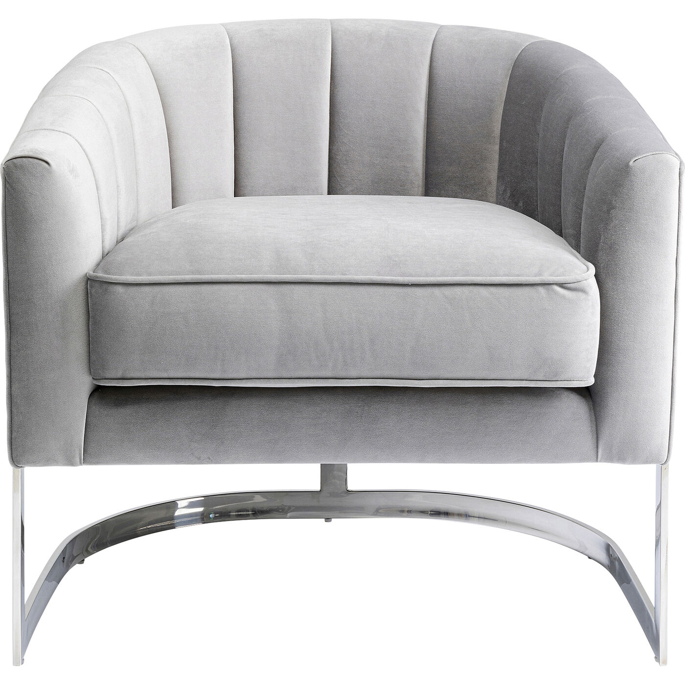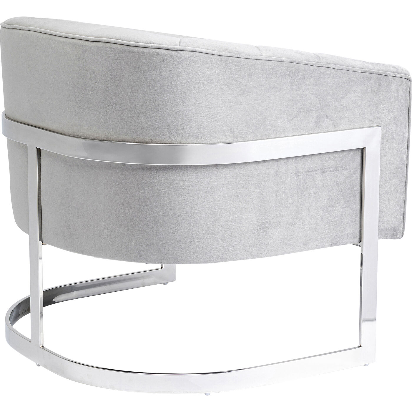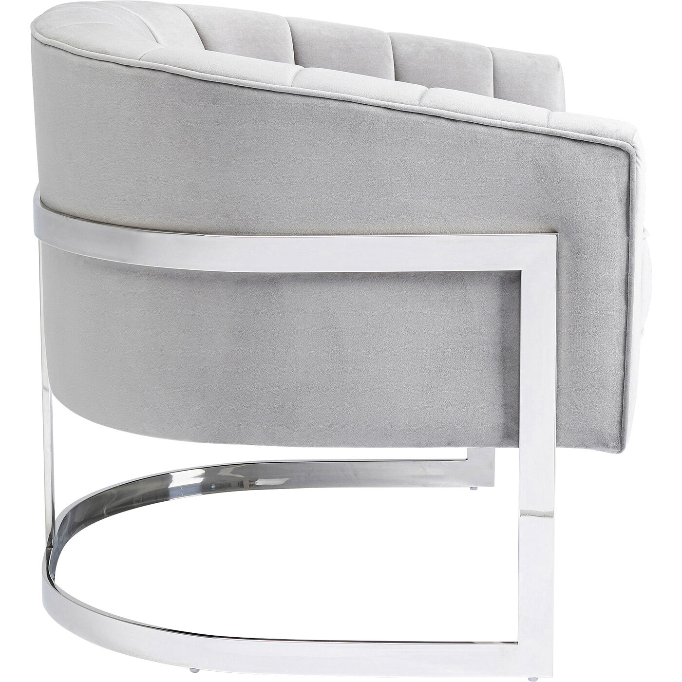 Wie aus einem stilvollen Loungebereich im Luxushotel wirkt dieser Armlehnsessel im Art-déco-Stil. Das verchromte Gestell und das edle Grau verleihen dem samtig-weichen Polstersessel pure Eleganz, die gepolsterte, durchgehende Seiten- und Rückenlehne mit gesteppten Ziernähten und das Sitzkissen sorgen für höchsten Sitzkomfort. Mit diesem Sessel setzen Sie ein Statement, egal ob Sie ihn als Einzelstück oder stilvoll als Sitzgruppe einsetzen.