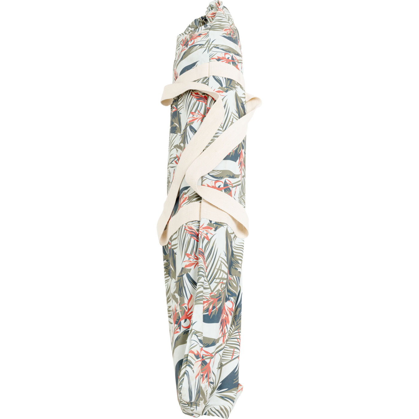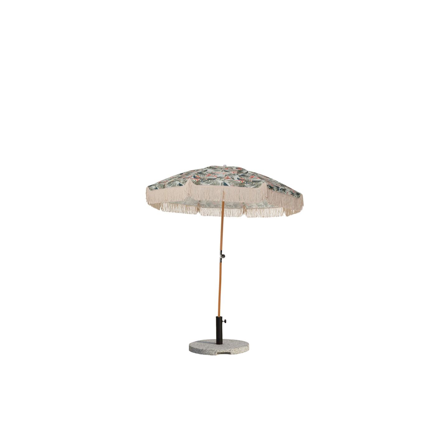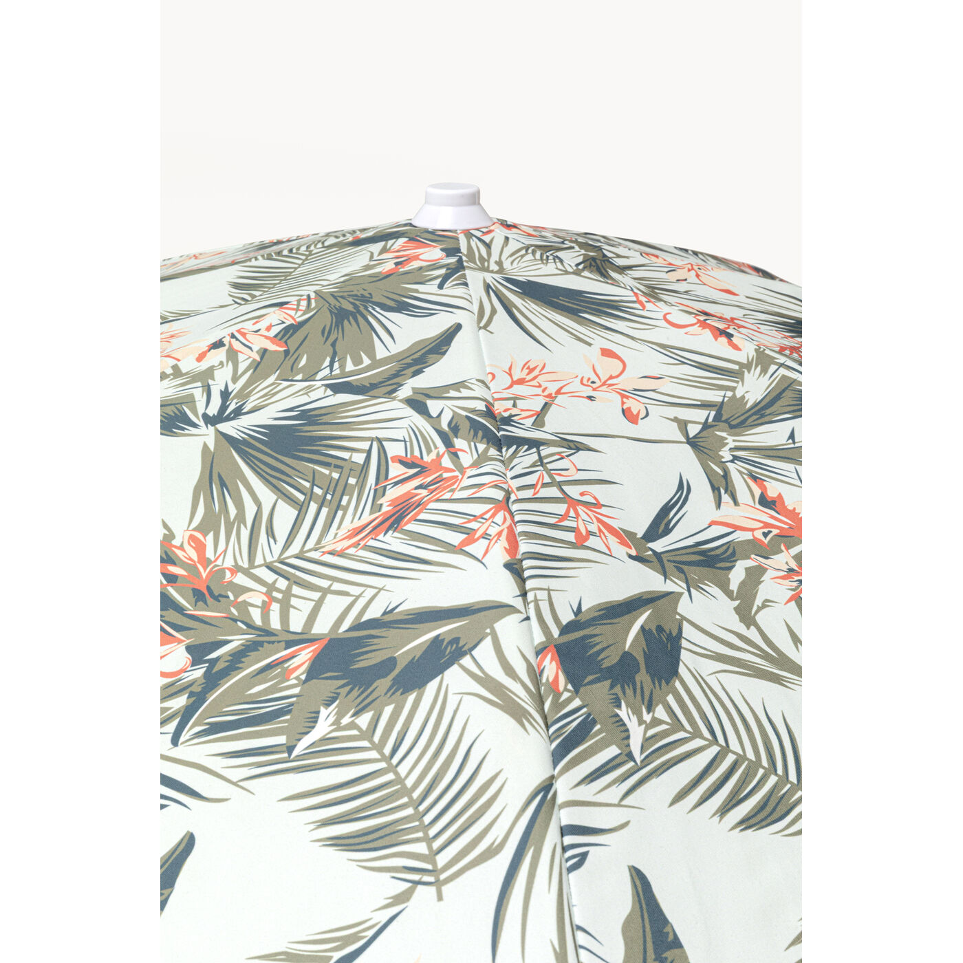 Dieser Sonnenschirm verbreitet pure Sommerstimmung. Mit seinem exotischen Design aus tropischen Blättern in natürlichen Grün-Nuancen und sanften Blüten setzt er einen farbenfrohen Akzent im Garten oder auf der Terrasse. Die raffinierten, geflochtenen Fransen und der robuste Mast aus Buche verleihen dem Schirm sowohl Stabilität als auch einen natürlichen Look. Ideal, um bei Gartenpartys oder entspannten Stunden im Freien großzügigen Schatten zu genießen – perfekt kombiniert mit Holz- oder Rattanmöbeln für ein harmonisches Gesamtbild