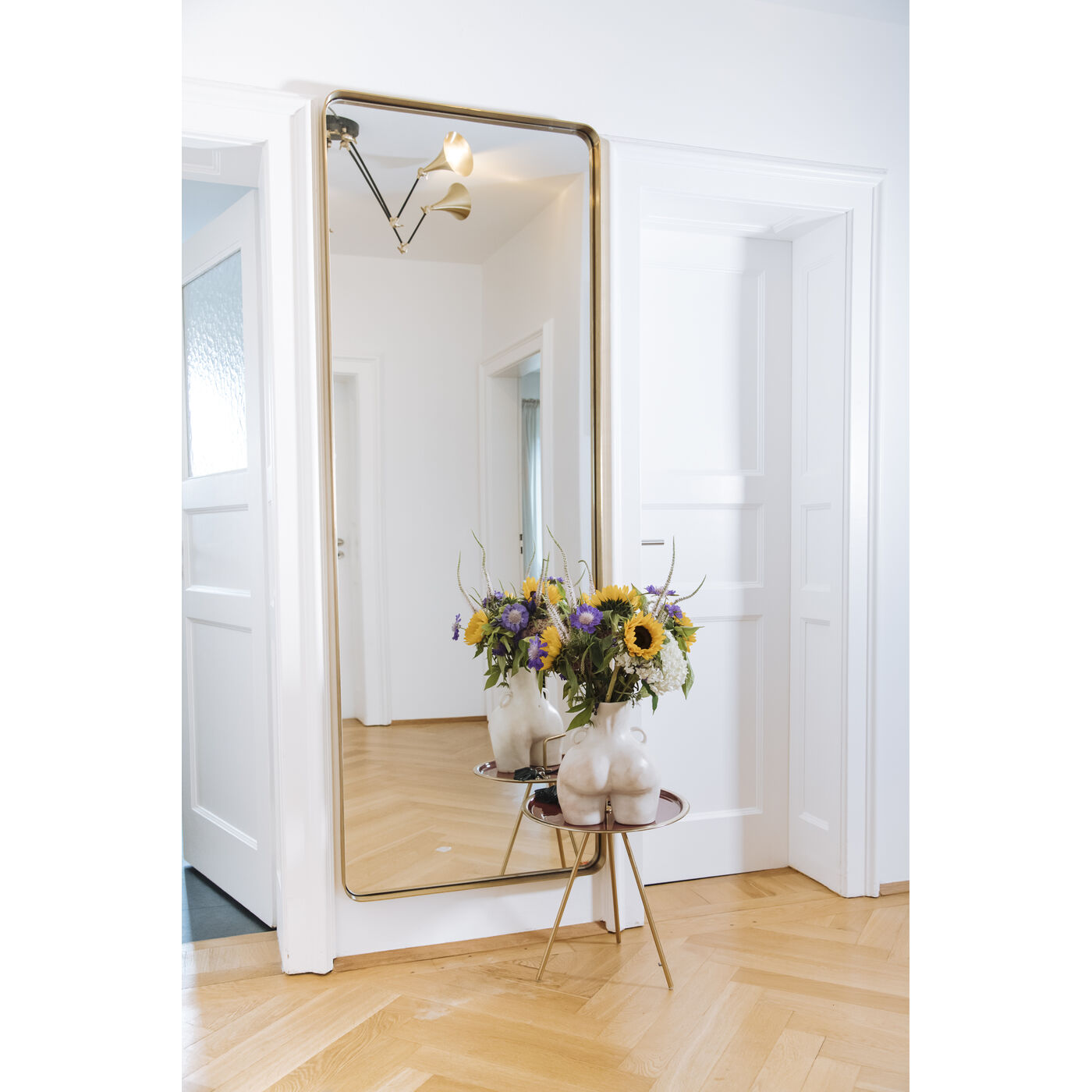 Ohne Wände zu versetzen: Still und stilvoll erweitert Spiegel Curve kleine Räume – oder macht große Zimmer noch größer. Feine Details wie die abgerundeten Ecken und der extrem schmale, messingfarbene Rahmen lassen ihn geradezu vornehm anmuten.SpiegelflächeGlas: Glas verspiegelt, Rahmen: Stahl messing beschichtet, Spiegelfläche