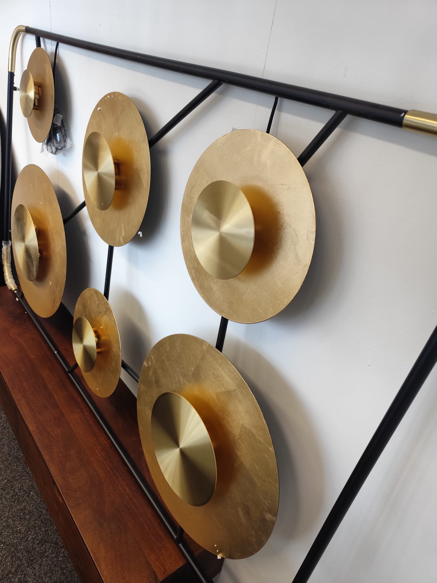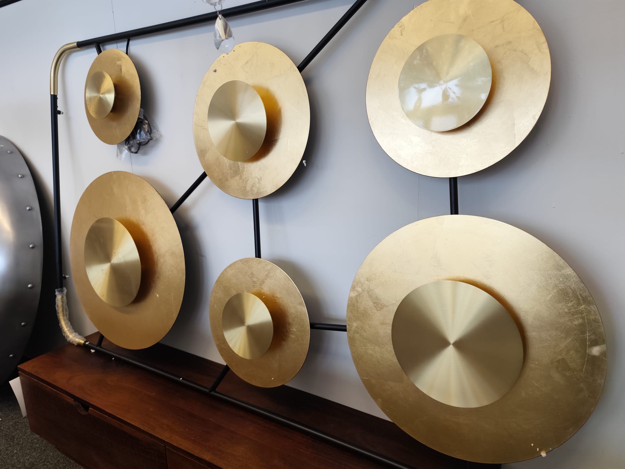 - Großes Leuchtobjekt für die Hängung an einer Wand mit sechs runden, mattgolden schimmernden Leuchtkörpern