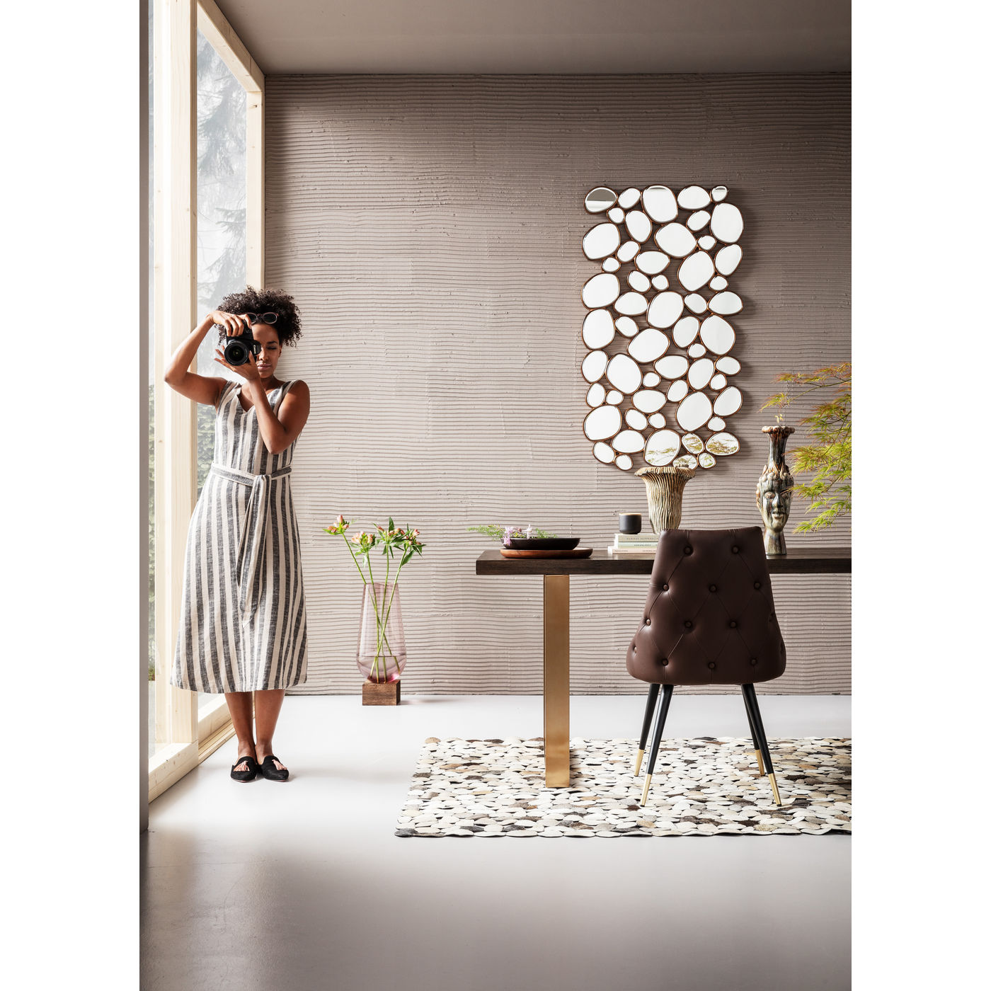 Ein Schminktisch, so einzigartig wie seine Nutzerin: Über dem teils schwarz lackierten und teils aus Walnuss-Furnier gefertigten Korpus schwebt ein runder Spiegel. Der perfekte Ort, um extravagante Make-up-Looks zu kreieren. Inspirierende Glamour-Magazine finden im Ablagefach Platz, Beauty-Geheimnisse verschwinden diskret im aufklappbaren Schubfach. Doch Sie brauchen nicht unbedingt extra Raum für einen eigenen Schminkplatz. Vanity leistet auch als praktisches, stylisches Möbel im Flur hervorragende Dienste.70 kg max. Belastbarkeit Lieferung zerlegtGestell: Stahl pulverbeschichtet, Tischplatte: mitteldichte Faserplatte lackiert, Walnuss Furnierschichtholz furniert, Griffe: Stahl messing beschichtet, Glas verspiegelt (Spiegel bewegbar), 70 kg max. Belastbarkeit, Lieferung zerlegt