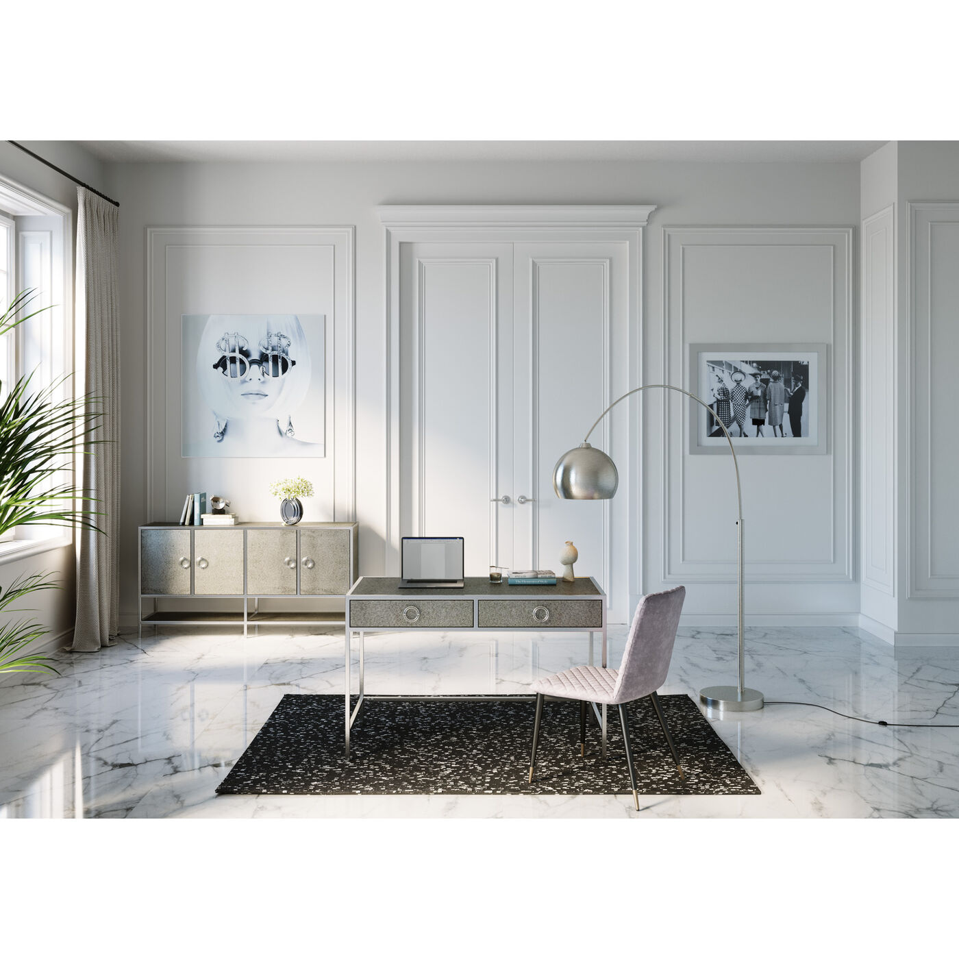 Ein echtes Schmuckstück, der Schreibtisch Moonscape! Mit seinem silbernen Edelstahl-Gestell, den extravagant verspiegelten Glas-Flächen und den ringförmigen Griffen an den beiden Schubladen ist das Möbelstück eine glamouröse Bereicherung fürs Home Office. Ein traumhaft-schönes Design, das die Herzen aller Luxus-Fans höher schlagen lässt!Lieferung teilzerlegtRahmen: Edelstahl poliert, Korpus: mitteldichte Faserplatte lackiert, Griffe: Stahl verchromt, Verkleidung: Glas beschichtet, Lieferung teilzerlegt