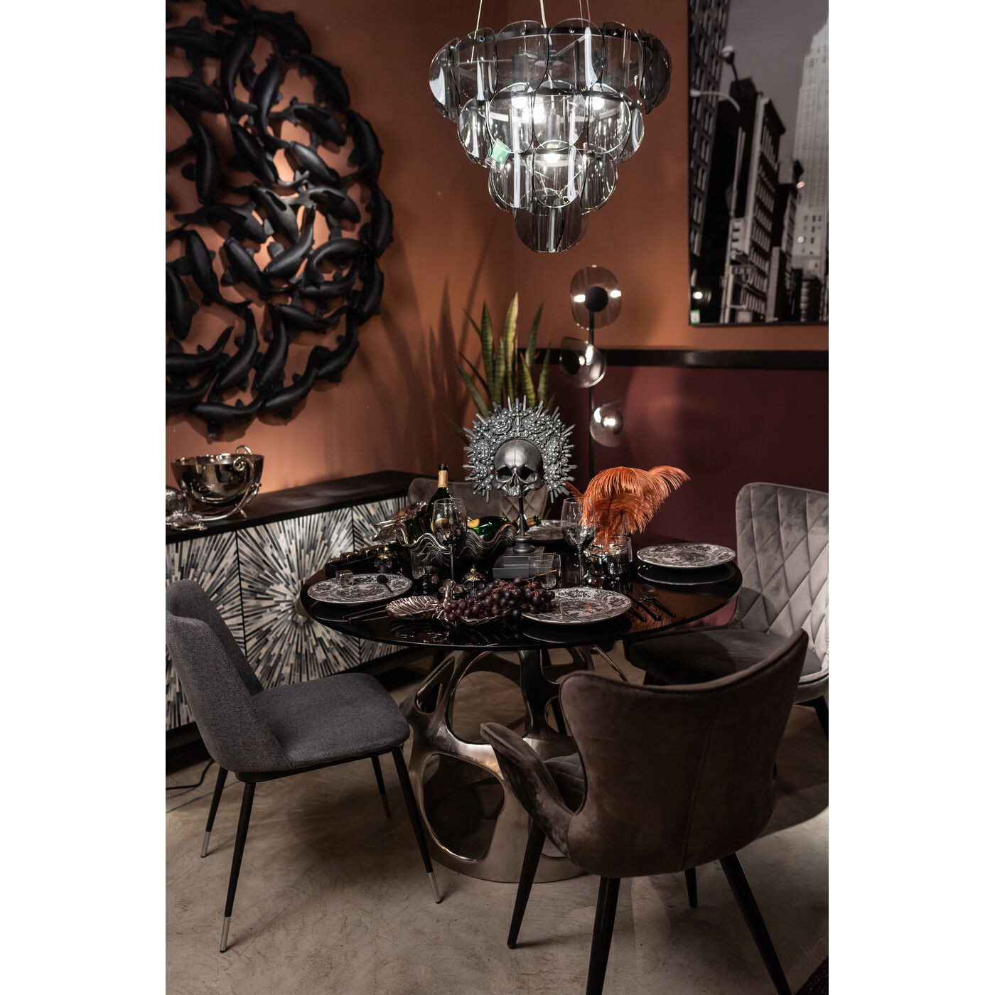 Ein bisschen Glamour hat noch niemandem geschadet. Dieser Esstisch könnte auch als moderne Möbelskulptur im Museum stehen. Er beeindruckt mit gestalterischer Raffinesse und einer eleganten, leicht exzentrischen Note. Die Tischplatte aus 13 mm starkem Sicherheitsglas wird getragen von zwei kunstvoll geformten, chromfarbenen Beinen. Ein traumhaft schöner Tisch, der sich besonders gut in einer glamourös-eklektischen Einrichtung macht und einen Hauch an Hollywood-Appeal in Ihr Zuhause bringt. Weitere Ausführungen erhältlich.40 kg max. BelastbarkeitGestell: Stahl verzinkt, Tischplatte: Glas Sicherheitsglas ESG klar, 40 kg max. Belastbarkeit