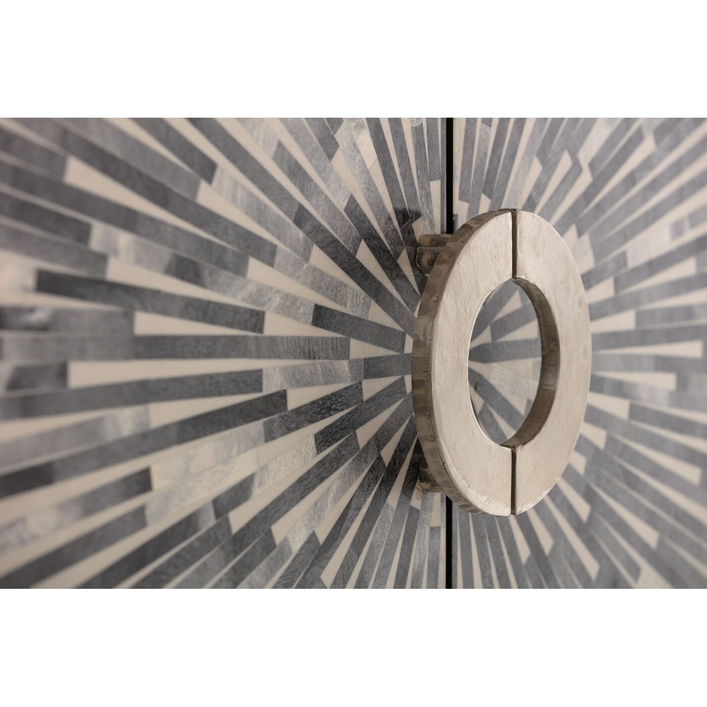 Wenn Sie Ihre Finger über die glatte Front mit den Intarsien-artigen Arbeiten gleiten lassen und die gehämmerten Oberflächen des runden Korpus entdecken, dann können Sie erahnen, wie viel Zeit und Detailwissen in diesem handgearbeitetem Möbel stecken. Da jedes Stück dieser Wohnzimmerschränke ein Unikat ist, gleicht kein Exemplar dem anderen. Immer aber fasziniert das strahlenförmige Muster in verschiedenen Grau-Tönen. Das Gestell des Schranks aus pulverbeschichtetem Stahl hält sich optisch zurück, um der runden Schrankform die Hauptrolle zu überlassen. Konzipiert als Hausbar, in der Sie unten auch einige Flaschen liegend lagern können, kann Zoom als Design-Objekt auch an anderen Stellen des Hauses glänzen. Wie würde sich dieser Schrank zum Beispiel im Schlafzimmer für feine Wäsche oder die Parfum-Sammlung machen? Was würden Ihre Gäste denken, wenn Sie Zoom als dekorativen Flurschrank präsentieren und nutzen? Ein handgearbeitetes und aus hochwertigen Materialien gefertigtes Designer-Möbel wie dieses wird sicher immer wieder einen Platz finden, ein Stück mit Charakter, das seinen Wert nicht verliert.Fachboden: 15 kg max. Belastbarkeit Fachboden: fest montiert handgearbeitet jedes Stück ein Unikat zerlegt Soft-Close Scharniere justierbarGestell: Stahl pulverbeschichtet, Korpus: mitteldichte Faserplatte lackiert ,Nickelblech beschichtet, Rückwand: mitteldichte Faserplatte lackiert, Fachboden: Mango mitteldichte Faserplatte lackiert, Griffe: Stahl satiniert, Tür: Mango Massivholz geölt, Epoxidharz (Intarsien), Fachboden: 15 kg max. Belastbarkeit, Fachboden: fest montiert, handgearbeitet, jedes Stück ein Unikat, zerlegt, Soft-Close, Scharniere justierbar