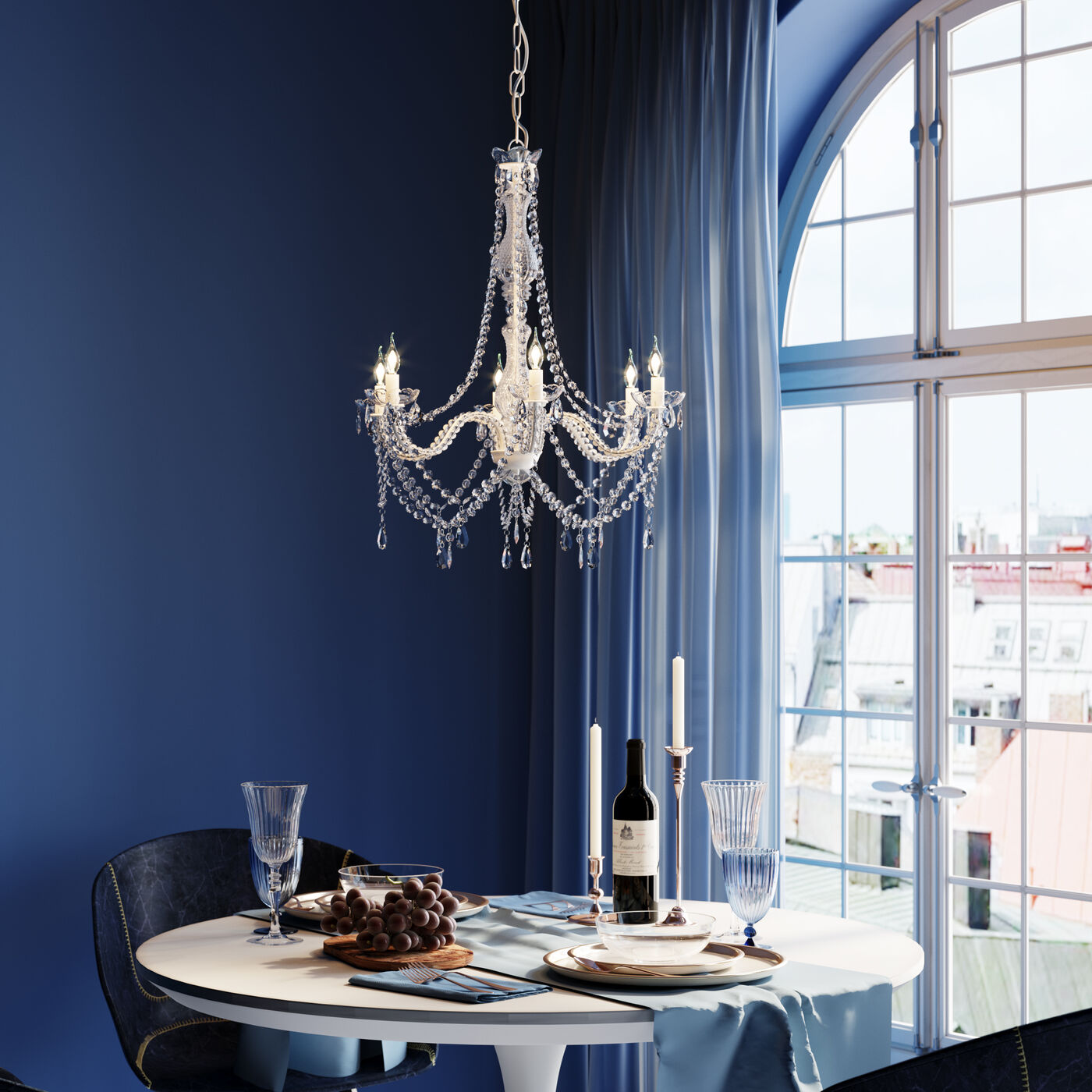 Lampe: Glamouröser Kronleuchter mit Glitzerfaktor Wie eine barocke Symphonie in Form einer stilvollen Hängeleuchte mit vielen opulenten Details präsentiert sich der sechsarmige Kronleuchter Starlight Clear. Mit unzähligen funkelnden Kunstkristallen besetzt sorgt sie für ein glamouröses Flair und zaubert dabei stimmungsvolle Lichteffekte in den Raum. Arme aus Acryl sorgen für eine hohe Stabilität der Hängeleuchte. Ein eindrucksvoller Blickfang, der jedem Ambiente eine außergewöhnliche, stilvolle Note verleiht. 230 V, 50/60 Hz, Leuchtmitteltyp LED, Fassung E14, Anzahl Leuchtmittel 6, max. 25 Watt, Leuchtmittel nicht inklusive117 cm Abhängung Kabel kunststoffummantelt 55 cm Durchmesser teilzerlegtStahl pulverbeschichtet (Gestell), Acryl (Ketten, Elemente), 117 cm Abhängung, Kabel kunststoffummantelt, 55 cm Durchmesser, teilzerlegt,
