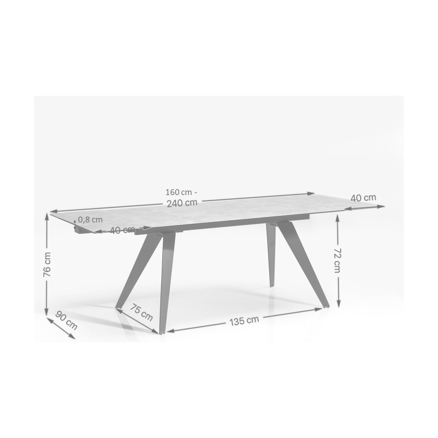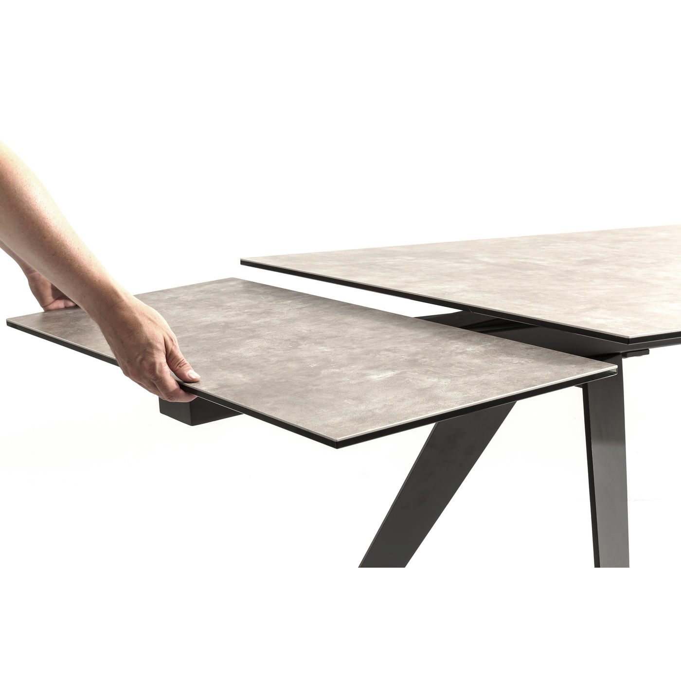 Großer, hochwertiger Esstisch, der Funktionalität mit Ästhetik vereint. Mit der unkomplizierten und schnellen Ausziehfunktion ist der Tisch nicht nur sehr praktisch, er überzeugt auch mit einer beeindruckenden Keramik-Tischplatte im Vintage-Look. Der perfekte Tisch für alle, die einen Hingucker im Speise- bzw. Wohnzimmer suchen und sich die Spontanität bereithalten wollen, aus kleinen Dinner-Runden im Handumdrehen eine große Dinner-Party zu starten!