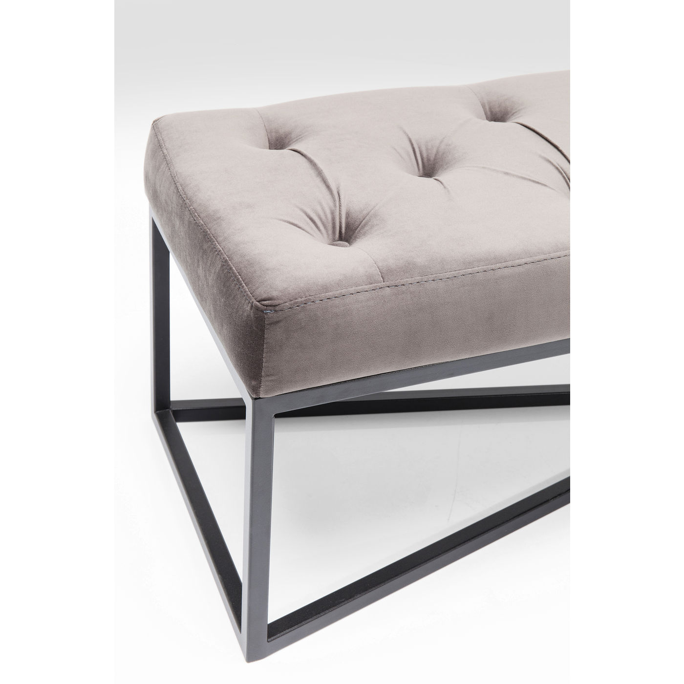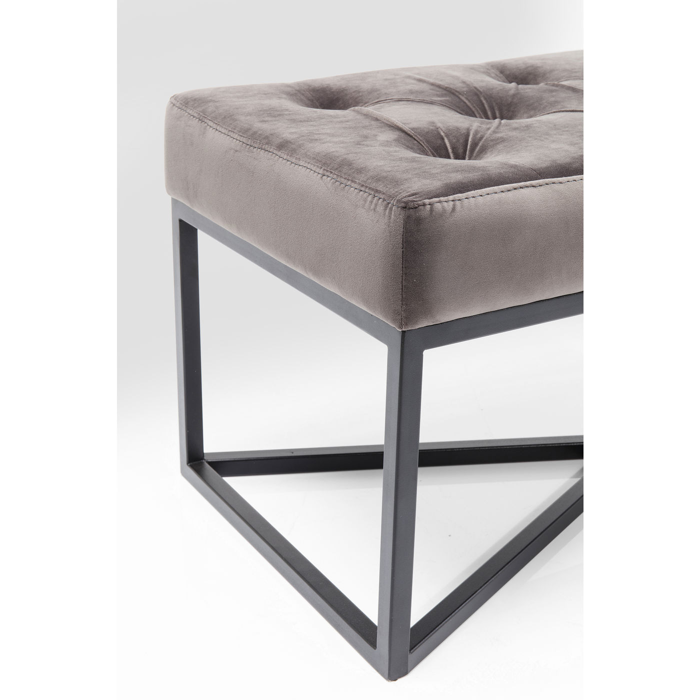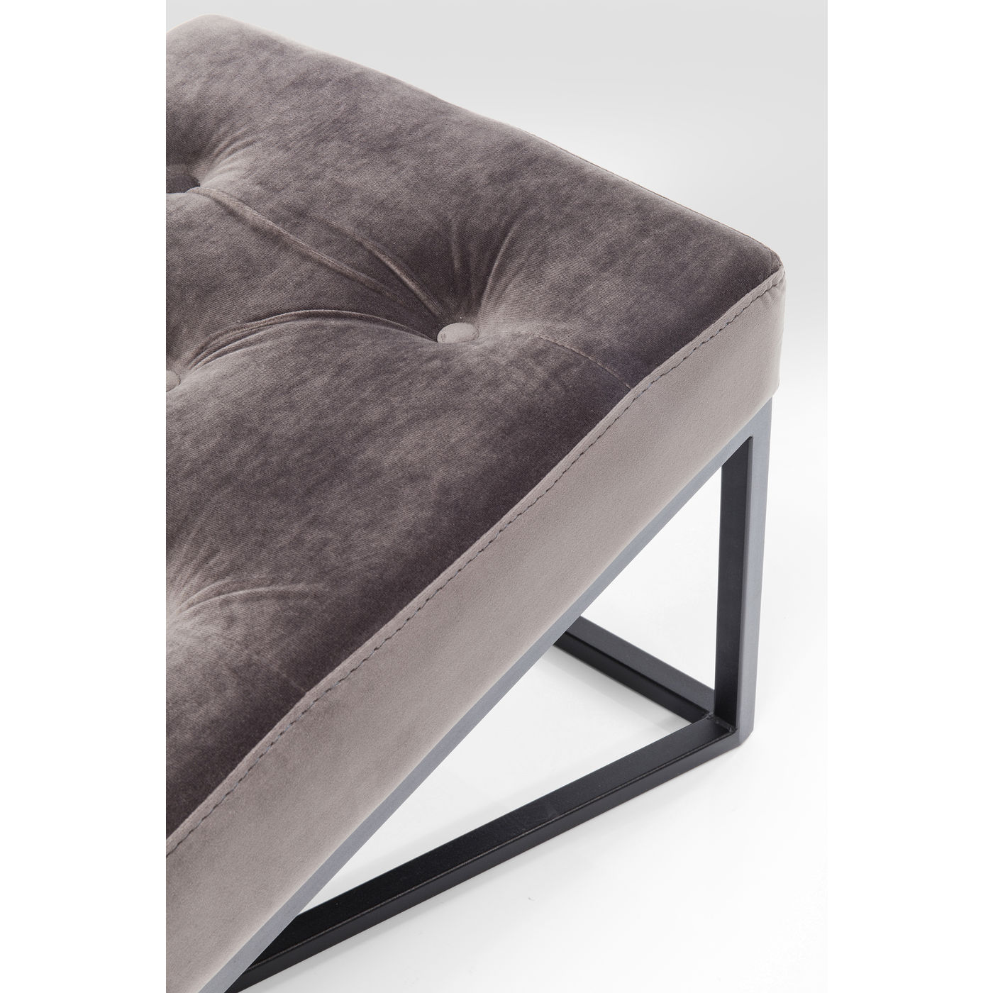 - Urbane Eleganz: gepolsterte Sitzbank mit aufwendiger Knopfheftung, grauem Bezug in Samtoptik und schwarz lackiertem Gestell
