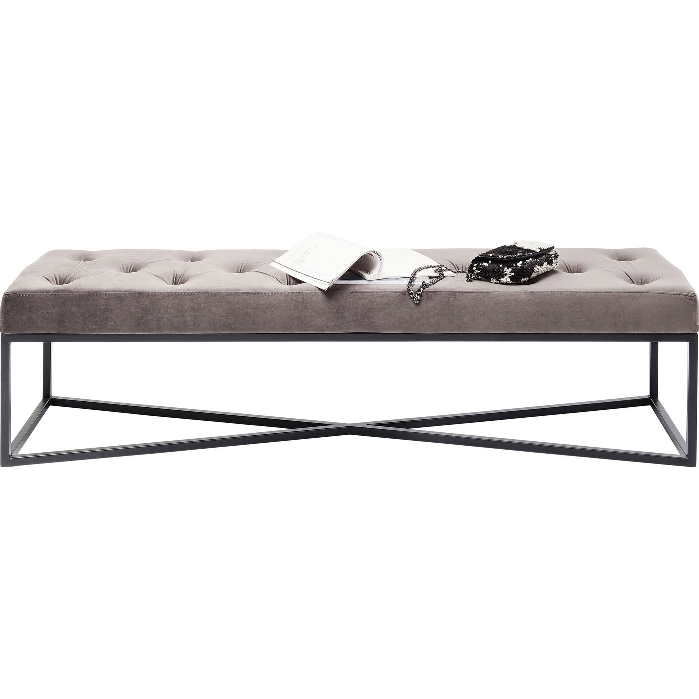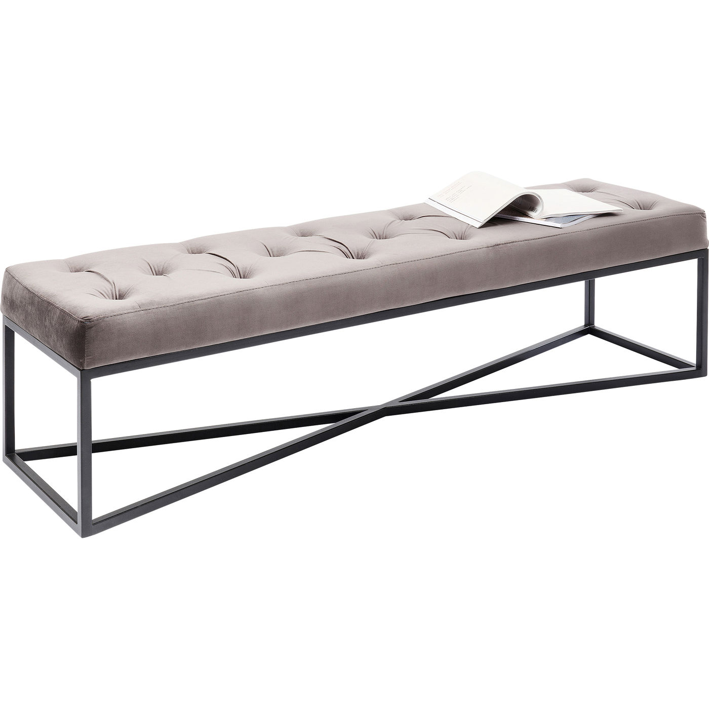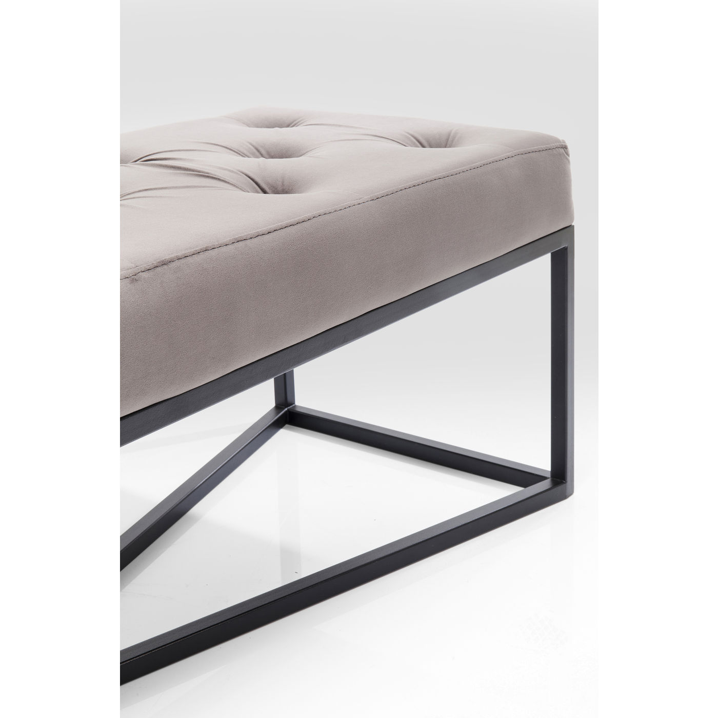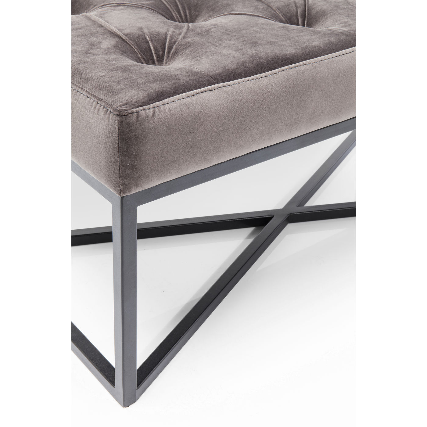 - Urbane Eleganz: gepolsterte Sitzbank mit aufwendiger Knopfheftung, grauem Bezug in Samtoptik und schwarz lackiertem Gestell