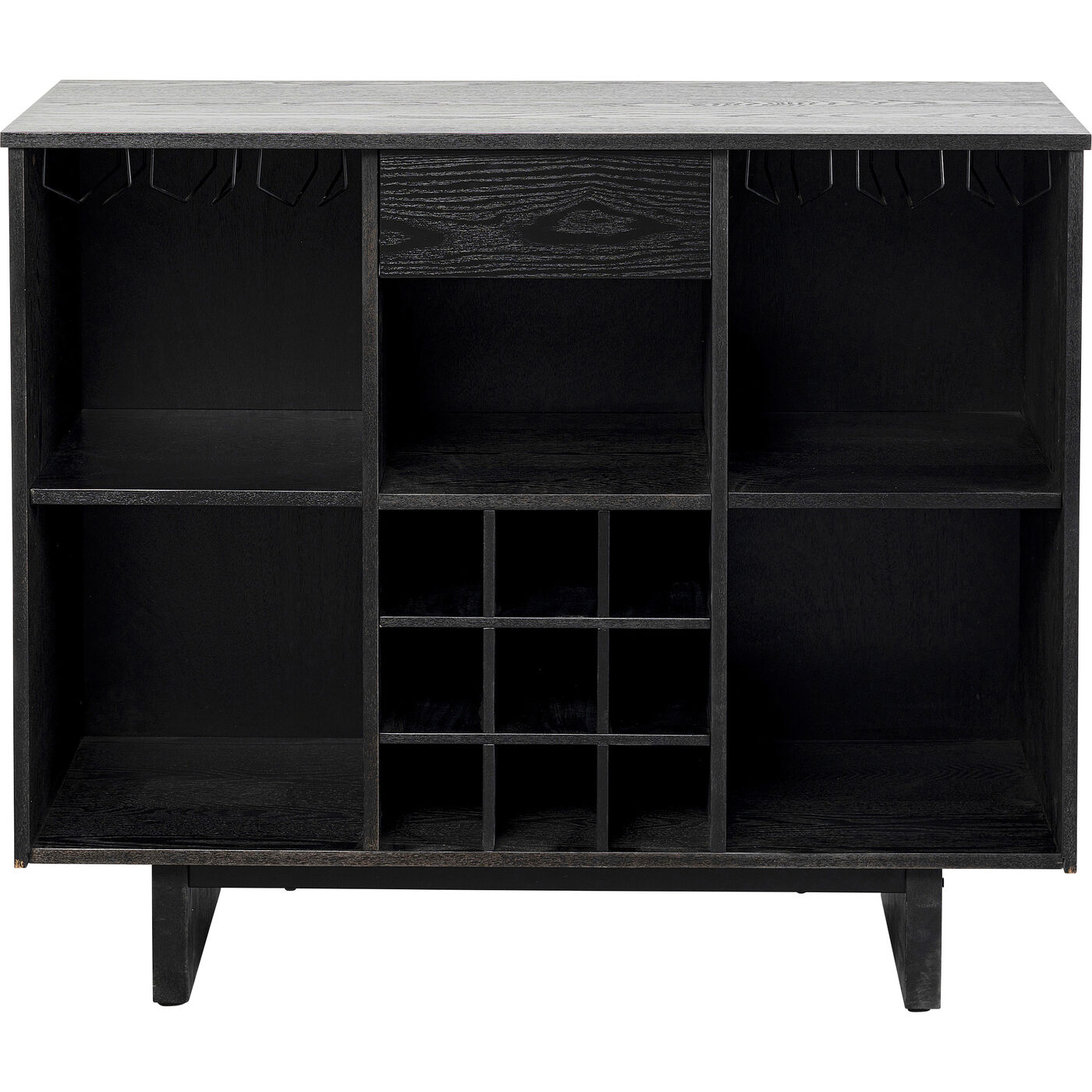 Dieser Bartresen für das Wohnzimmer glänzt durch hochwertige Materialien und einen einzigartigen Look. Seine Front schimmert je nach Lichteinfall unterschiedlich. Pezioso punktet aber nicht nur mit seinem coolen, modernen Design. Auf der Rückseite finden sich eine Schublade, ein Flaschenregal, große Fächer und Schienen, um Stielgläser sicher aufzubewahren.
