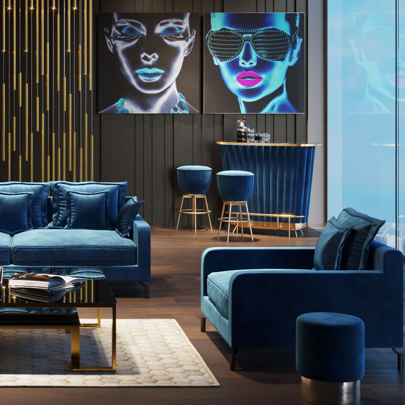 Sie suchen die Idealbesetzung für den glamourösen Hollywood-Look? Dann kommen Sie an Hocker After Work mit hohem, aufwendig gepaspeltem Polster und goldfarben lackierten Edelstahlbeinen nicht vorbei. Passend zum Hocker im Vintage-Design gibt es eine elegante Bar mit Polsterfront und einem Tresen aus schwarzen Glas.