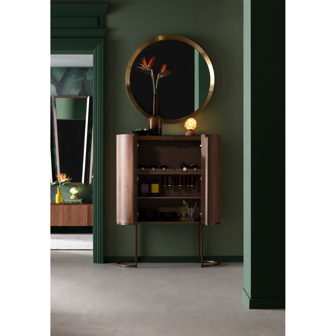 Die Möbel aus der Giorgio -Kollektion bringen anspruchsvolles Design und wohnliche Eleganz gekonnt auf den Punkt. Ausdrucksstarkes Holz trifft auf edle Glasakzente, die dem Gesamtbild Tiefe und einen Hauch von Glamour verleihen. Abgerundete Linien und filigrane Metallfüße sorgen für eine moderne Leichtigkeit, die trotzdem Bodenständigkeit ausstrahlt. Dieser Barschrank wird zum stilvollen Blickfang – perfekt, um Gläser, Flaschen und Barzubehör elegant zu inszenieren und gleichzeitig dezent zu verstauen. Innen überrascht er mit durchdachter Aufteilung und cleveren Details, die das Mixen und Servieren zum Erlebnis machen. Innen punktet die Kollektion mit viel Platz für Lieblingsstücke und Alltagshelfer – außen mit einem Look, der Eindruck hinterlässt. Ideal für stilvolle Wohnkonzepte, die Wert auf Charakter, Komfort und Qualität legen.