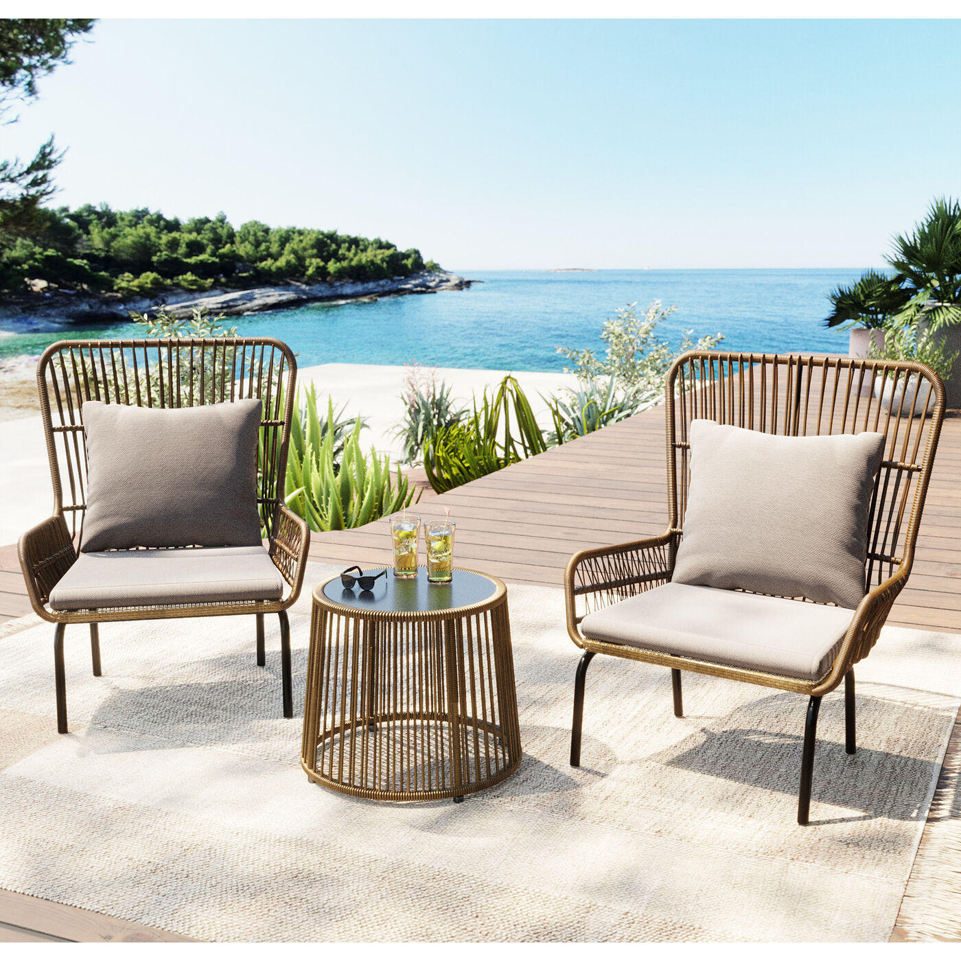 Ein vielseitiger Begleiter für jede Outdoor-Oase! Dieser kompakte Beistelltisch vereint Funktionalität mit Stil und bietet eine praktische Ablage für Getränke, Snacks oder Deko-Accessoires. Die Kombination aus einer eleganten Glasplatte und einem geflochtenen Gestell in Natur-Optik setzt moderne Akzente, während das robuste Stahlgestell für Stabilität sorgt. Dank seiner leichten Bauweise lässt er sich flexibel umstellen – perfekt für Balkon, Terrasse oder Garten. Klein, aber wirkungsvoll, ergänzt er Loungemöbel harmonisch und schafft eine gemütliche Atmosphäre im Außenbereich
