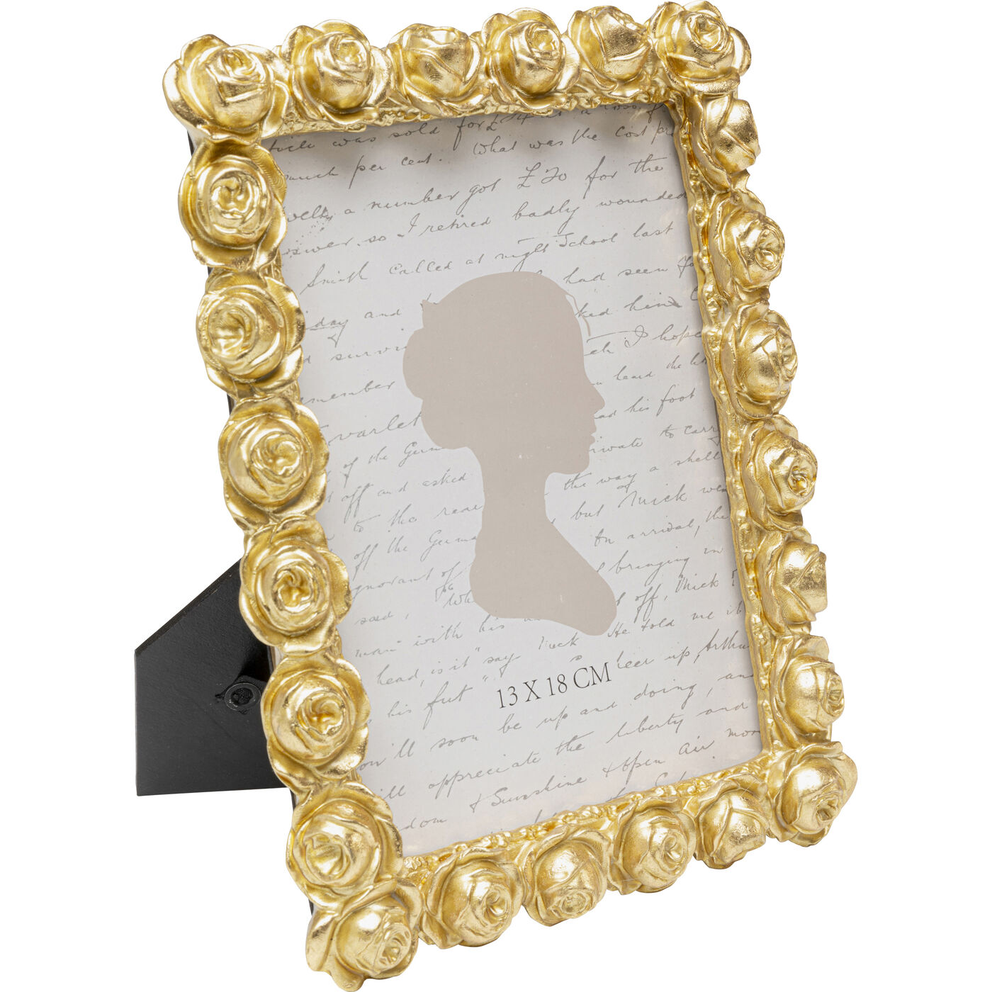 Ein Hauch Romantik in Gold: Dieser kunstvoll verzierte Bilderrahmen bringt mit zarten Rosenornamenten und edlem Finish eine verspielte Eleganz ins Zuhause. Die fein modellierten Blüten verleihen Lieblingsfotos einen stilvollen Rahmen und setzen Erinnerungen gekonnt in Szene – sei es als Teil einer stimmungsvollen Bildergalerie oder als Solostar auf Kommode, Fensterbank oder Schreibtisch. In glänzendem Goldton gehalten, fügt sich das dekorative Accessoire mühelos in glamouröse Interieurs ein und sorgt für charmante Highlights im Mix mit Vintage-Objekten, floralen Prints oder eleganten Metallic-Tönen. Ein kleines Schmuckstück mit großer Wirkung.