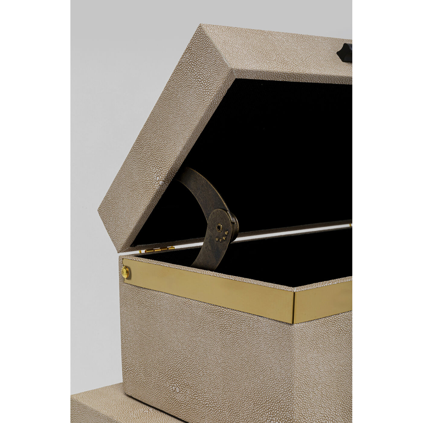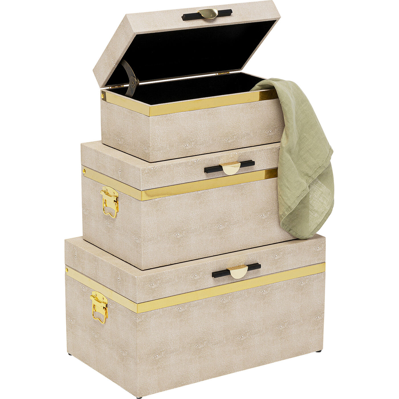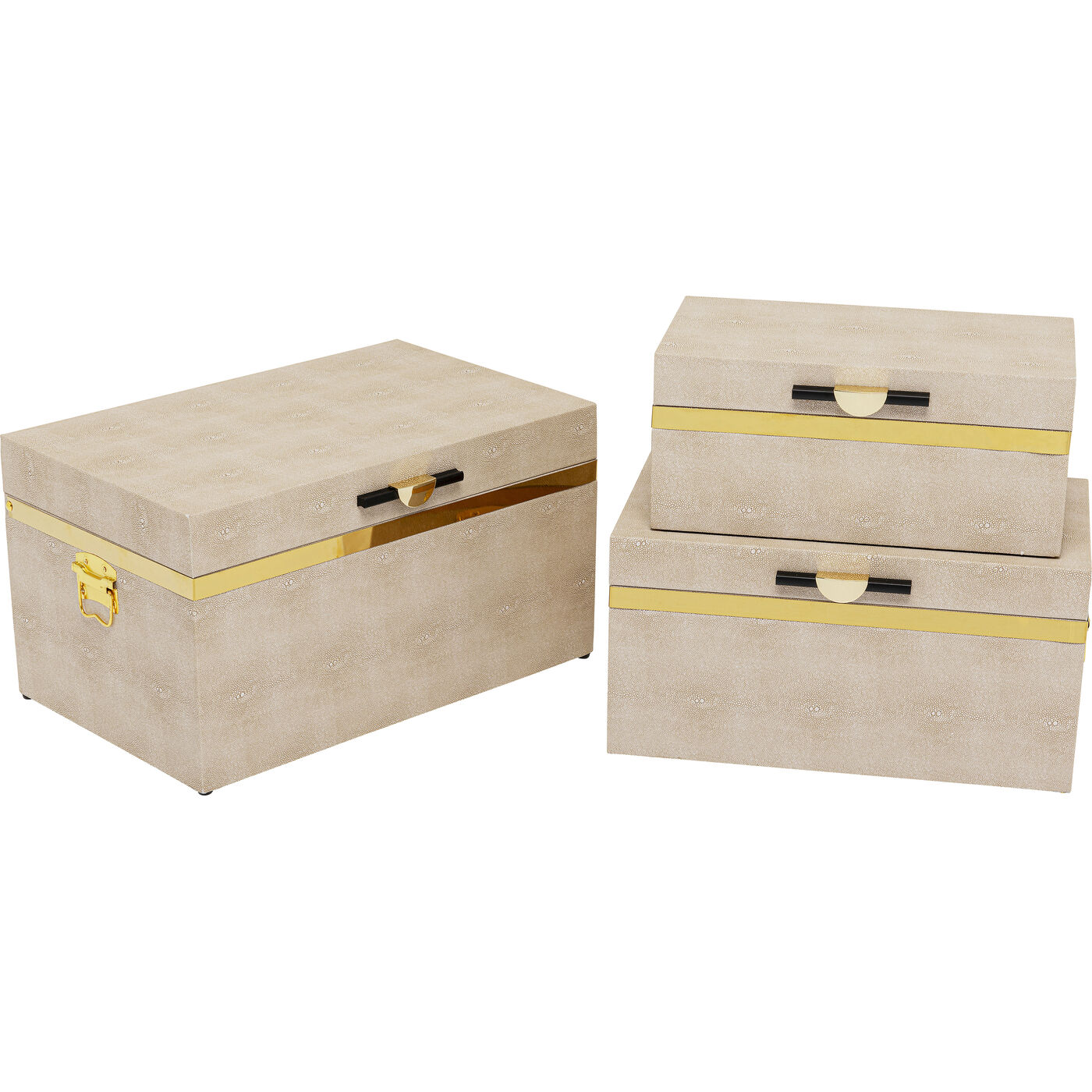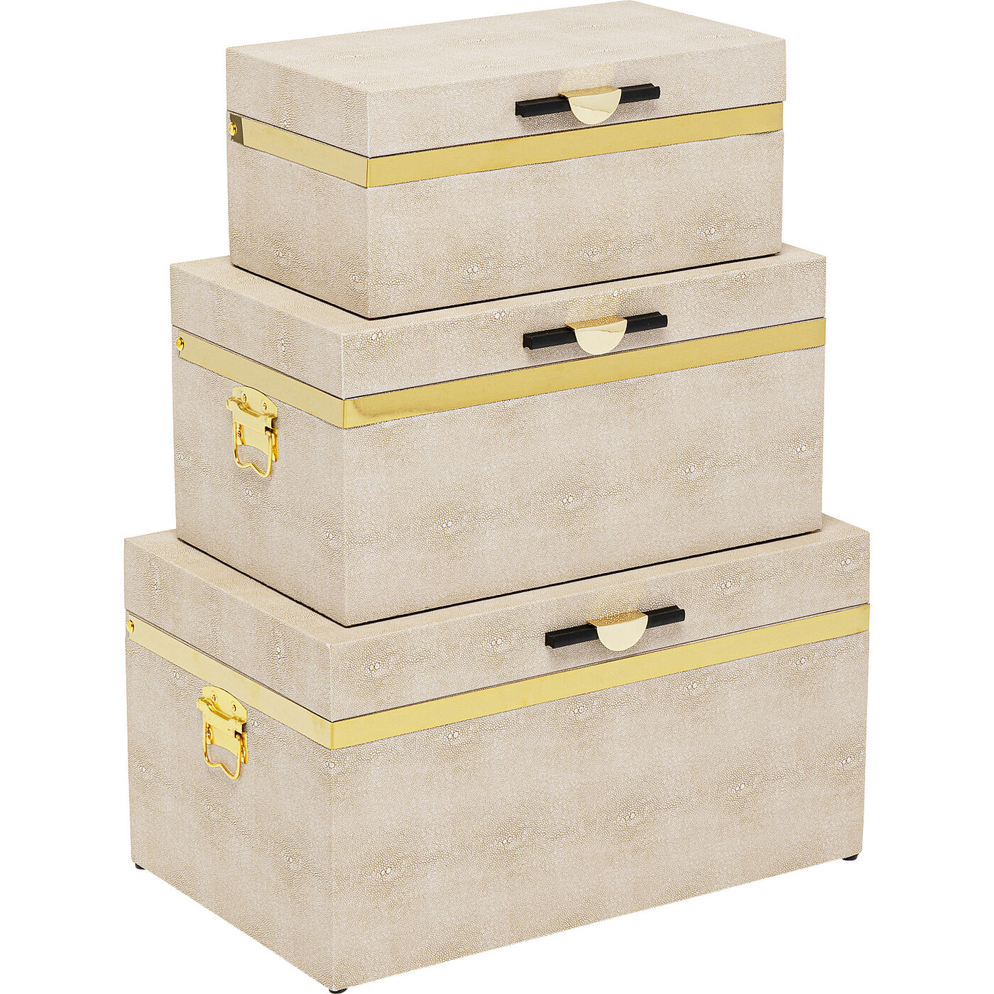 Ordnungskisten sind die ideale Lösung, um Ihrem Zuhause einen aufgeräumten Look zu verleihen. Sie verstauen Schmuck oder Wäsche im Schlafzimmer, Decken oder Kissen im Wohnzimmer oder Schals und Mützen im Flur. Wir von KARE haben den Ordnungshelfern ein schickes Outfit verpasst, so dass sie zu einem Schmuckstück im Raum werden. Mit ihren klappbaren Deckeln, dem goldfarbenen Griffen und den seitlichen Tragegriffen bei den beiden großen Boxen sind diese Ordnungshüter auch noch rundum funktional.