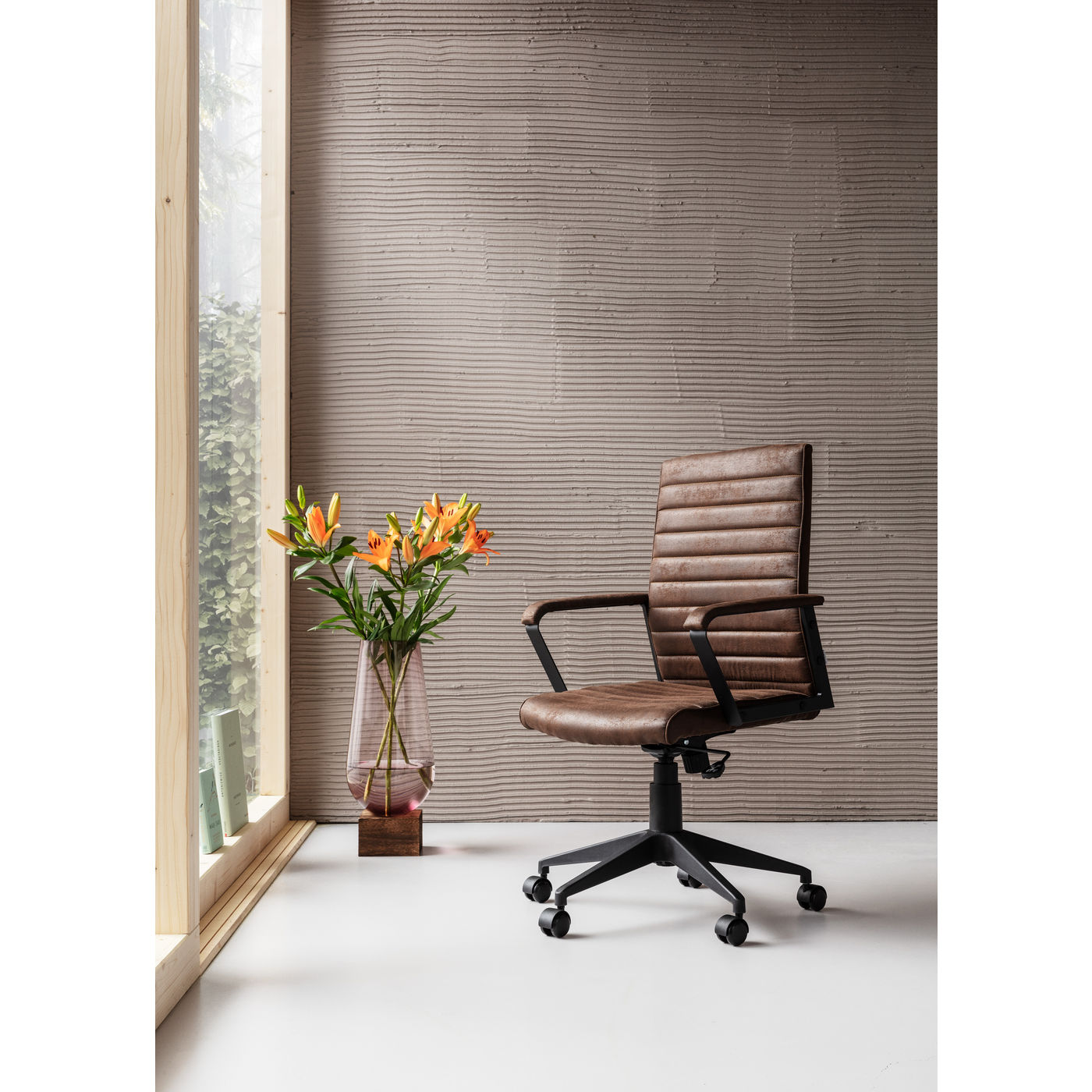 Bitte mal drehen! Der gepolsterte Bürodrehstuhl Labora Braun überzeugt mit seinen Funktionen: drehbar, kippbar und höhenverstellbar. Labora bietet außerdem eine ergonomische Rückenlehne, zeitlos schönes Design und den strapazierfähigen Bezug im Vintageleder Look. Der Widerstand des Kipp-Mechanismus der Rückenlehne lässt sich ganz individuell an die Bedürfnisses Ihres Körpers anpassen. Der schicke Büro-Liebling kommt auf fünf hochwertigen Rollen daher. Mit diesem Bürostuhl macht die Arbeit gleich viel mehr Spaß! Labora gibt es in vielen Varianten im Shop.