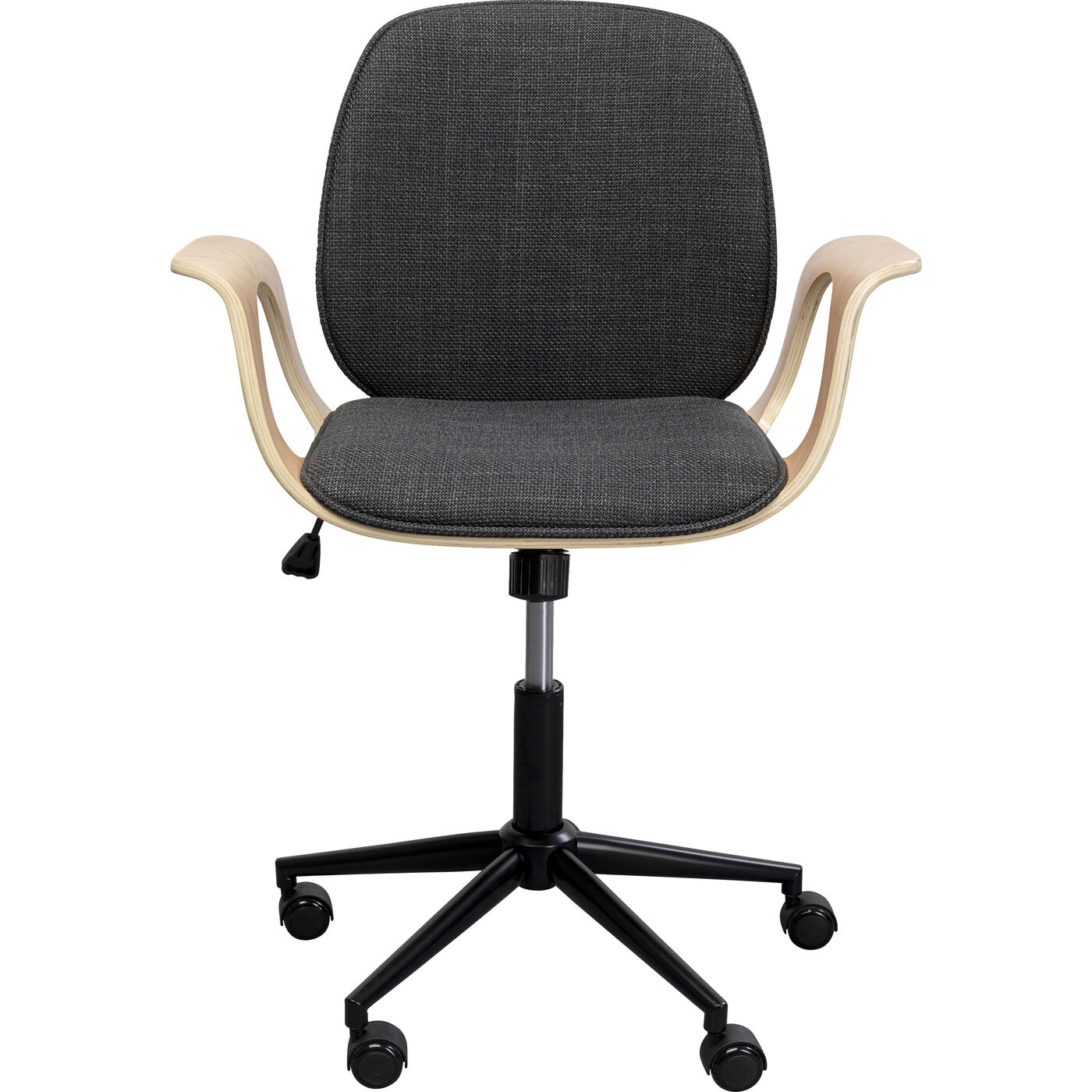 Dieser Bürostuhl verbindet skandinavische Klarheit mit urbaner Eleganz – ein echtes Statement im Arbeitsumfeld. Die Sitzschale aus dampfgebogenem Pappel-Massivholz verleiht dem Stuhl eine natürliche Wärme, während der melierte Stoffbezug in Grau eine moderne Note setzt. Das matt schwarze Metallgestell sorgt für Stabilität und zeitlose Ästhetik. Ideal für Home-Offices oder kreative Arbeitsräume, fügt sich dieser Stuhl nahtlos in verschiedene Einrichtungsstile ein. Kombiniert mit einem minimalistischen Schreibtisch und einer Stehleuchte im Industrial-Look entsteht ein harmonisches Gesamtbild, das sowohl funktional als auch stilvoll ist. Ein Bürostuhl, der nicht nur Komfort bietet, sondern auch das Raumdesign bereichert.