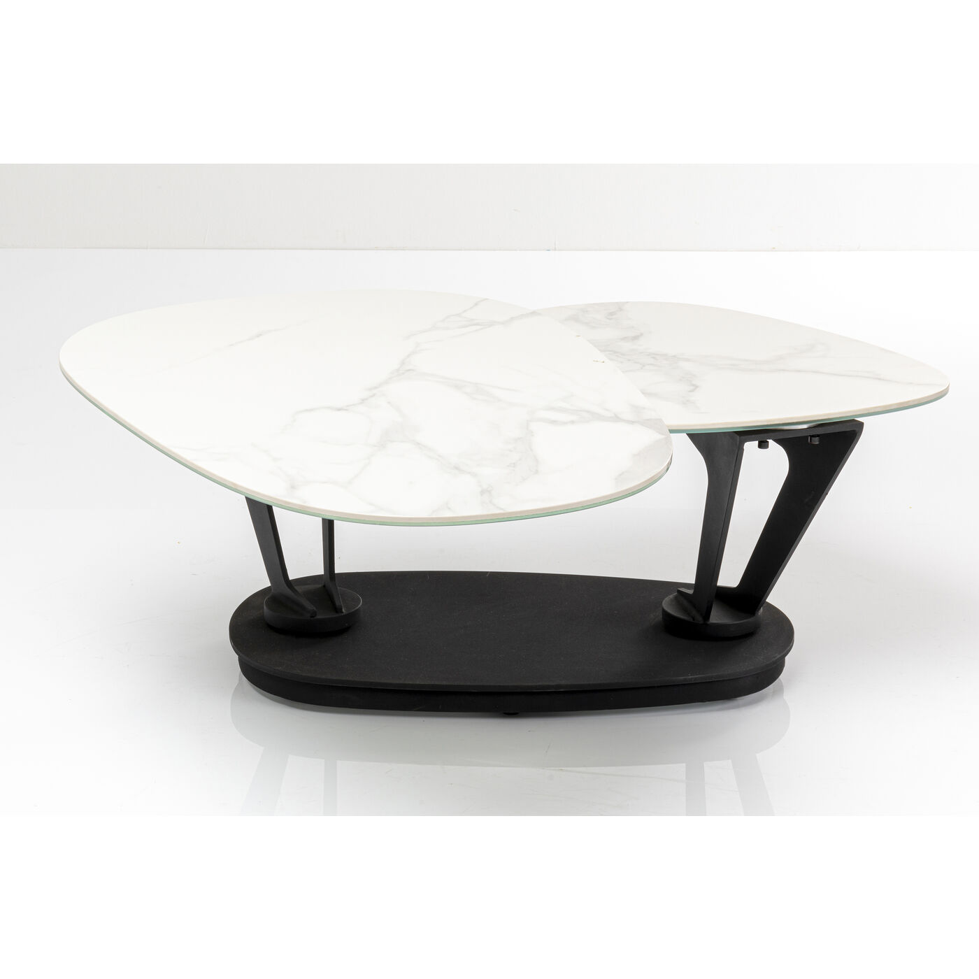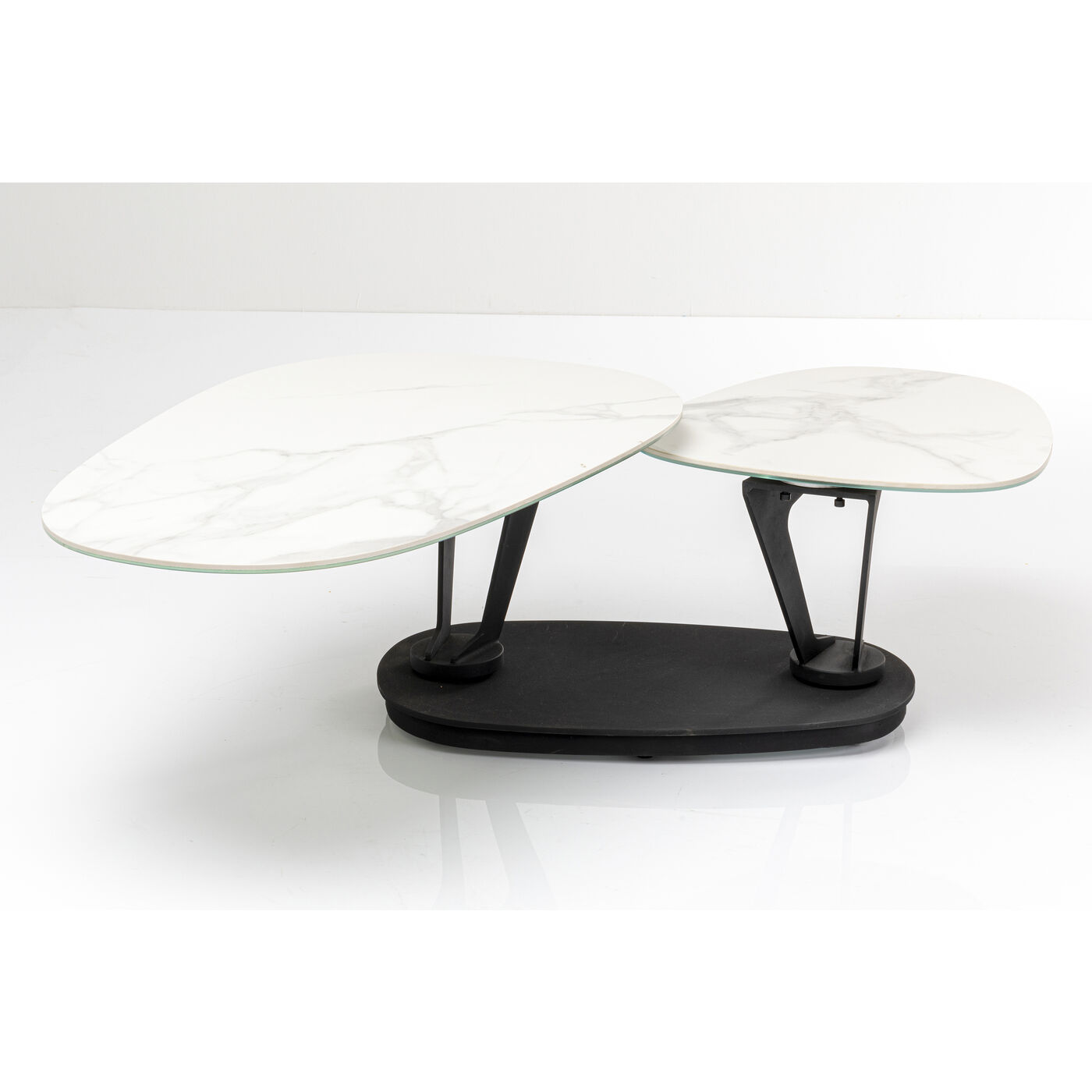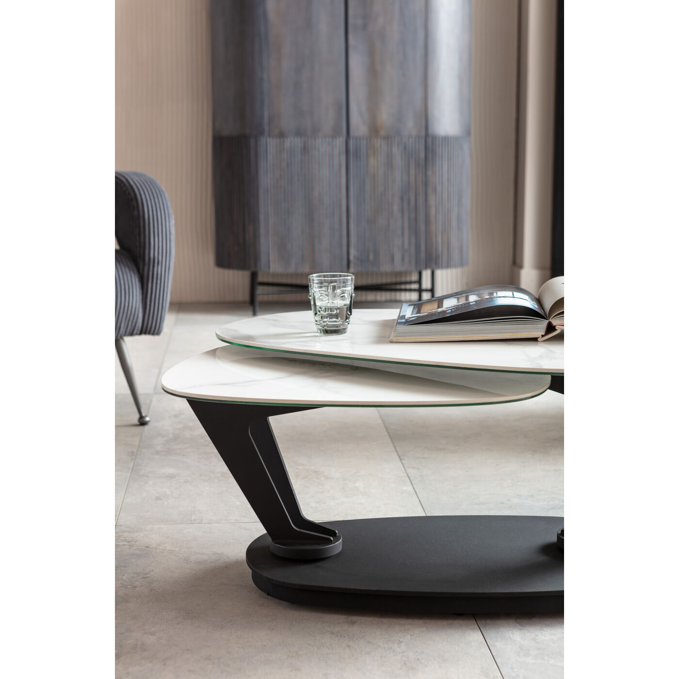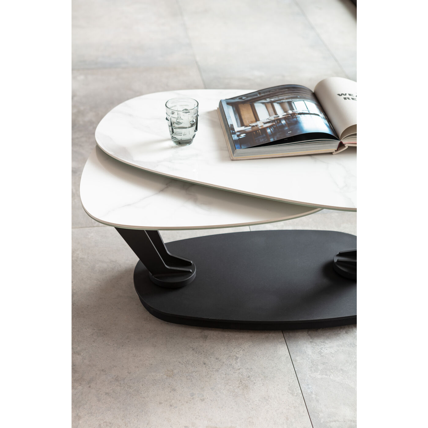 Diese Situation kennen Sie vielleicht: Sie machen es sich auf dem Sofa gemütlich, mal sitzend, mal liegend. Aber irgendwie ist der Sofatisch nicht in der richtigen Reichweite. Statt Tische rücken bietet der Wohnzimmertisch Franklin jetzt eine praktische und stilvolle Lösung. Mit einem Griff können Sie die Tischplatten synchron drehen, so dass Sie ihn bequem als Ablage nutzen können. Möglich macht das eine Mechanik, die sich im Sockel des Wohnzimmertisches verbirgt. Die Designidee zu Franklin ist nicht der einzige Vorteil des edlen Couchtisches. Sie erwerben ein Möbel, das aus hochwertigen und beständigen Materialien gefertigt und darum wertbeständig ist. Sein Stil ist modern und zeitlos und wird auch zur nächsten Couch oder Wohnlandschaft passen.