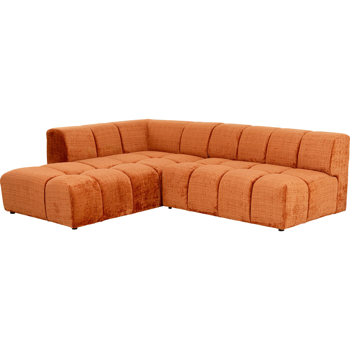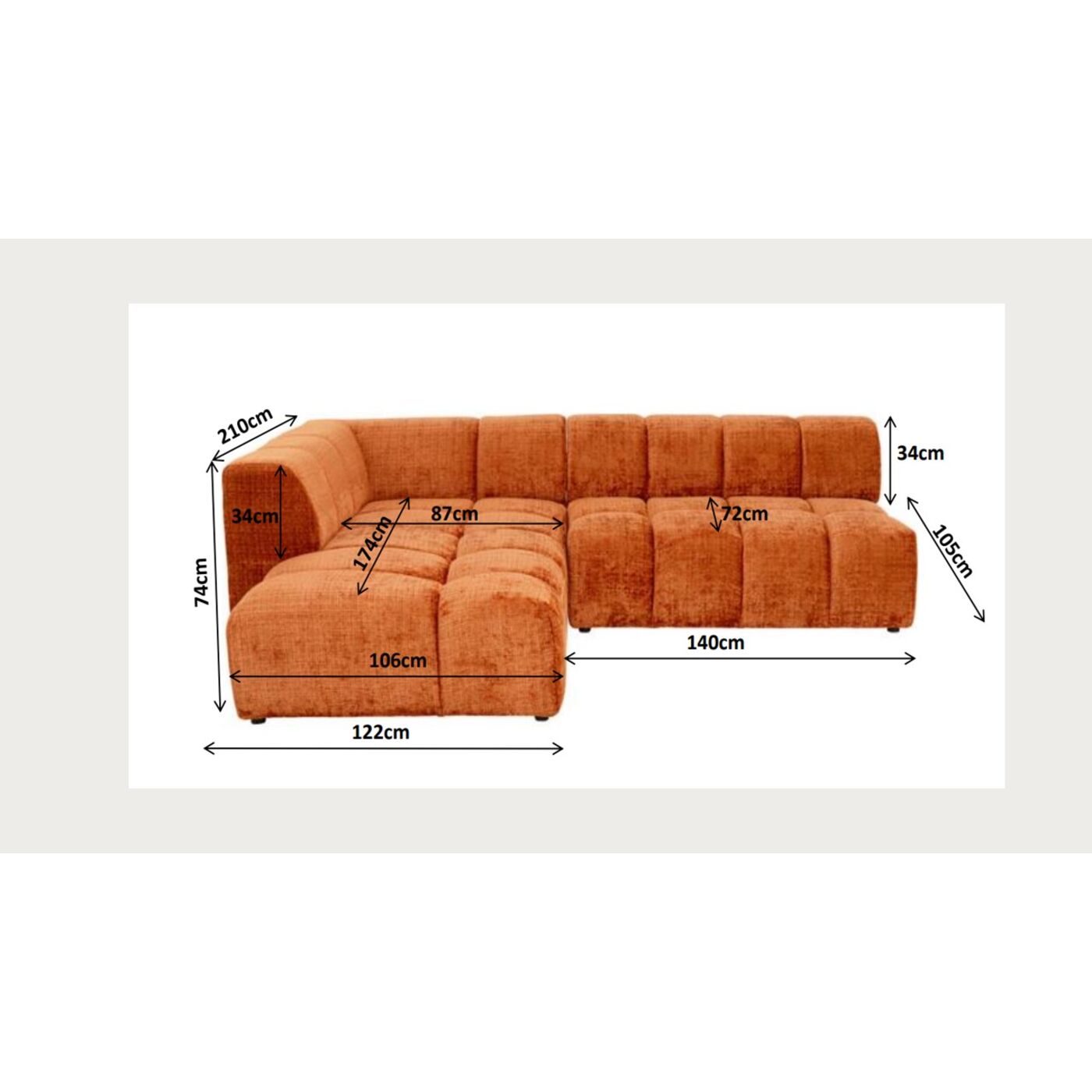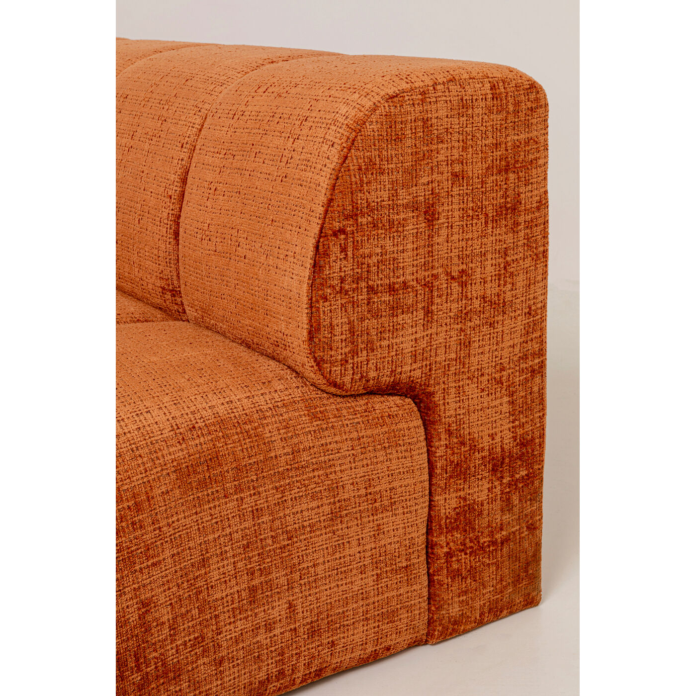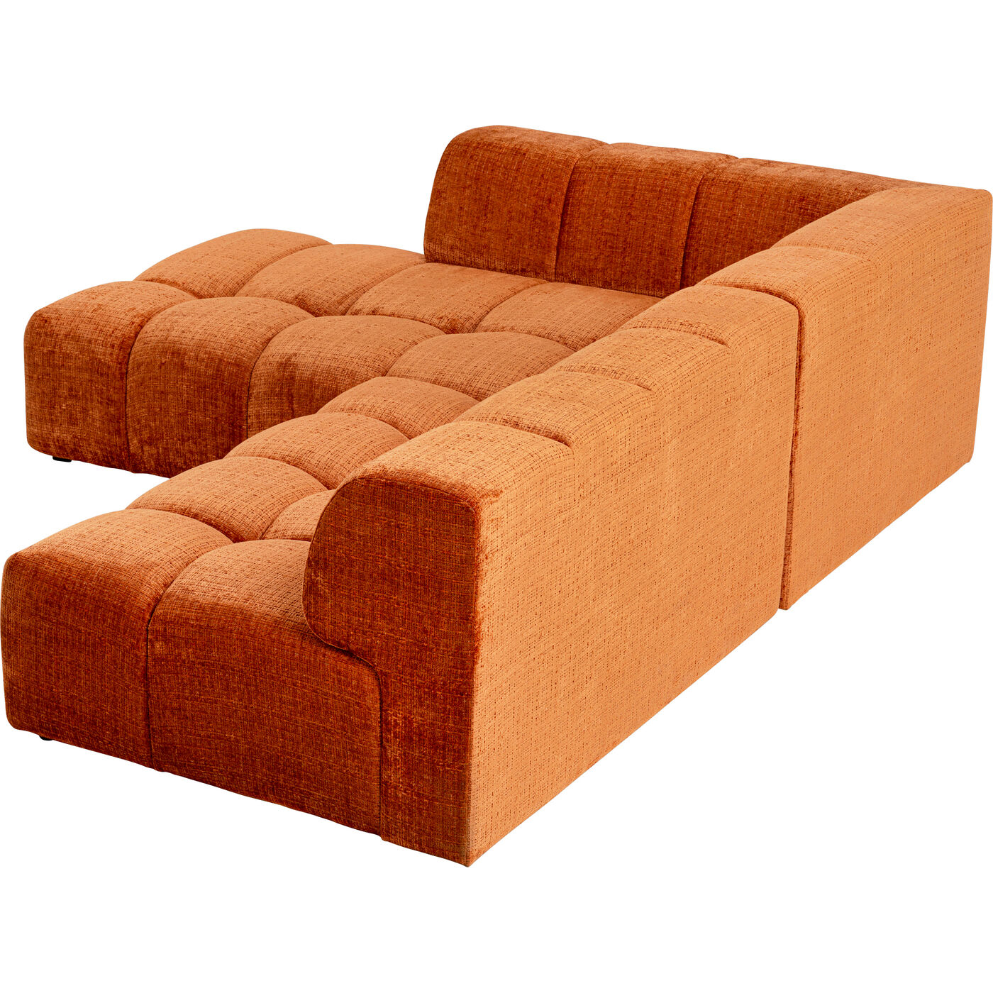 Mit seinem warmen Rostton, der klaren Linienführung und dem grafischen Design in markanter Würfeloptik bringt dieses Ecksofa moderne Raffinesse mit einem Hauch Retro-Charme ins Wohnzimmer. Der samtige Bezug sorgt für eine edle Haptik, während die Kombination aus weicher Polsterung, Nosagfederkern und elastischer Gurtaufhängung maximalen Sitzkomfort garantiert – perfekt für lange Filmabende oder entspannte Stunden mit Freunden. Als stilvoller Blickfang lässt sich das Sofa ideal mit goldenen Akzenten, gemusterten Kissen oder einem flauschigen Teppich kombinieren. Besonders harmonisch wirkt es in Verbindung mit natürlichen Materialien wie Holz, Leinen oder Rattan. Ein Designhighlight mit echtem Wohlfühlfaktor.